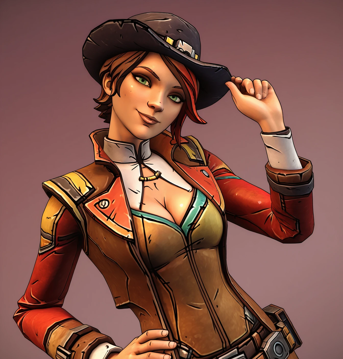 Fiona: (f10n4), 1girl, solo, medium breasts, short hair, brown hair, hat, closed mouth, green eyes, jacket, white shirt, (lips), black headwear, cleavage, brown vest, brown jacket, red jacket, open jacket, long sleeves, cyberpunk, multicolored hair, fiona (borderlands), red hair