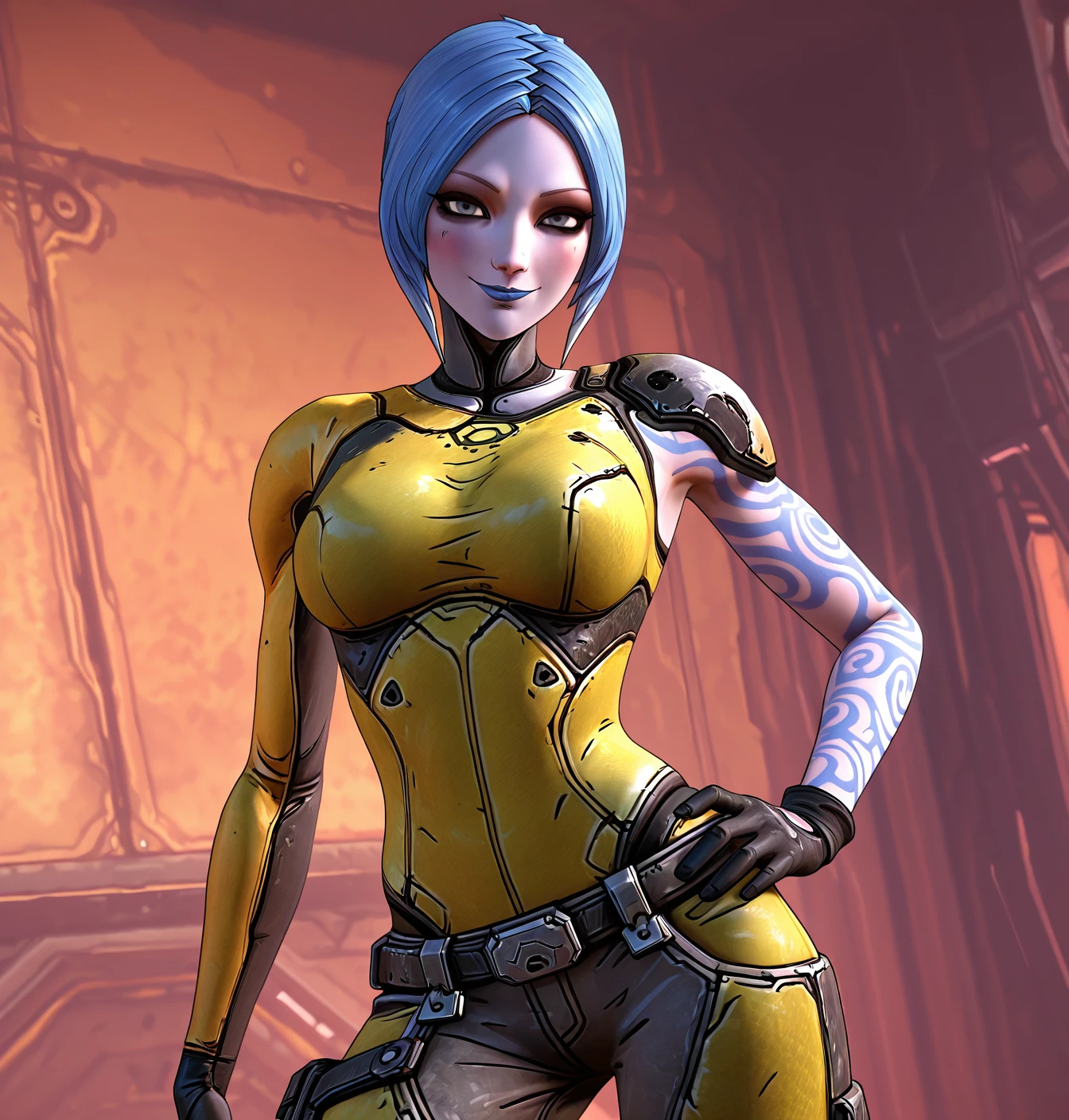 Maya: (maya \(borderlands\)), 1girl, grey eyes, solo, large breasts, short hair, black gloves, blue hair, parted hair, pants, belt, (lips), yellow bodysuit, blue lips, single sleeve, cyberpunk, slender, arm tattoo, black eyeliner, eyelashes, siren (borderlands), pale skin