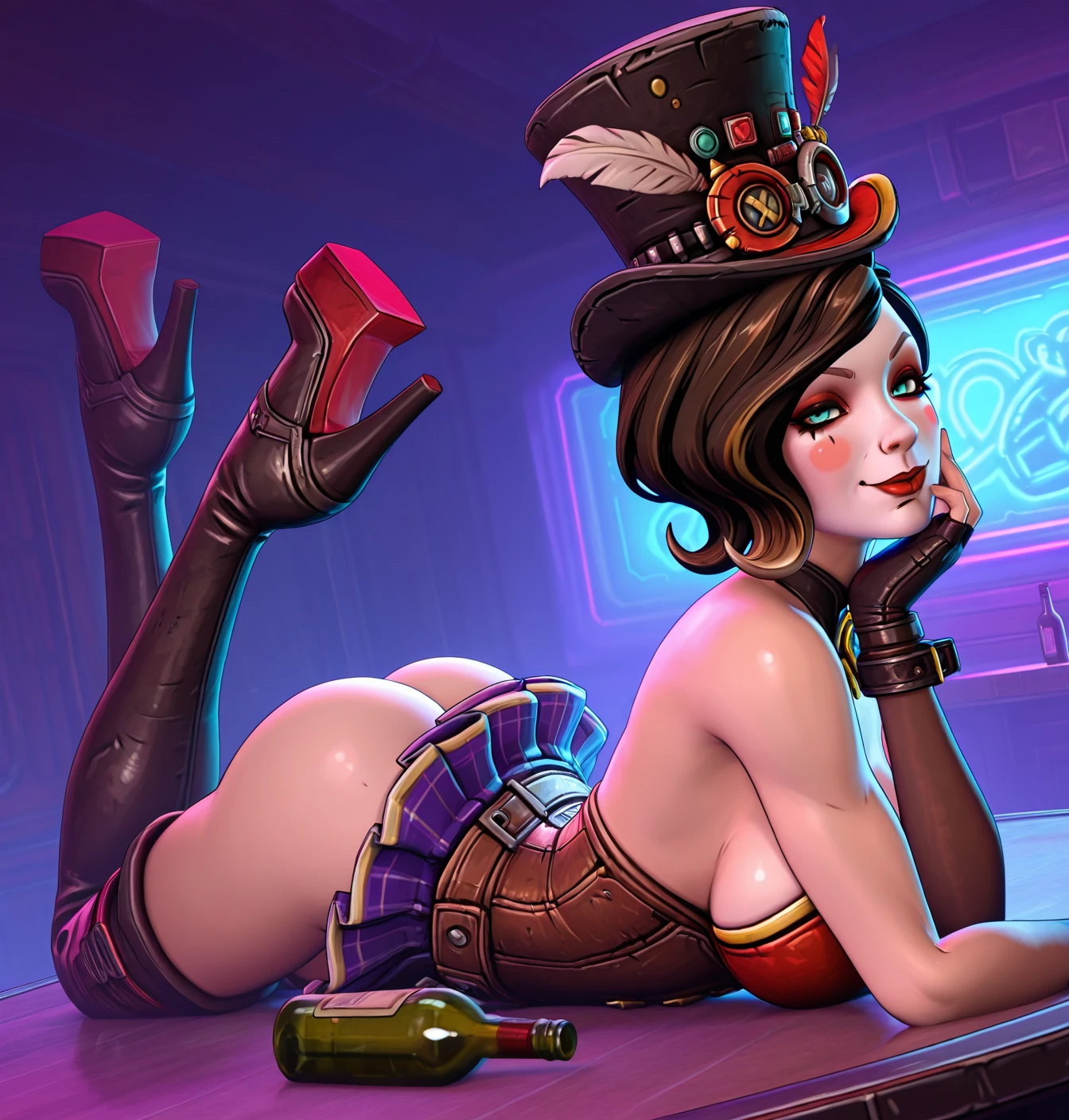 Mad Moxxi: (mad moxxi), 1girl, solo, aqua eyes, large breasts, short hair, skirt, brown hair, thighhighs, hat, bare shoulders, ass, thighs, boots, lying, fingerless gloves, blush stickers, high heels, (lips), makeup, thigh boots, lipstick, corset, high heel boots, top hat, nose, leather, platform footwear, leather boots, mole above mouth, black hair, heart, red lips, cyberpunk