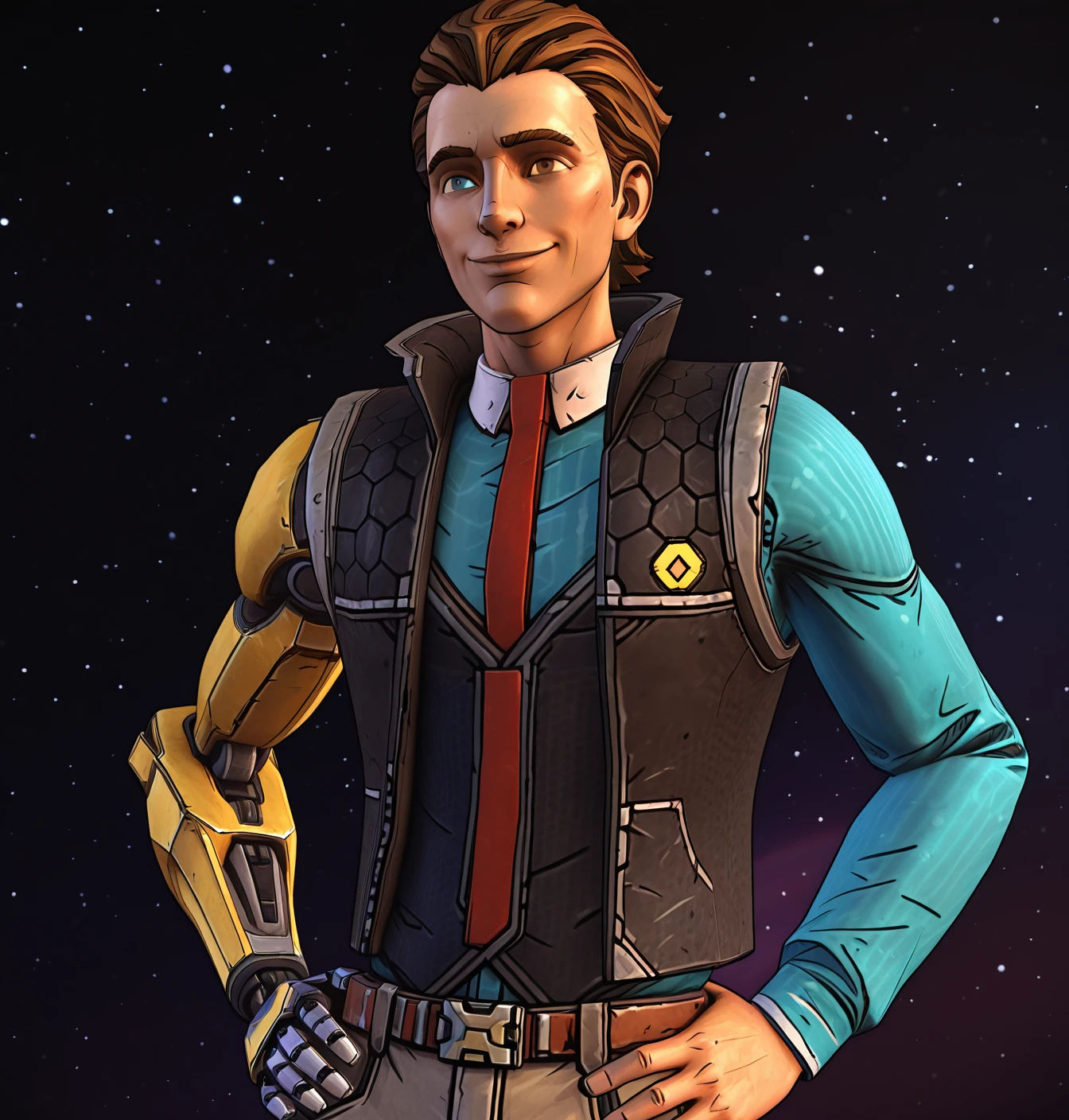 Rhys: (rh1s), 1boy, male focus, solo, blue eye, heterochromia, brown eye, shirt, brown hair, necktie, (lips), pants, belt, smile, blue shirt, black background, red necktie, black vest, open vest, long sleeve, (single mechanical arm), science fiction, cyberpunk, hair slicked back, manly