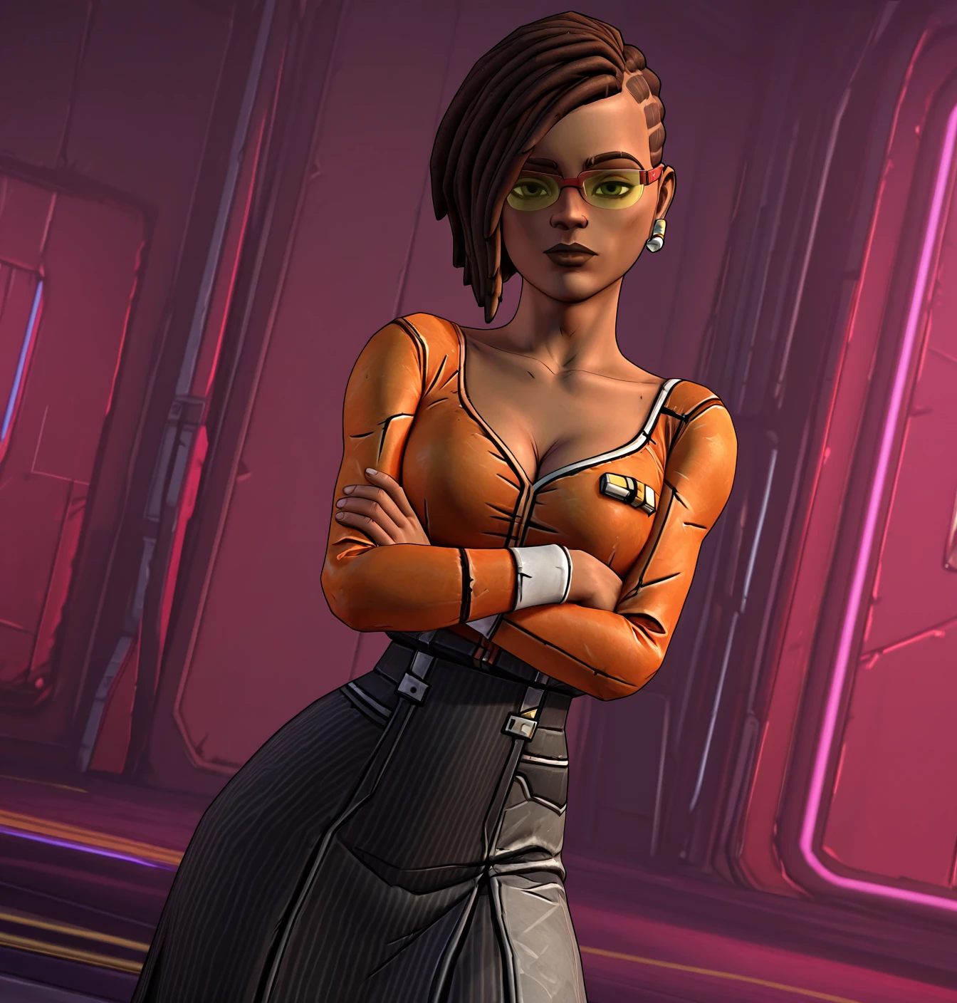 Yvette: (yv3tt3), 1girl, solo, medium breasts, brown eyes, short hair, skirt, brown hair, orange jacket, long sleeves, glasses, brown lips, black skirt, dark-skinned female, dark skin, earrings, tinted eyewear, yellow-tinted eyewear, green-tinted eyewear, dreadlocks, asymmetrical hair, long skirt, black skirt, grey skirt, collarbone, cleavage, cyberpunk, narrow waist, tight clothes