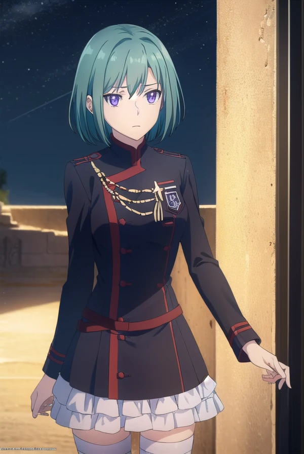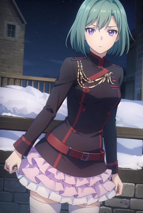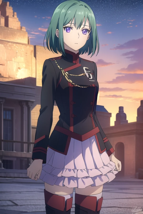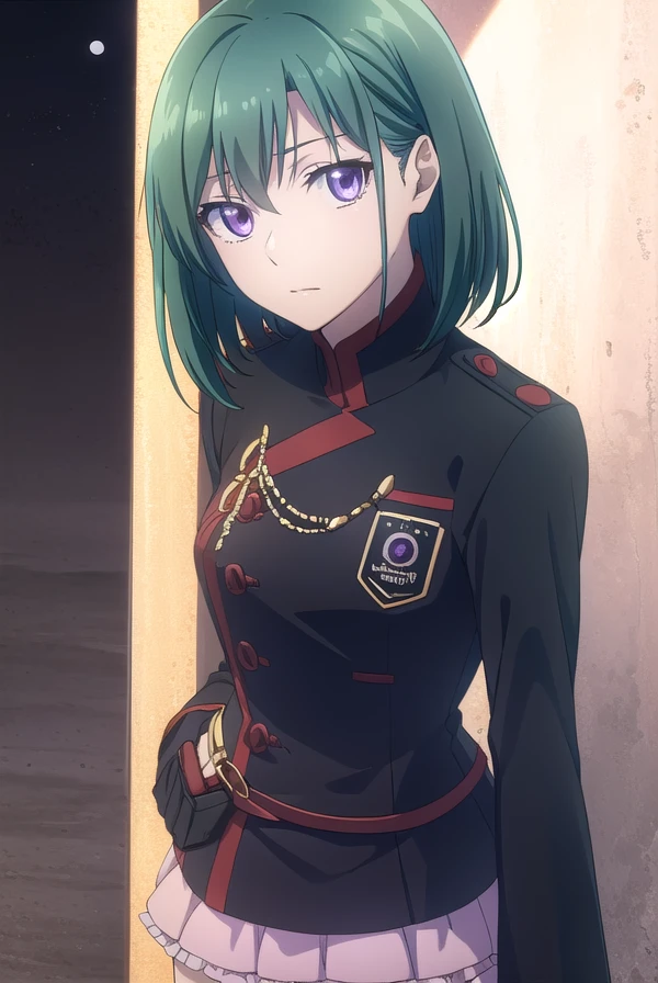 lenalee lee, bangs, hair between eyes, (purple eyes:1.1), green hair,