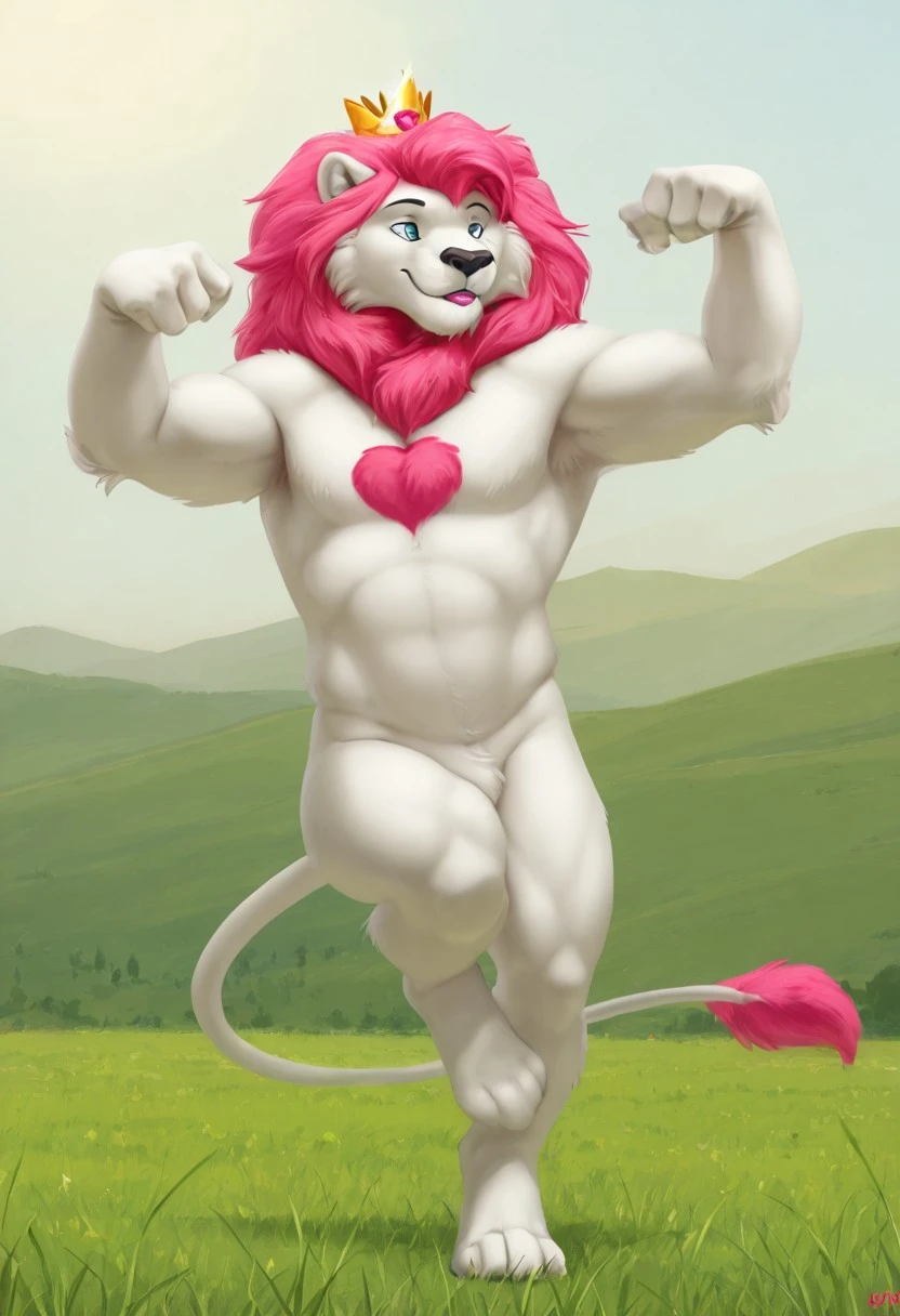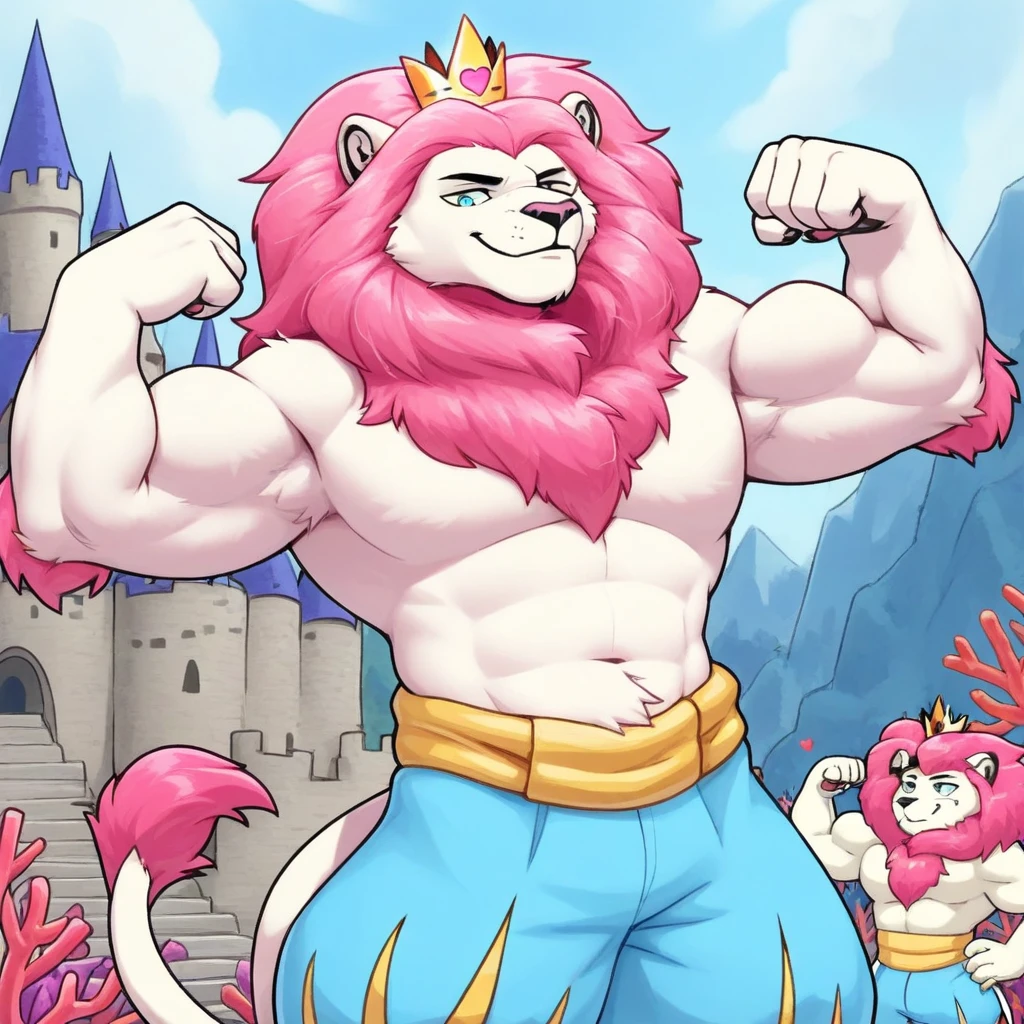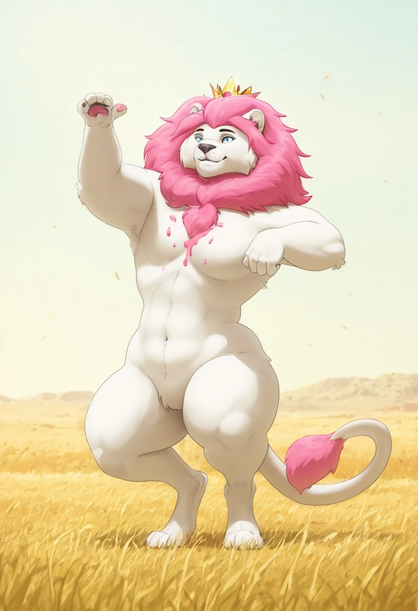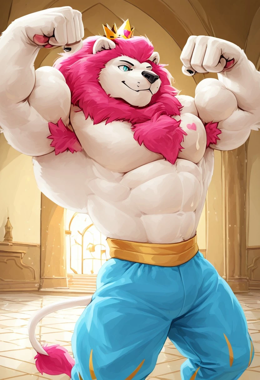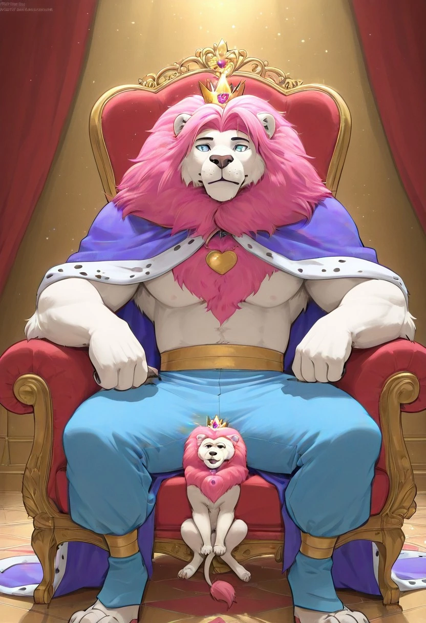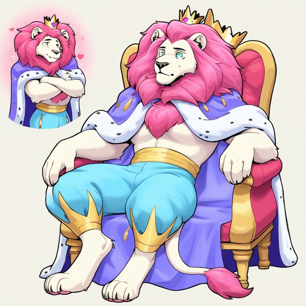 Recommended words: Lion, furry, anthro, cute, male, cream-colored fur, turquoise eyes, snugglelion, pink mane, pink tuft on chest, pink tuft on tail, golden crown with a heart, puffy light blue pants, yellow cummerbund, lavender royal cape