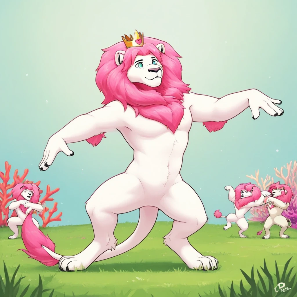 Recommended words: Lion, furry, anthro, cute, male, cream-colored fur, turquoise eyes, snugglelion, pink mane, pink tuft on , pink tuft on tail, golden crown with a heart, puffy light blue pants, yellow cummerbund, lavender royal cape,