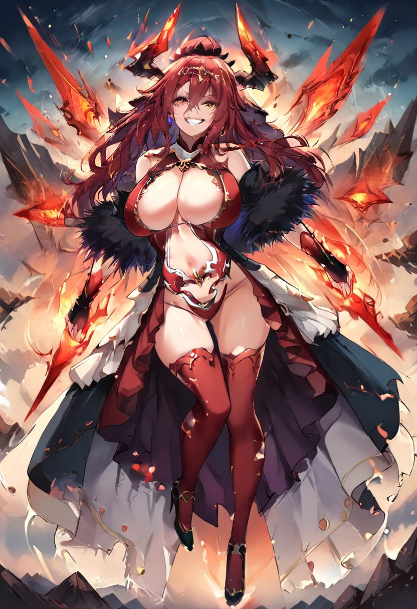 Diadora, diadora_demon_outfit, tiara, ponytail, red hair, long hair, voluptuous figure, giant breasts, diadora_horns, diadora_ring,