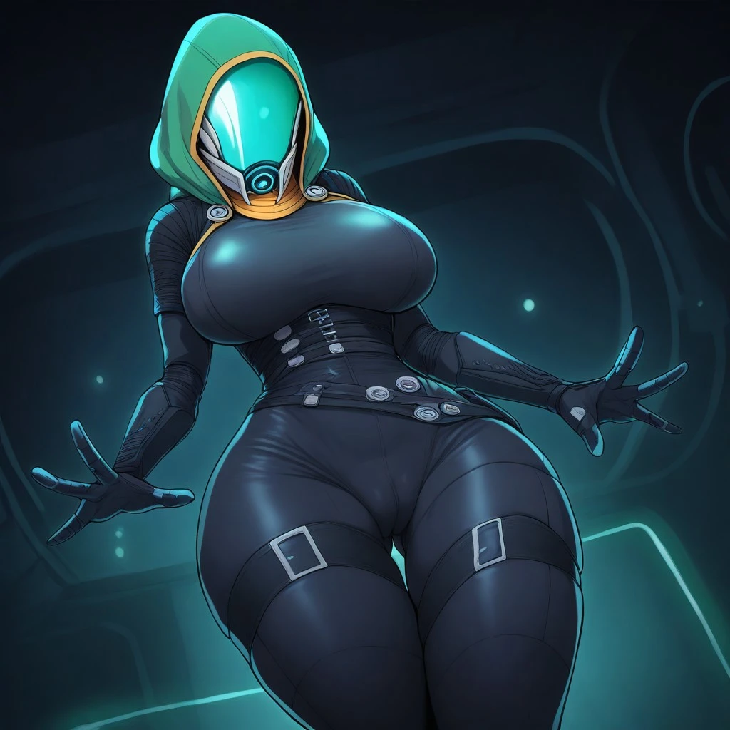 Using around 0.8 strength seems to be just right. Can create shots from the rear without prompting for them and end up with the head turned a full 180. Prompting complimenting colors for the visor and any cloth such as the hood and suit details is... Tricky. You'll have to play around with positives, negatives and weighting of those tags.