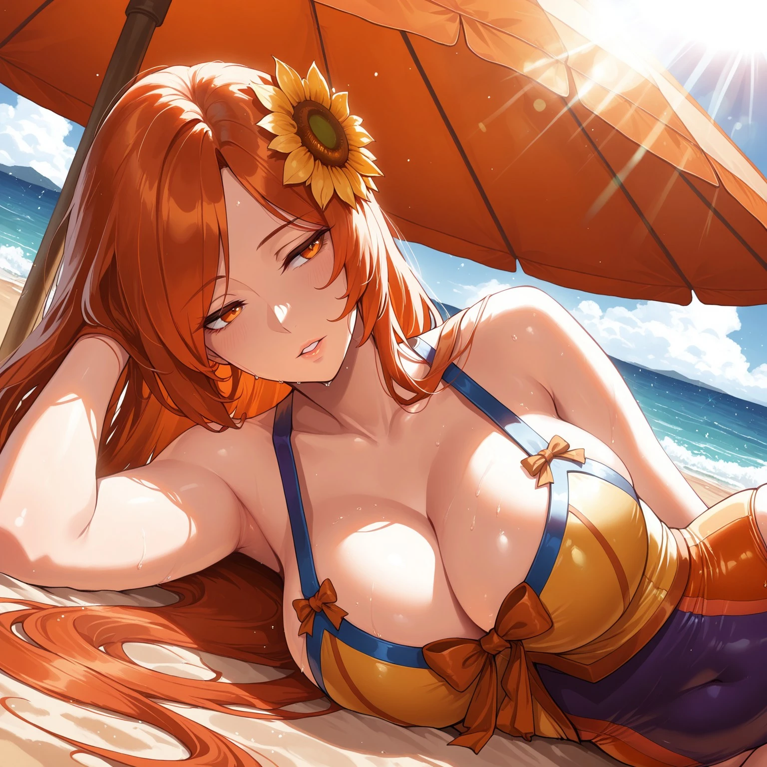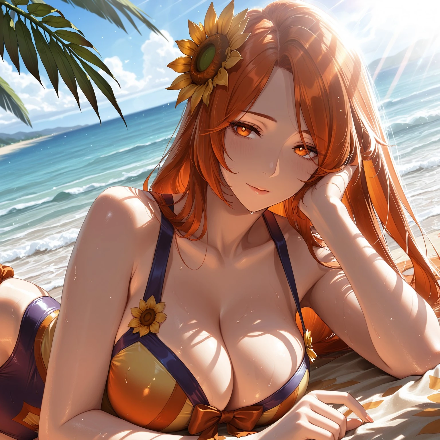 PPleona,hair ornament,long hair,orange hair,swimsuit,sunflower,cleavage,mature female,multicolored swimsuit,orange eyes,
