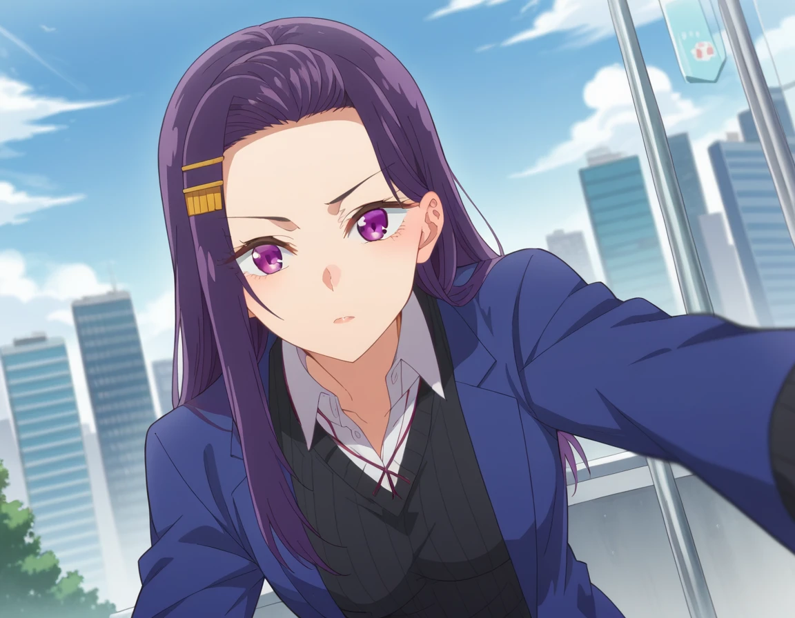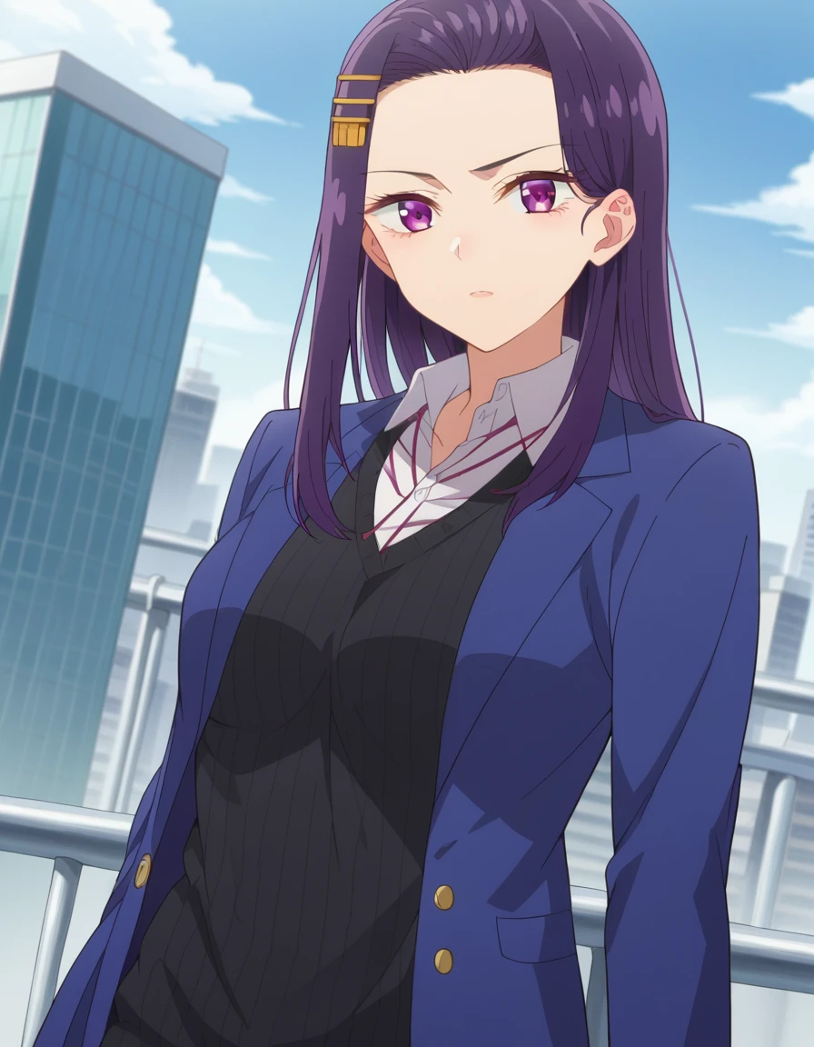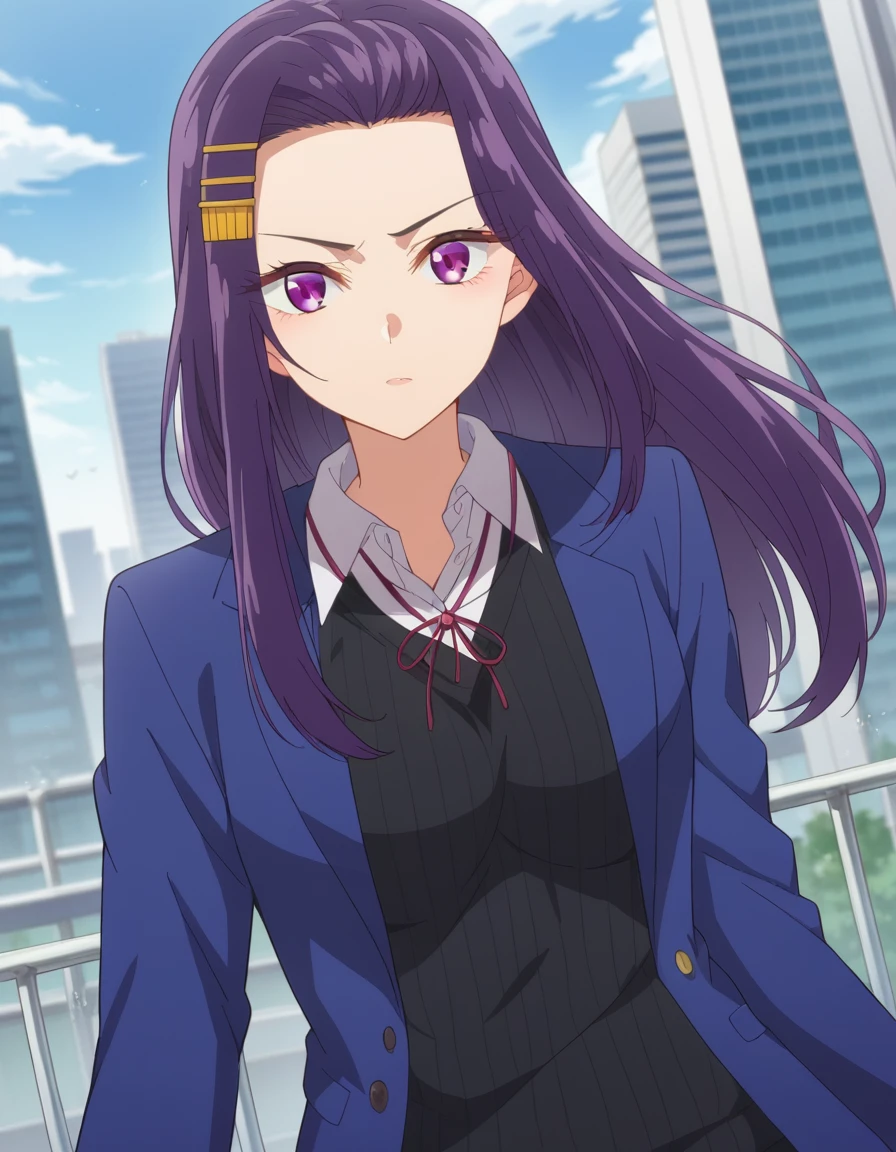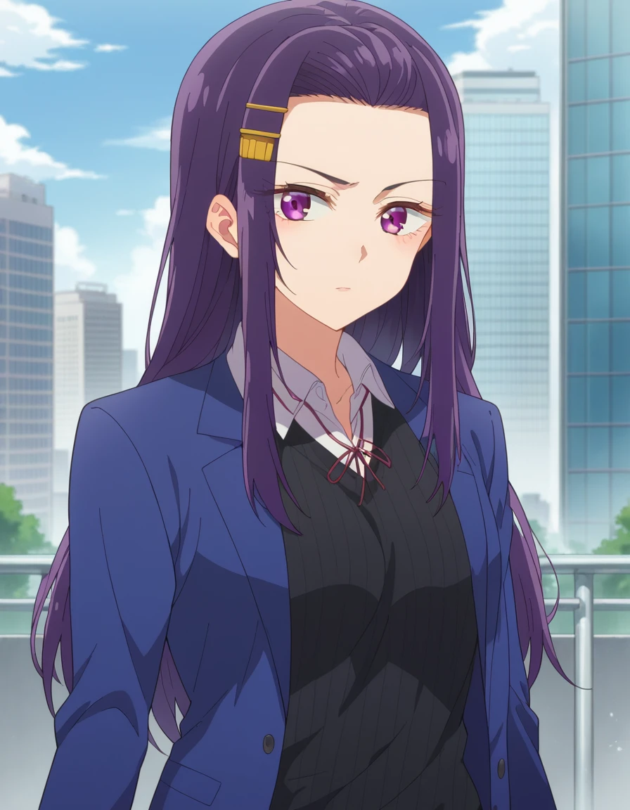 sayuri akino, long hair, hair ornament, hairclip, purple hair, purple eyes, forehead,