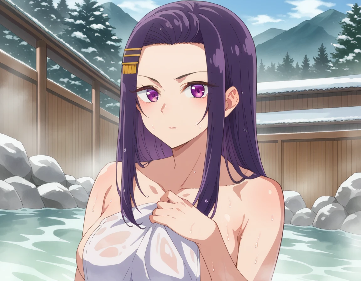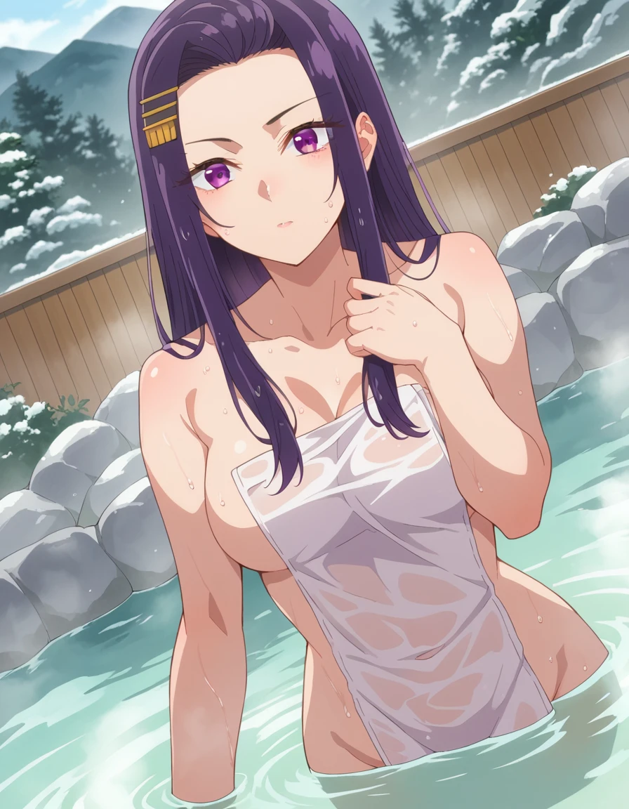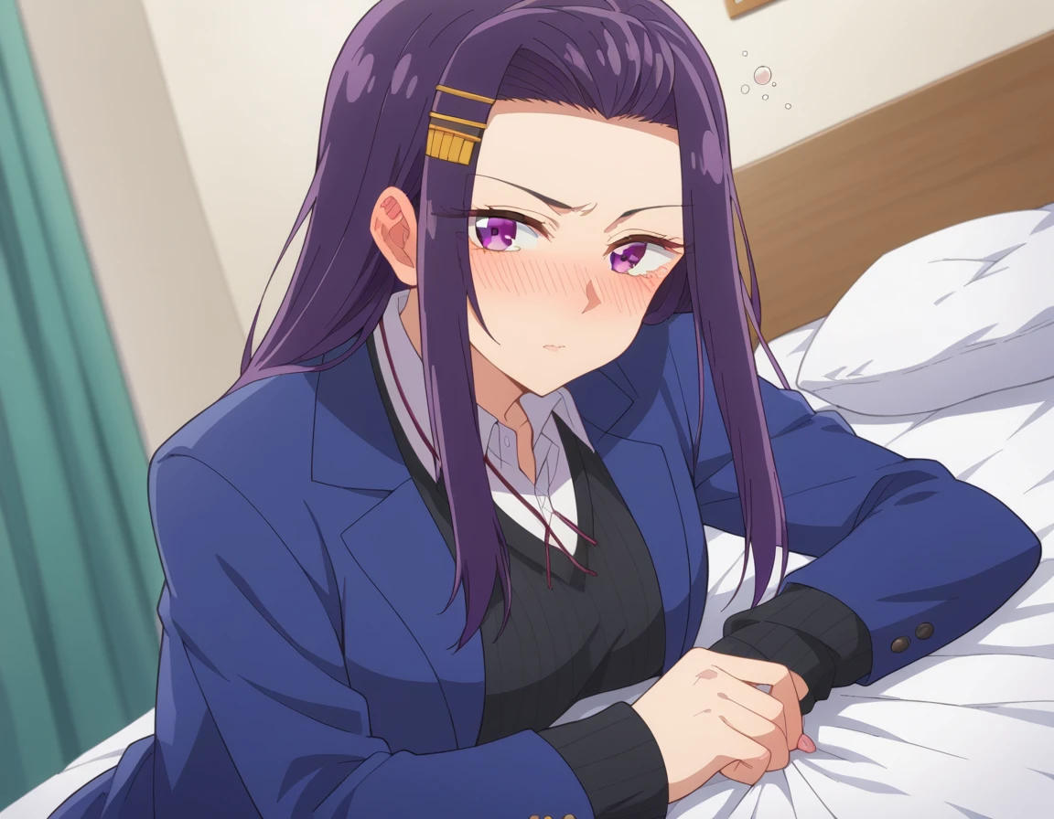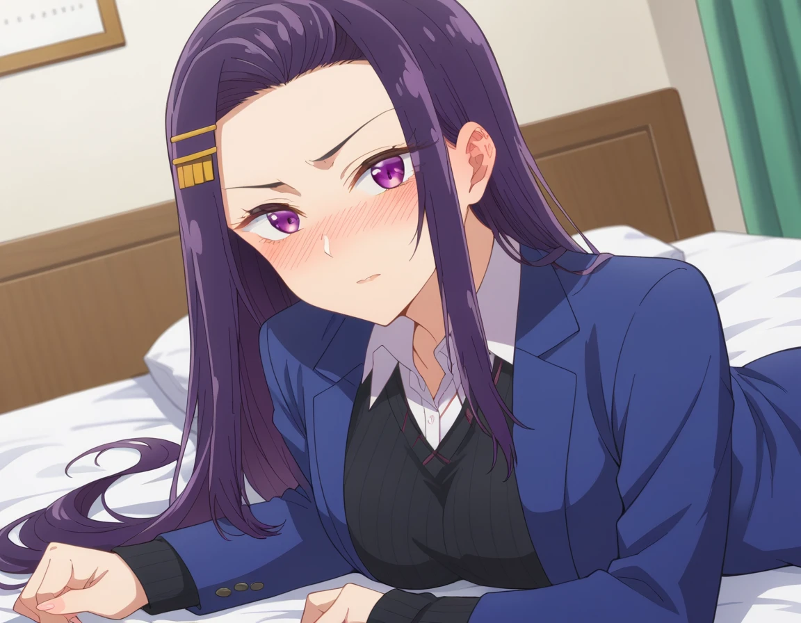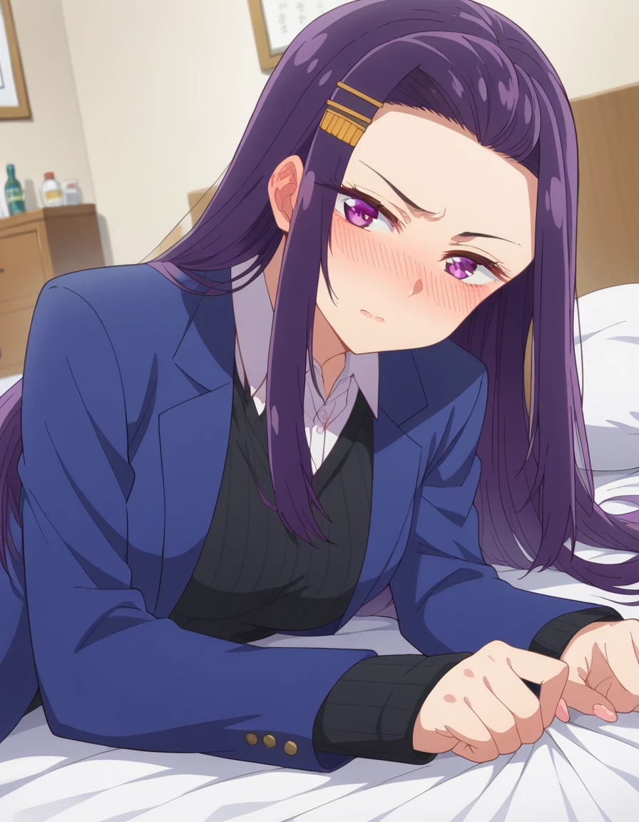 sayuri akino, long hair, hair ornament, hairclip, purple hair, purple eyes, forehead,
