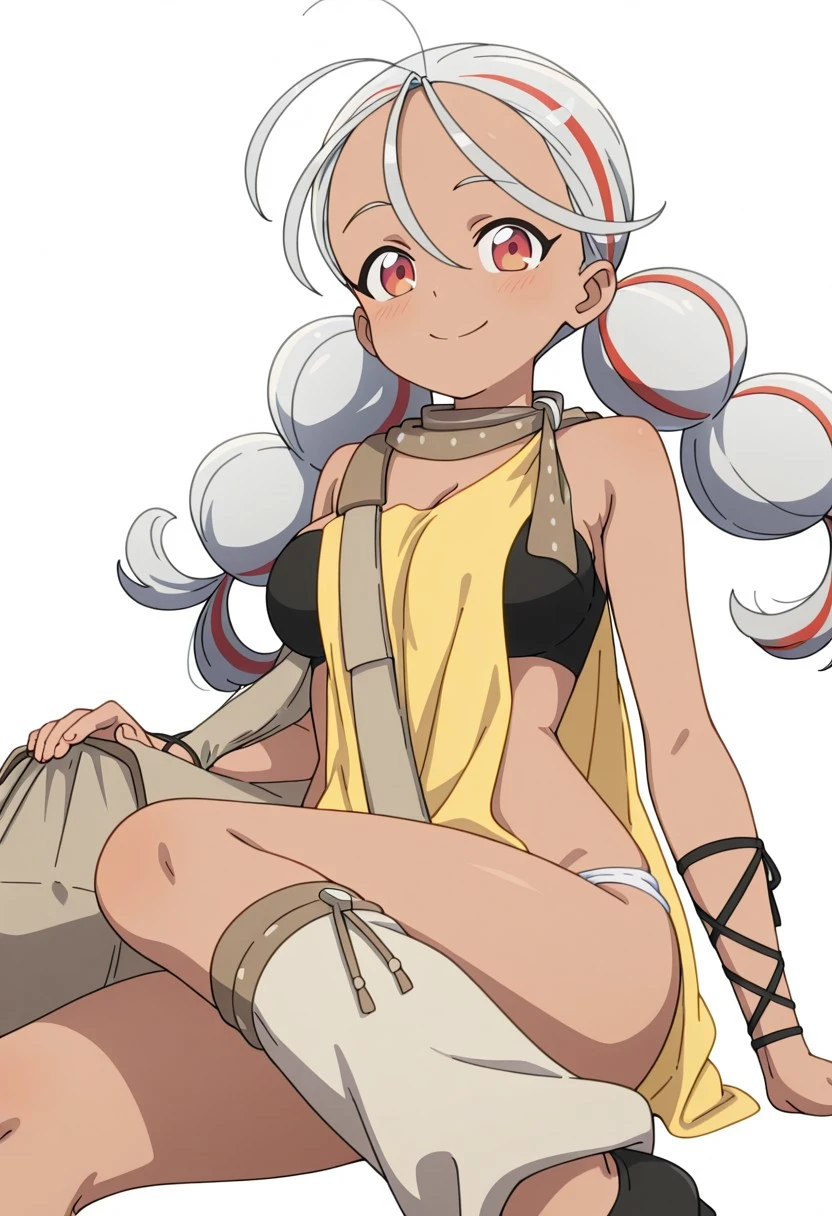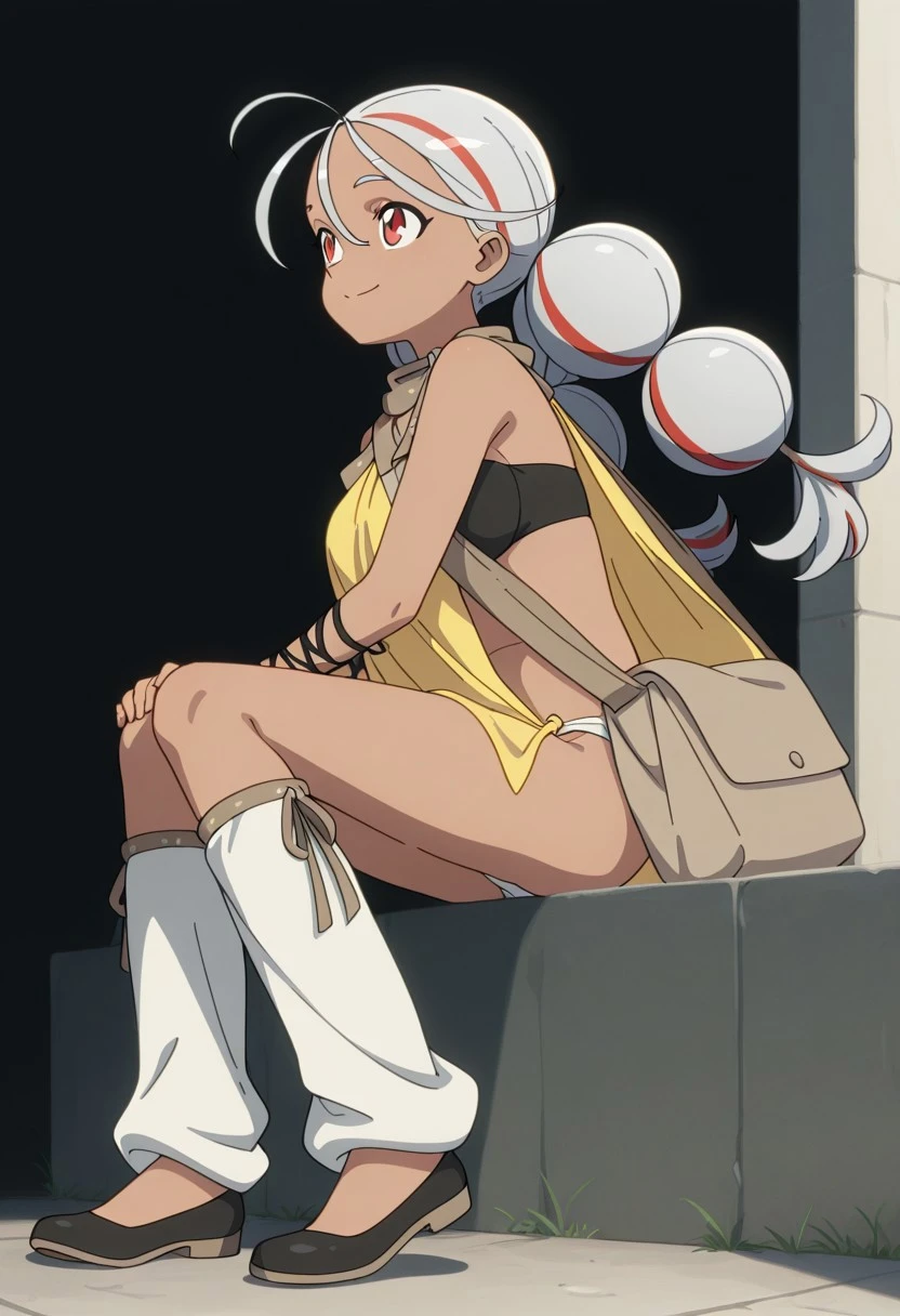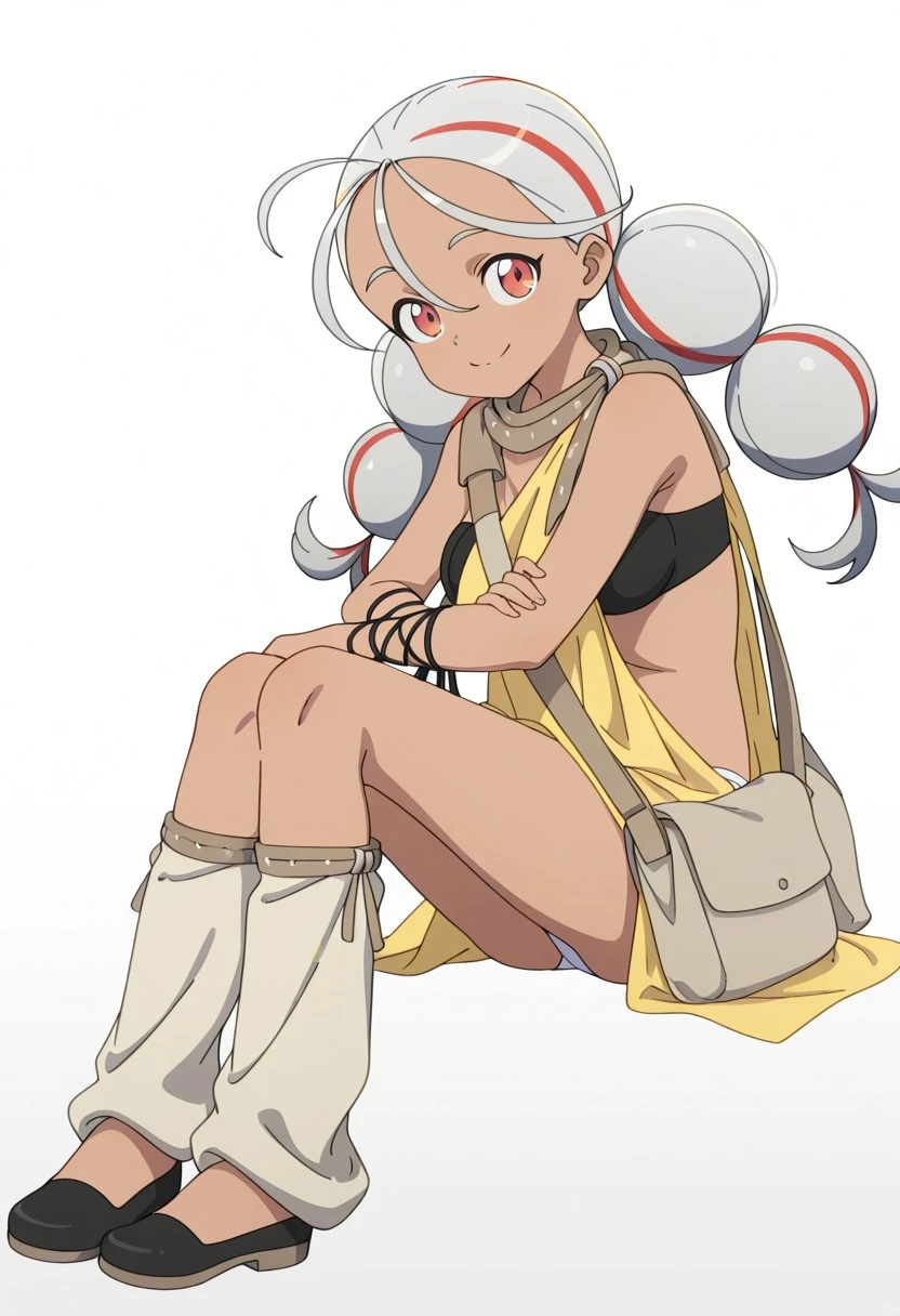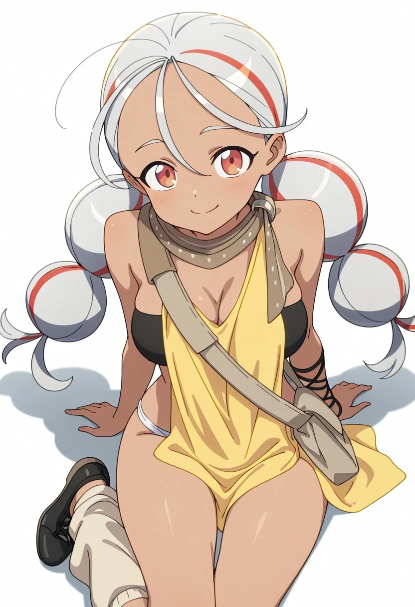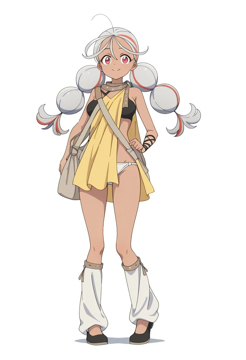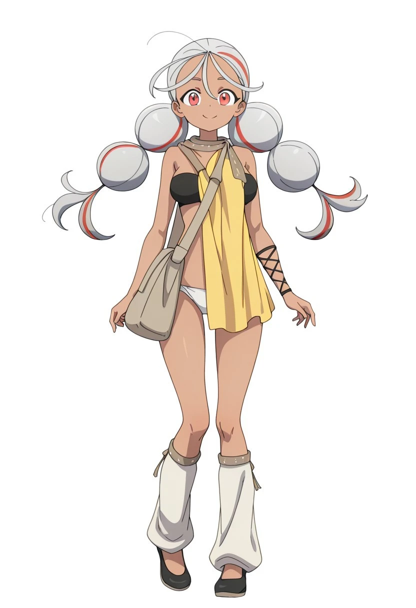 brown skin, reddish-orange eyes, multicolored hair, twin bubble ponytails, silver hair with red streaks, petite, medium breasts, scarf, scarf-connected yellow fabric, arm-tied cloth, strapped bag, black lace-up bra, white panties, black arm wraps, leg warmers, black slip on shoes,