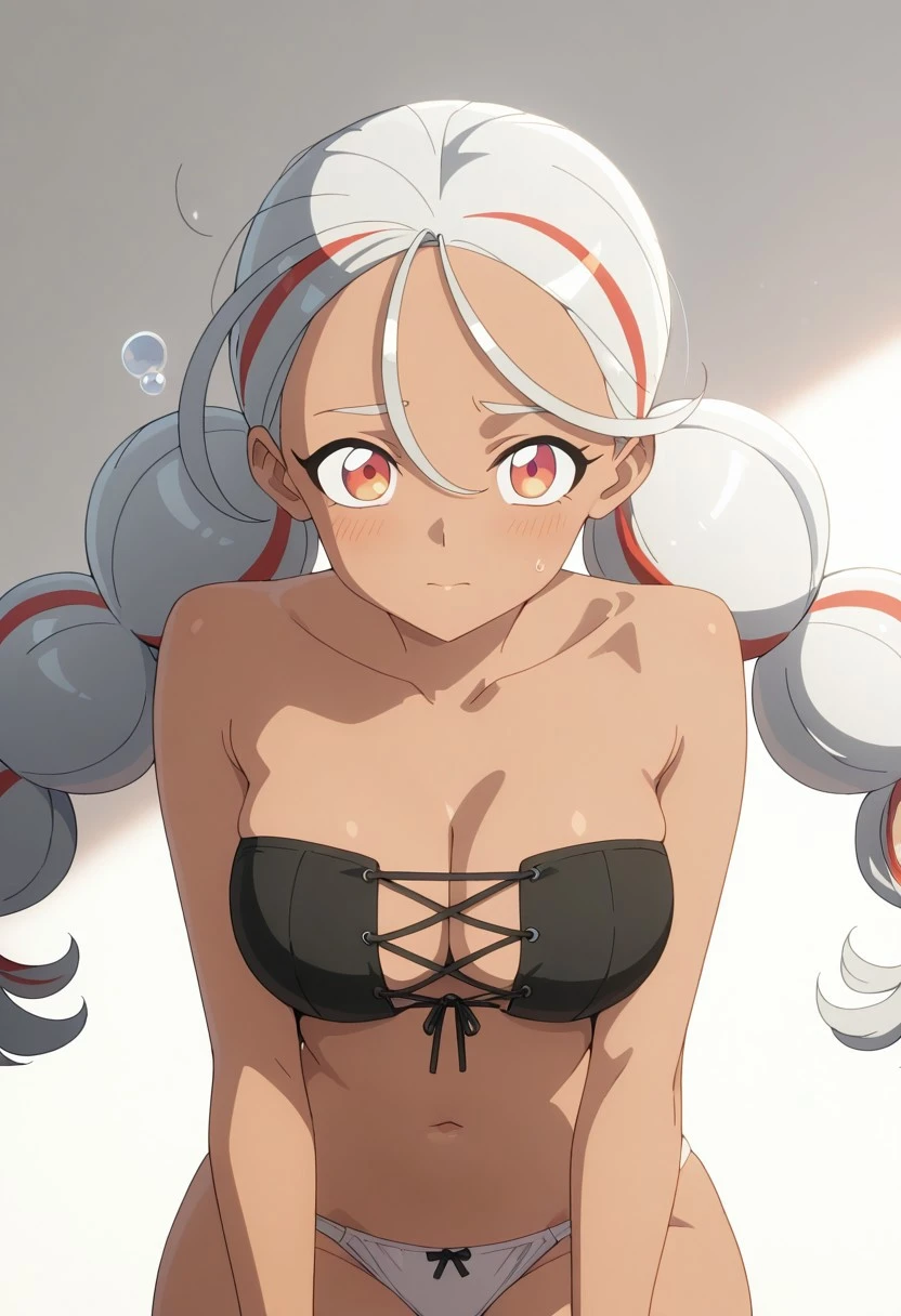 brown skin, reddish-orange eyes, multicolored hair, twin bubble ponytails, silver hair with red streaks, black lace-up bra, white panties,