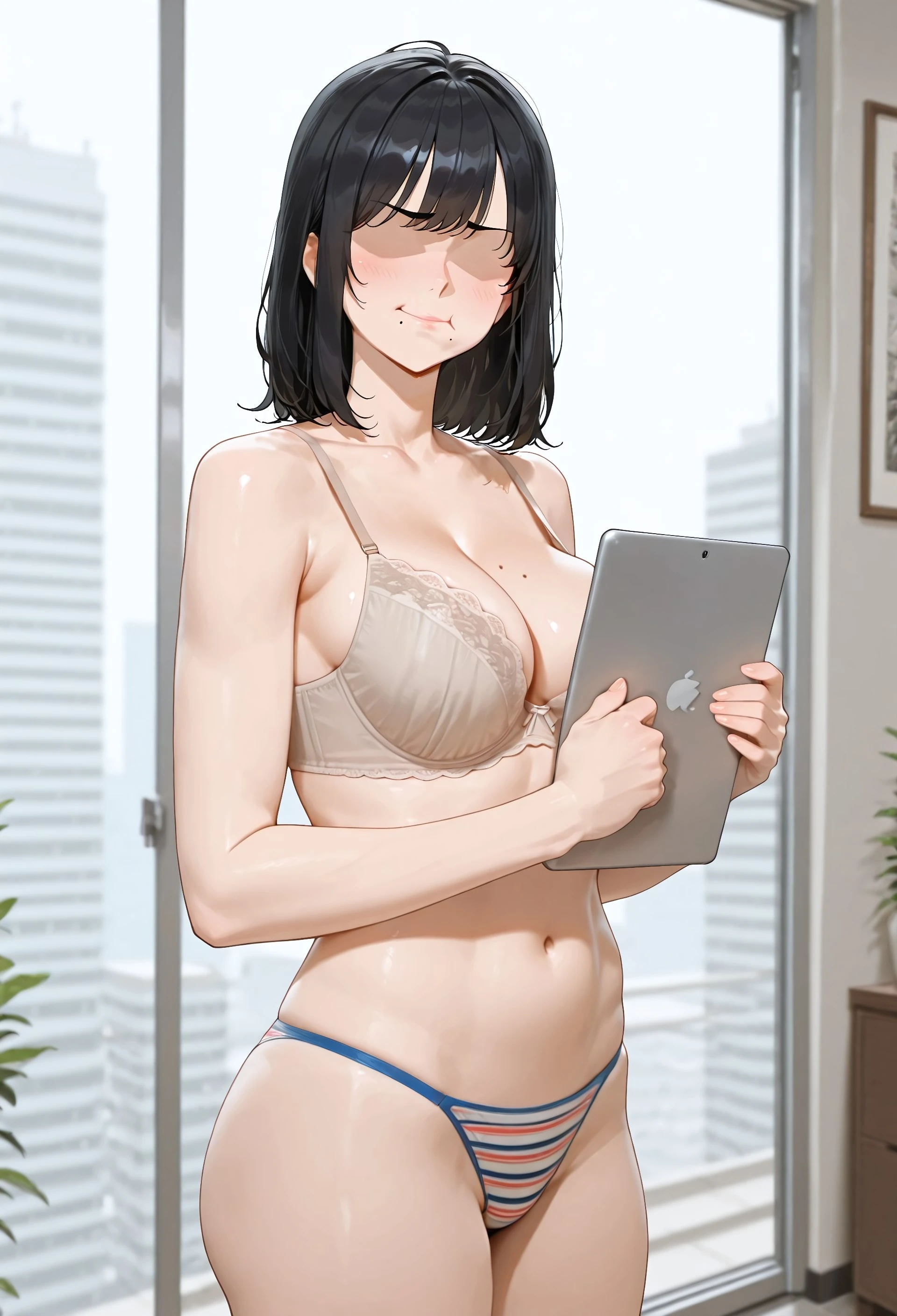 nud3_str1ng_l1n, beige bra, lace-trimmed bra, multicolored panties, striped panties, string panties