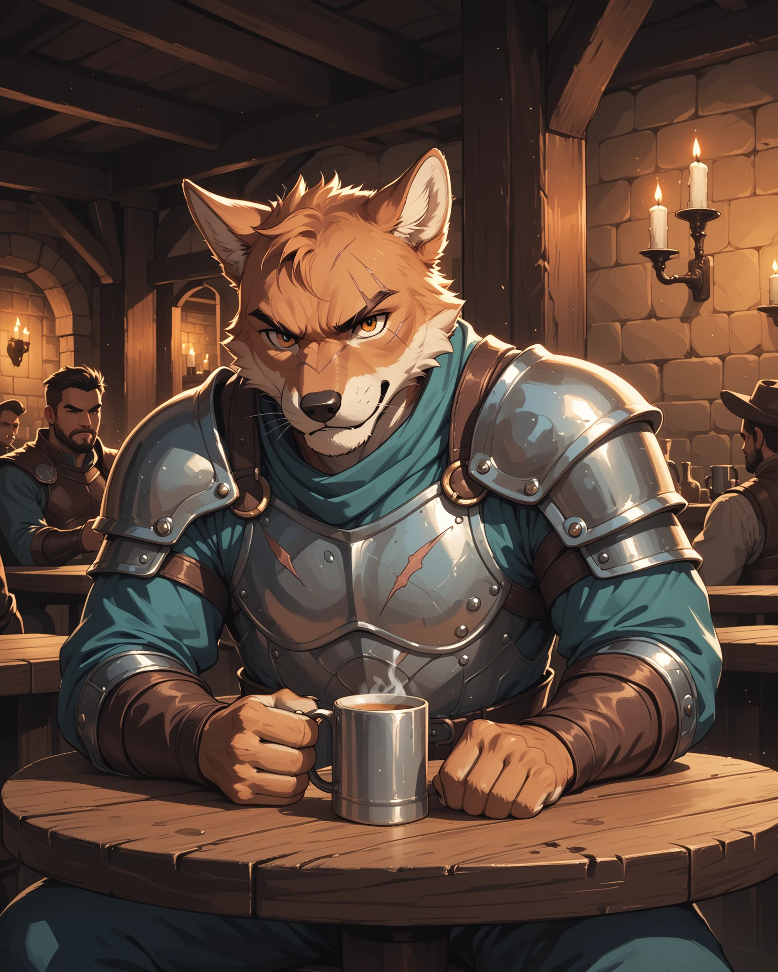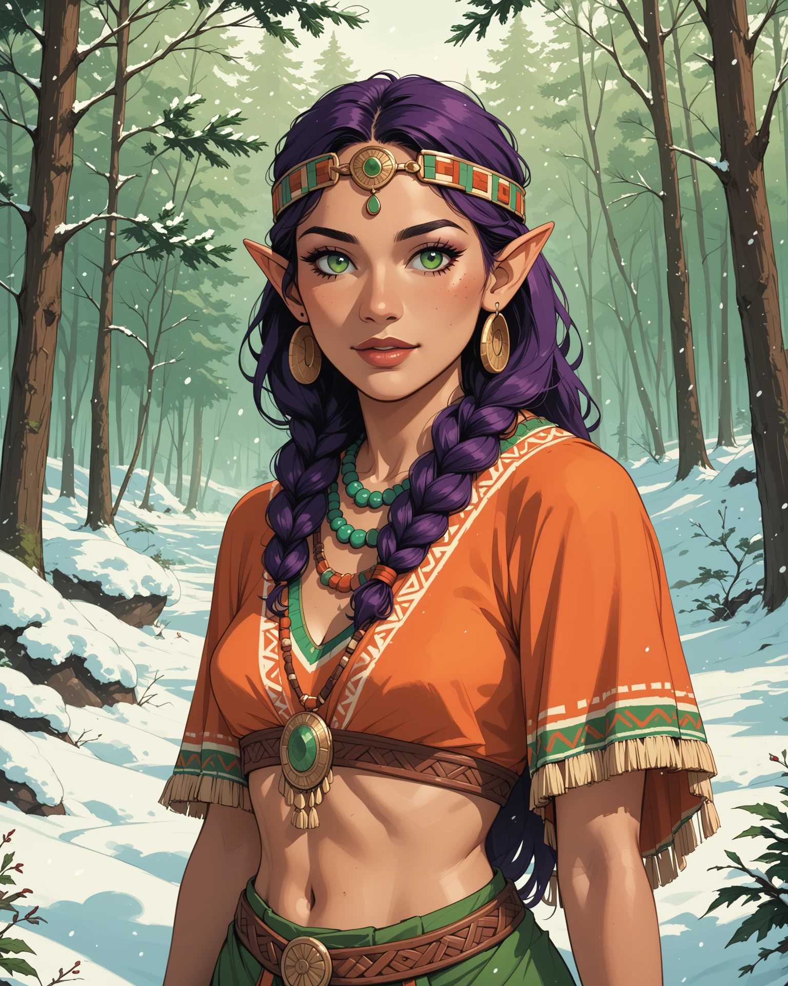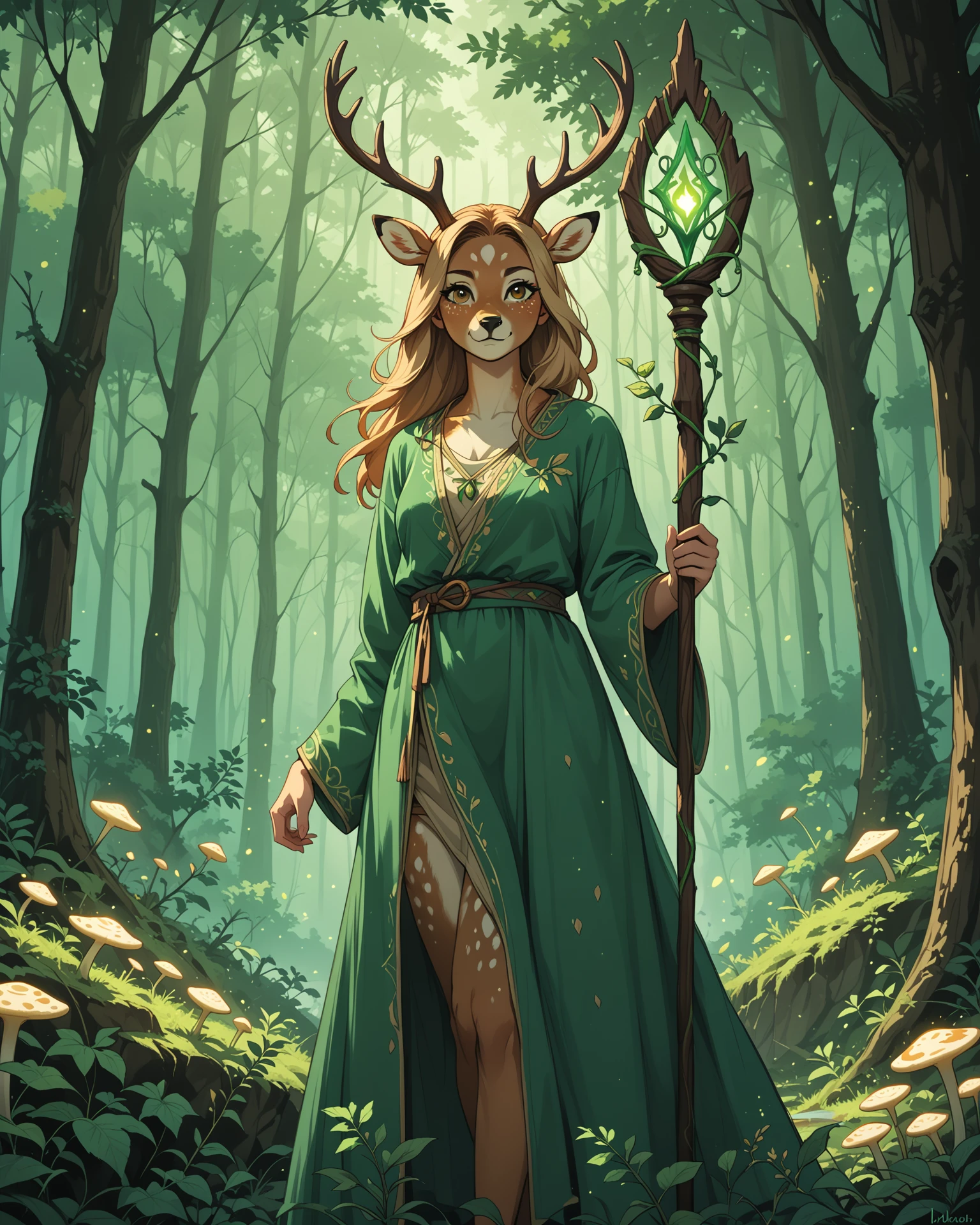 score_9,score_8_up,score_7_up, 1girl, deer anthro druid, age 28, graceful with light brown fur and white spots, antlers adorned with moss and flowers, soft hazel eyes, wearing a flowing green robe with leaf patterns, holding a staff entwined with vines, standing in a dense magical forest with glowing mushrooms, green and blue tones with golden highlights, serene and wise, glowing nature magic surrounding her, forest spirits in the background, pose, detailed background, cinematic lighting, view from below.
