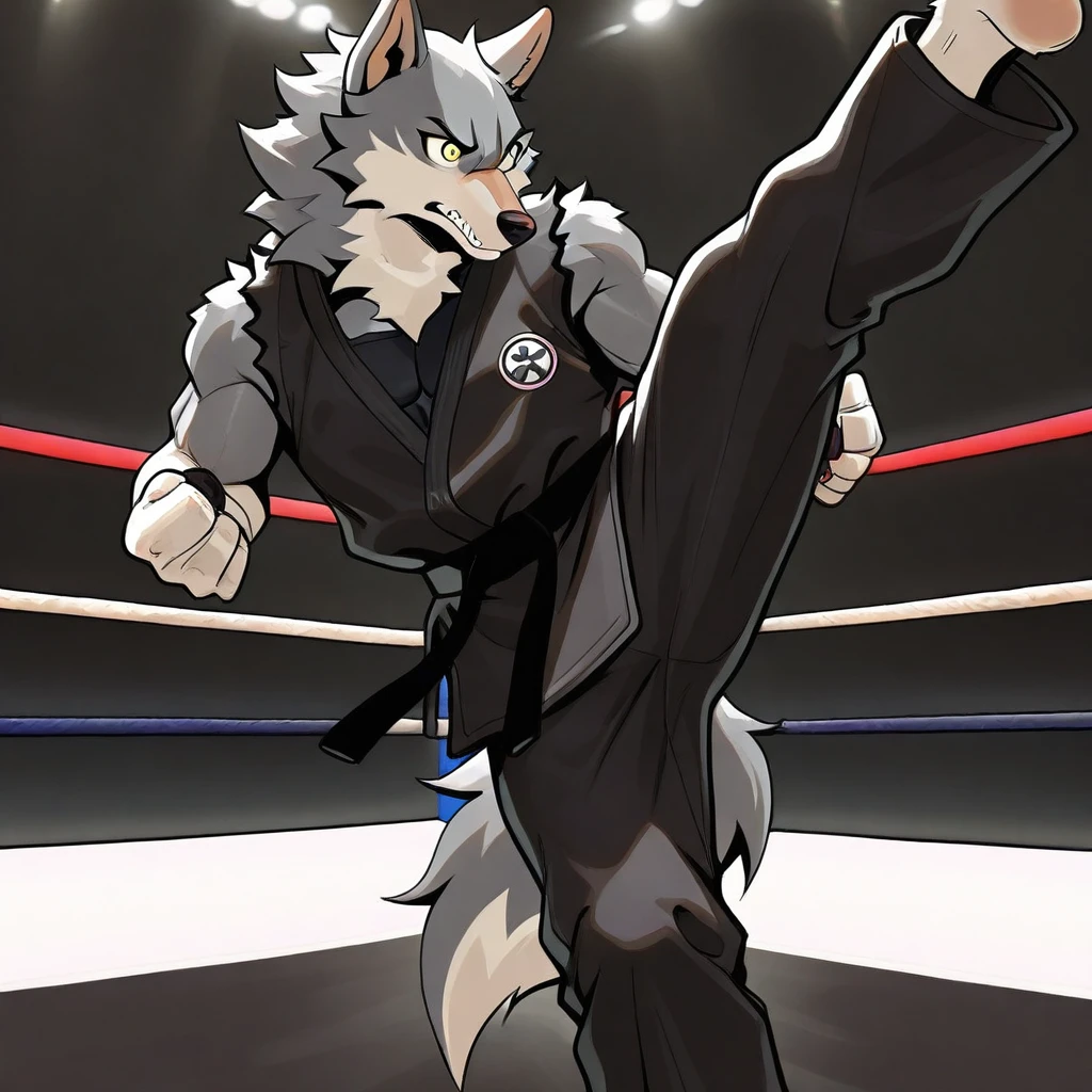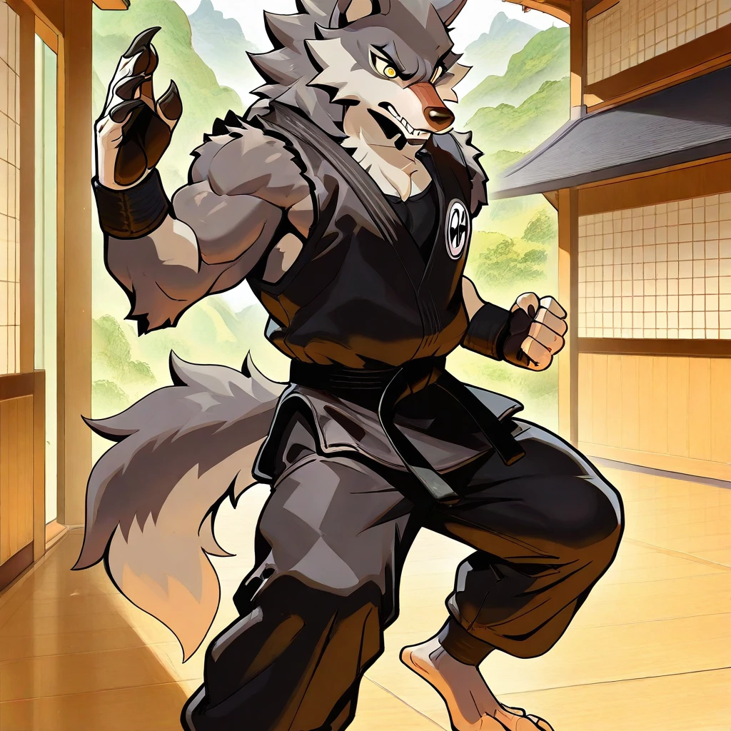 anthro wolf, dark gray fur, yellow eyes, claws, muscular