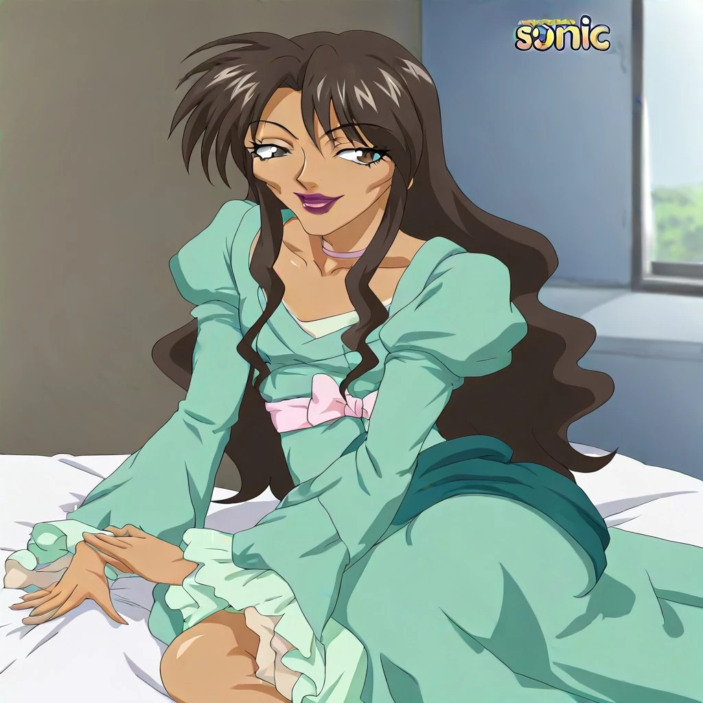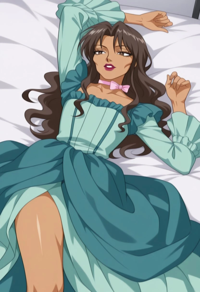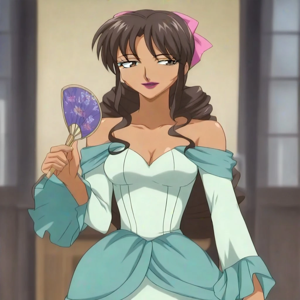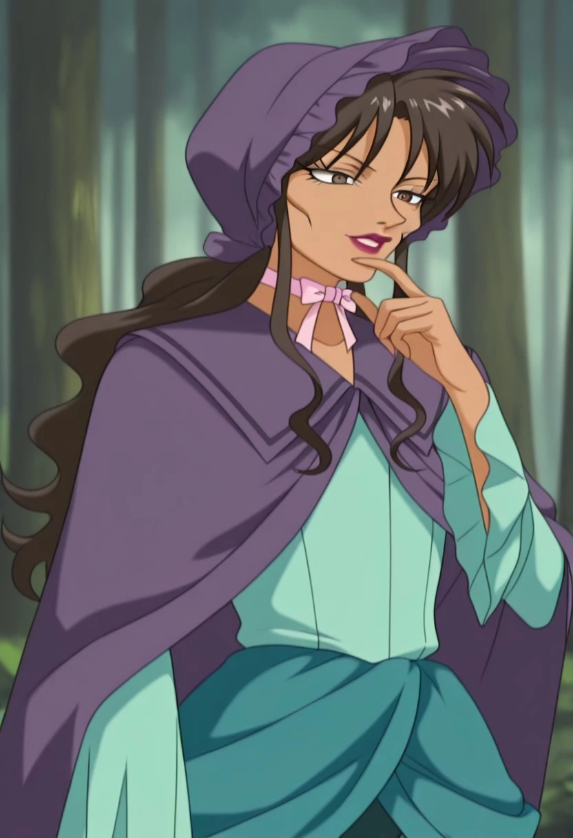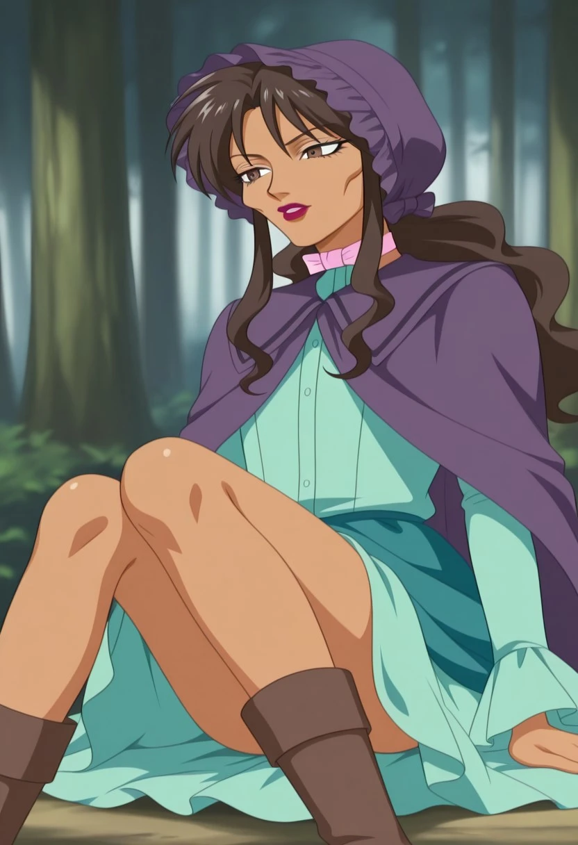 1man, solo, male, trap, Purple bonnet, purple cape, brown hair, long hair, wavy hair, brown eyes, long eyelashes, red lipstick, tan skin, prominent cheekbones, thin feminine body, pink ribbon around neck, teal ballgown, rococo ballgown, ruffled hem, long sleeves, ruffled sleeves, blue panniers, brown boots, small white owl with blue markings