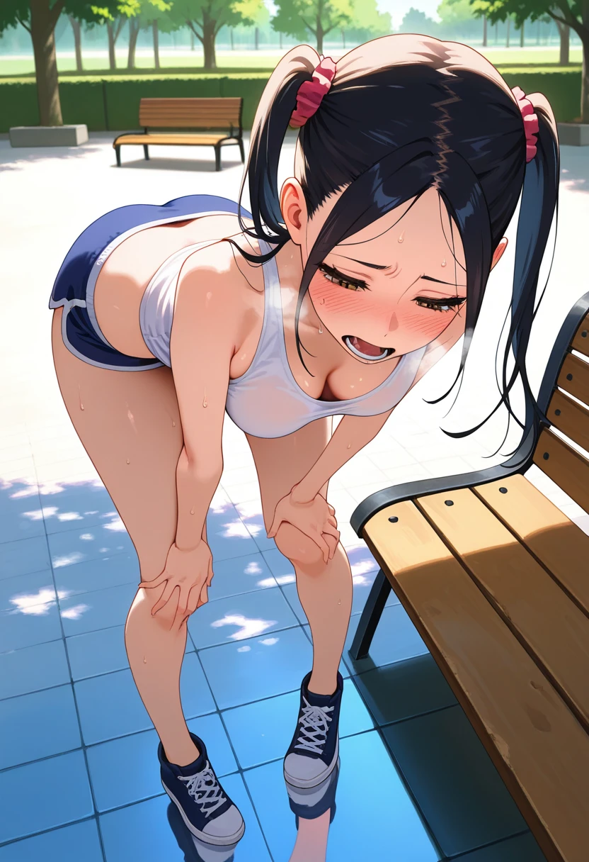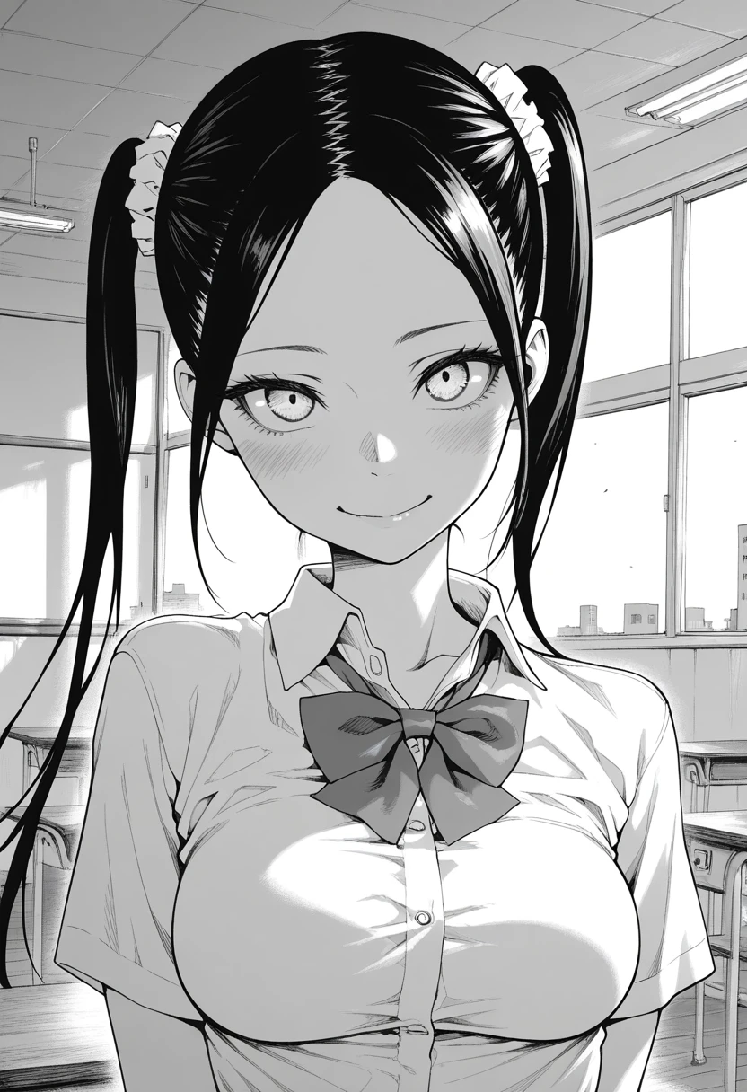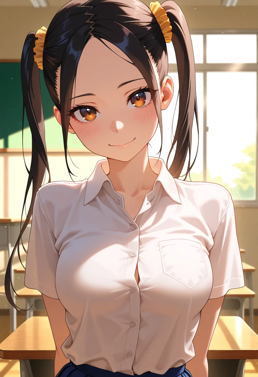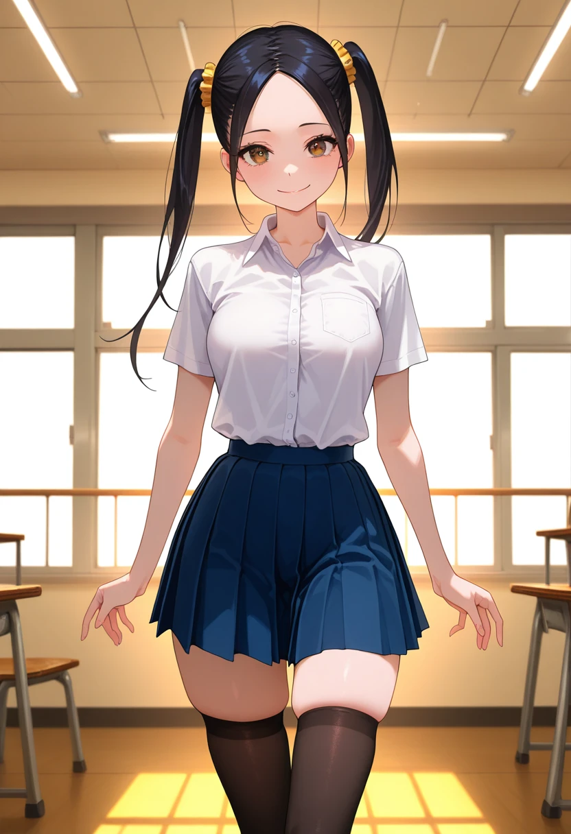 nanashiww, brown eyes, black hair, long hair, twintails, hair scrunchie, parted bangs, ??????????????,