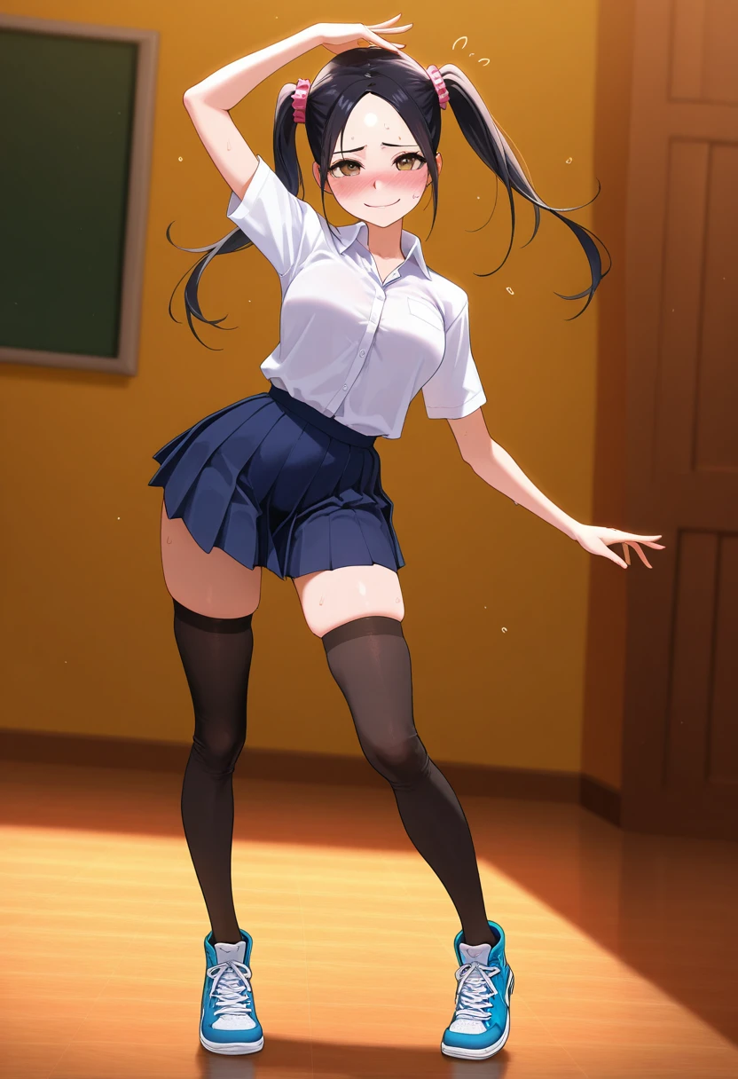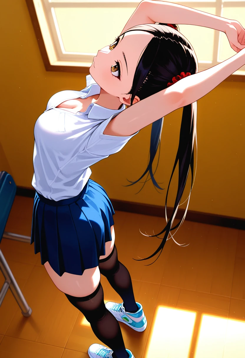 school uniform, collared shirt, pleated skirt, zettai ryouiki, thighhighs, sneakers,
