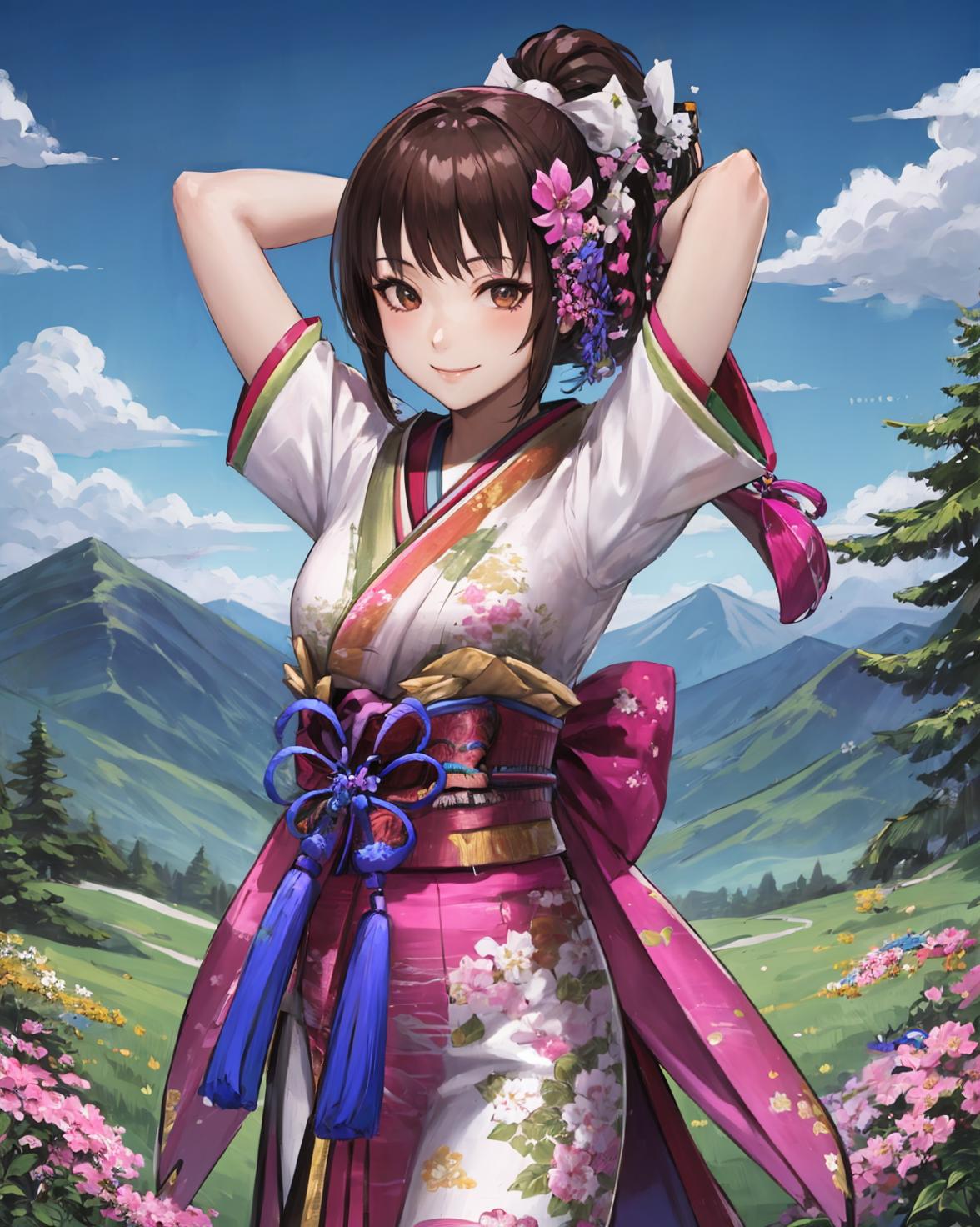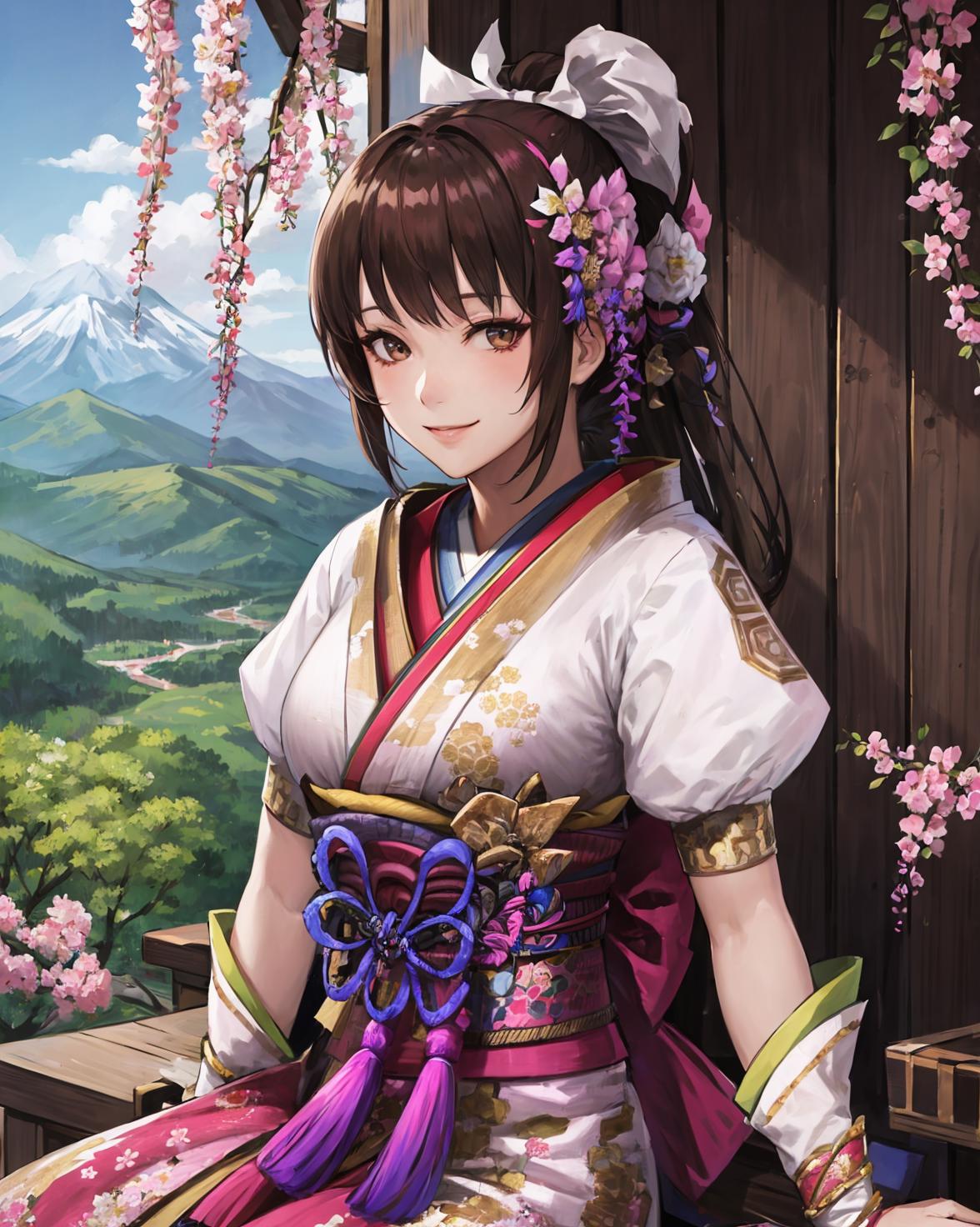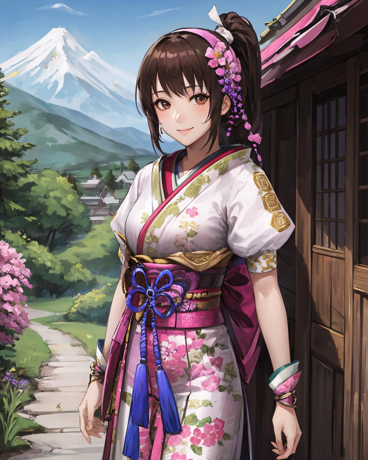 <lora:OichiSW4-07:0.9>, Oichi, brown hair, ponytail, hair ornament, brown eyes, medium breasts, pink dress, japanese clothes, long kimono, short sleeves, tabi socks, sandals,