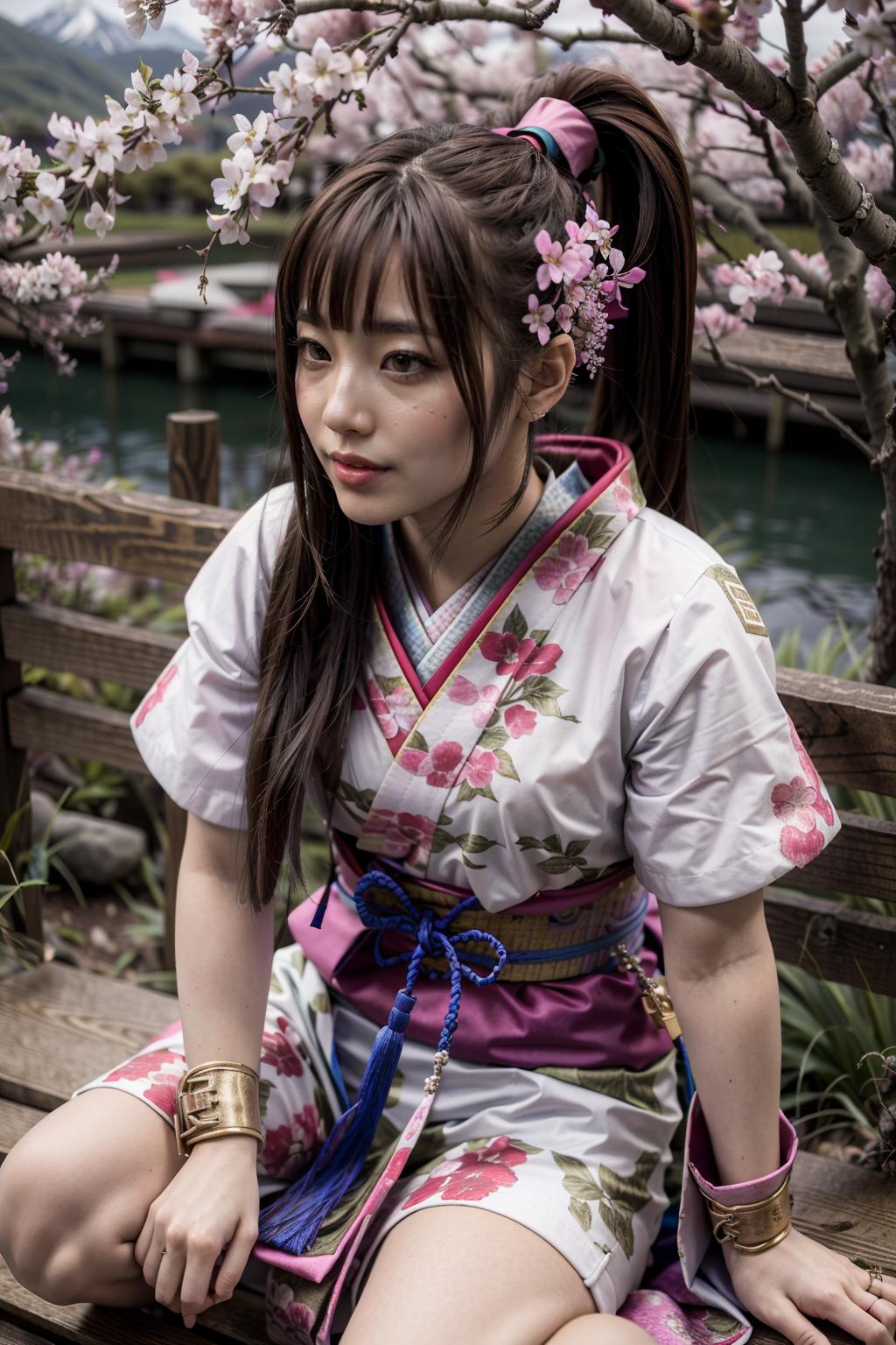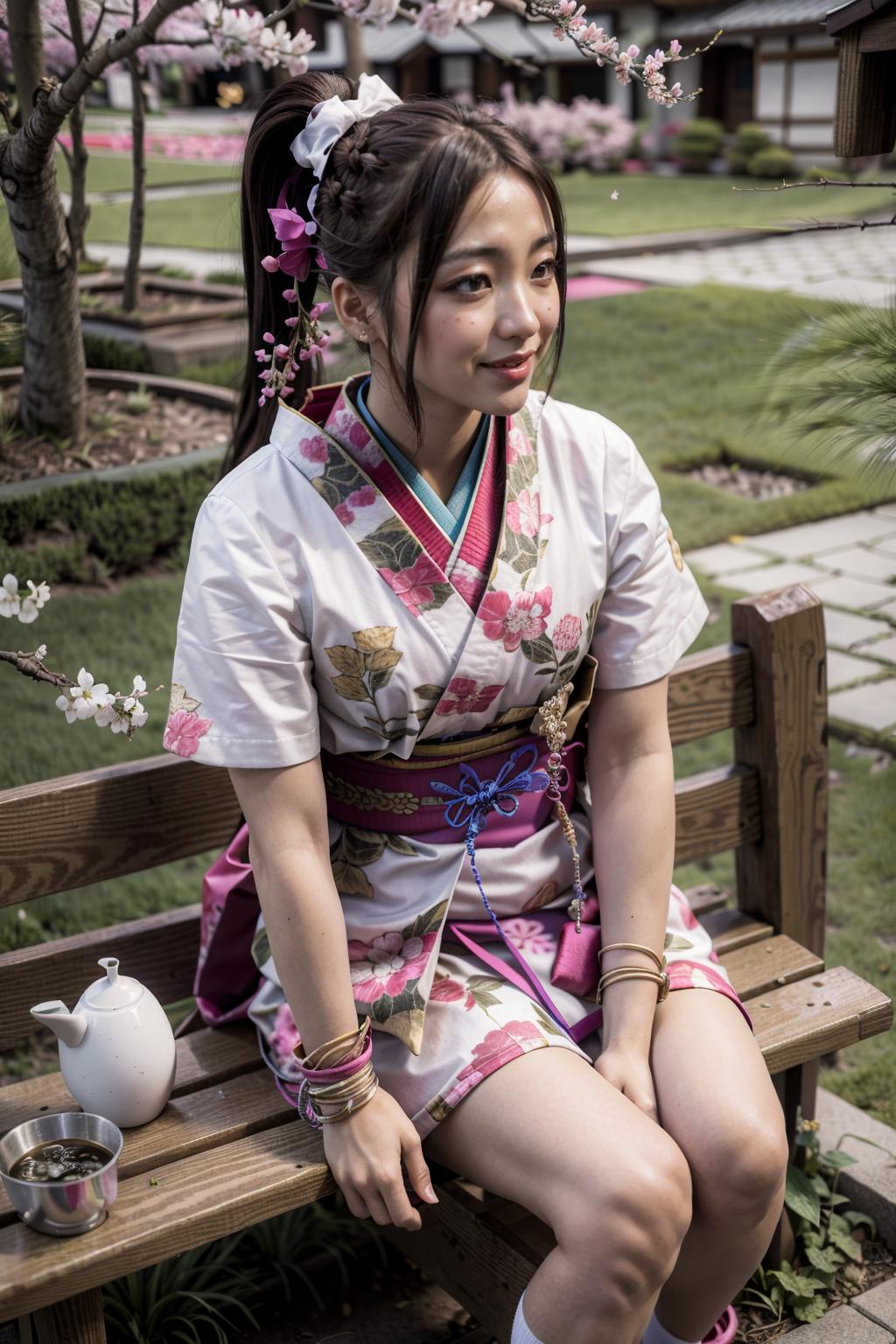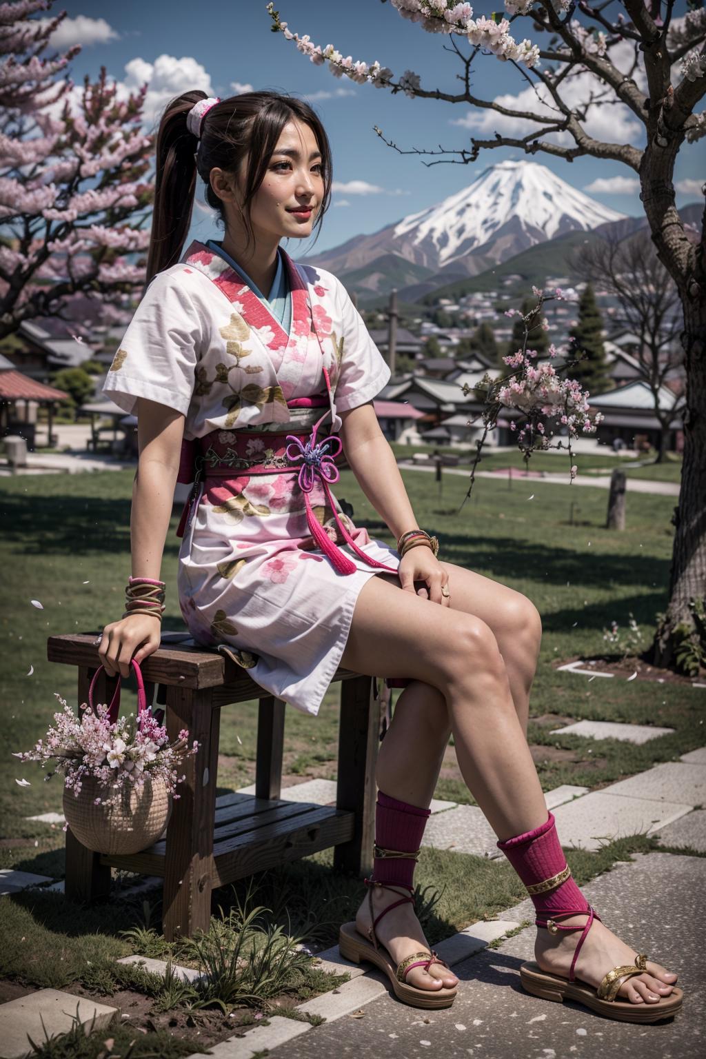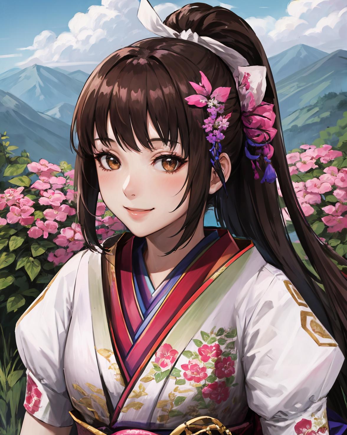 <lora:OichiSW4-07:0.9>, Oichi, brown hair, ponytail, hair ornament, brown eyes, medium breasts, pink dress, japanese clothes, long kimono, short sleeves, tabi socks, sandals,