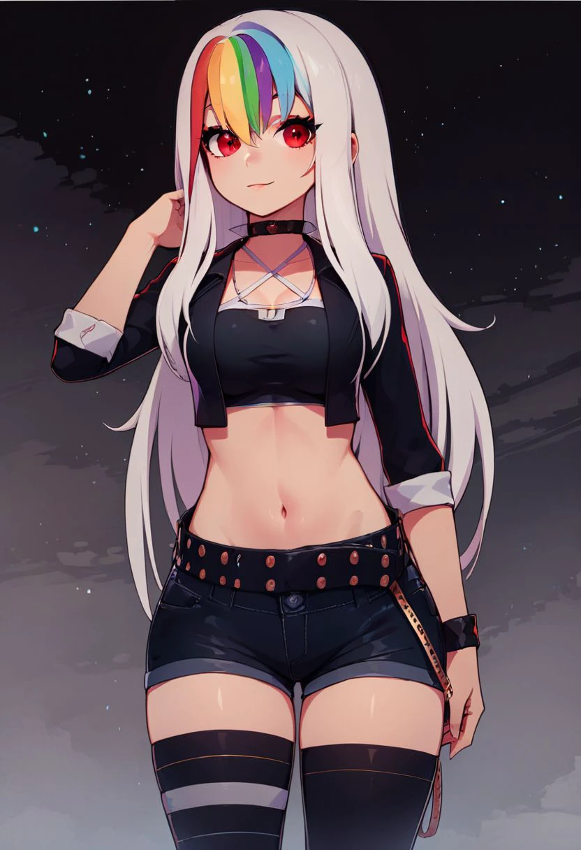 Party outfit: open jacket, black jacket, midriff, crop top, cropped jacket, belt, criss-cross halter, shorts, shirt, choker, black thighhighs, jewelry,