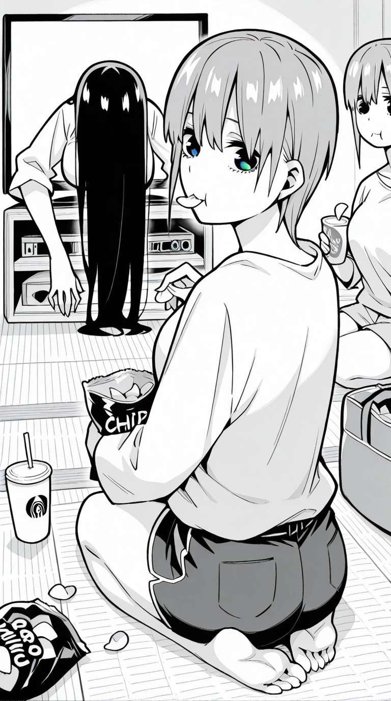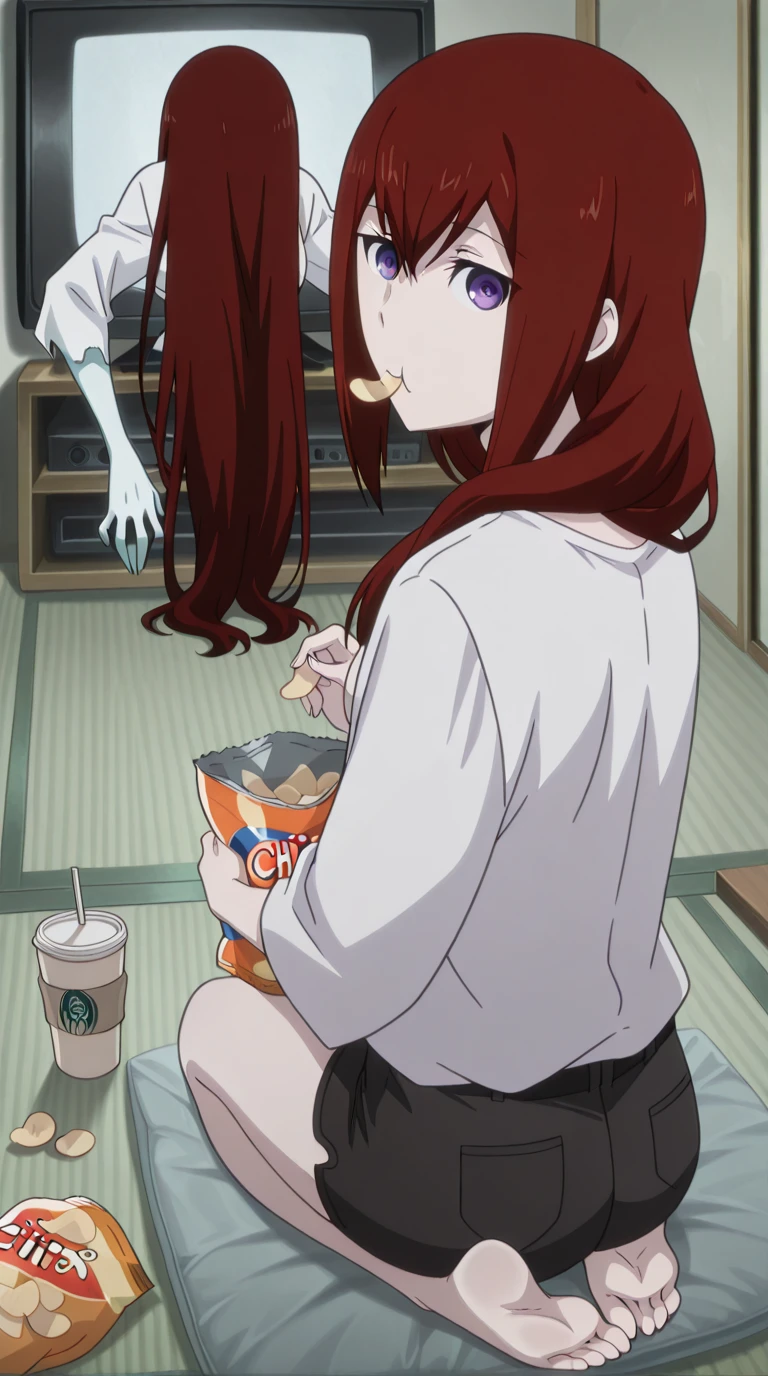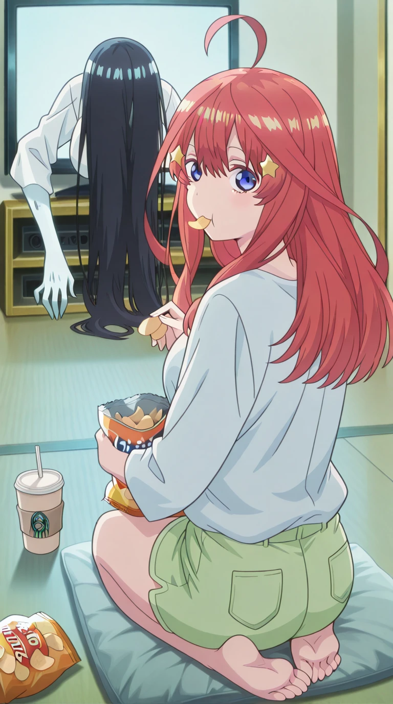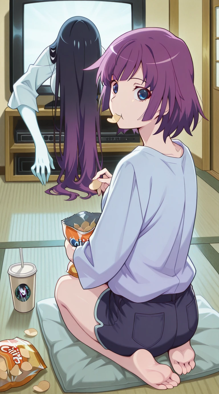 <lora:yamamura-sadako-illustriousxl-lora-nochekaiser:1>, yamamura sadako, long hair, looking at viewer, multiple girls, 2girls, sitting, full body, food, shorts, barefoot, solo focus, indoors, looking back, ???????????, feet, toes, soles, eating, holding food, seiza, on floor, disposable cup, television, chips (food), potato chips, bag of chips, black hair