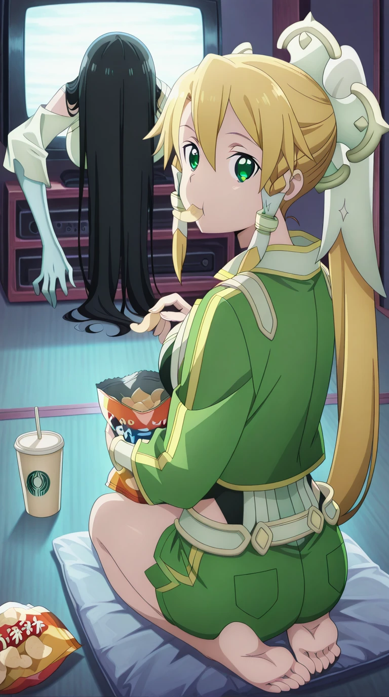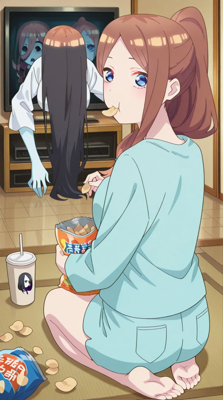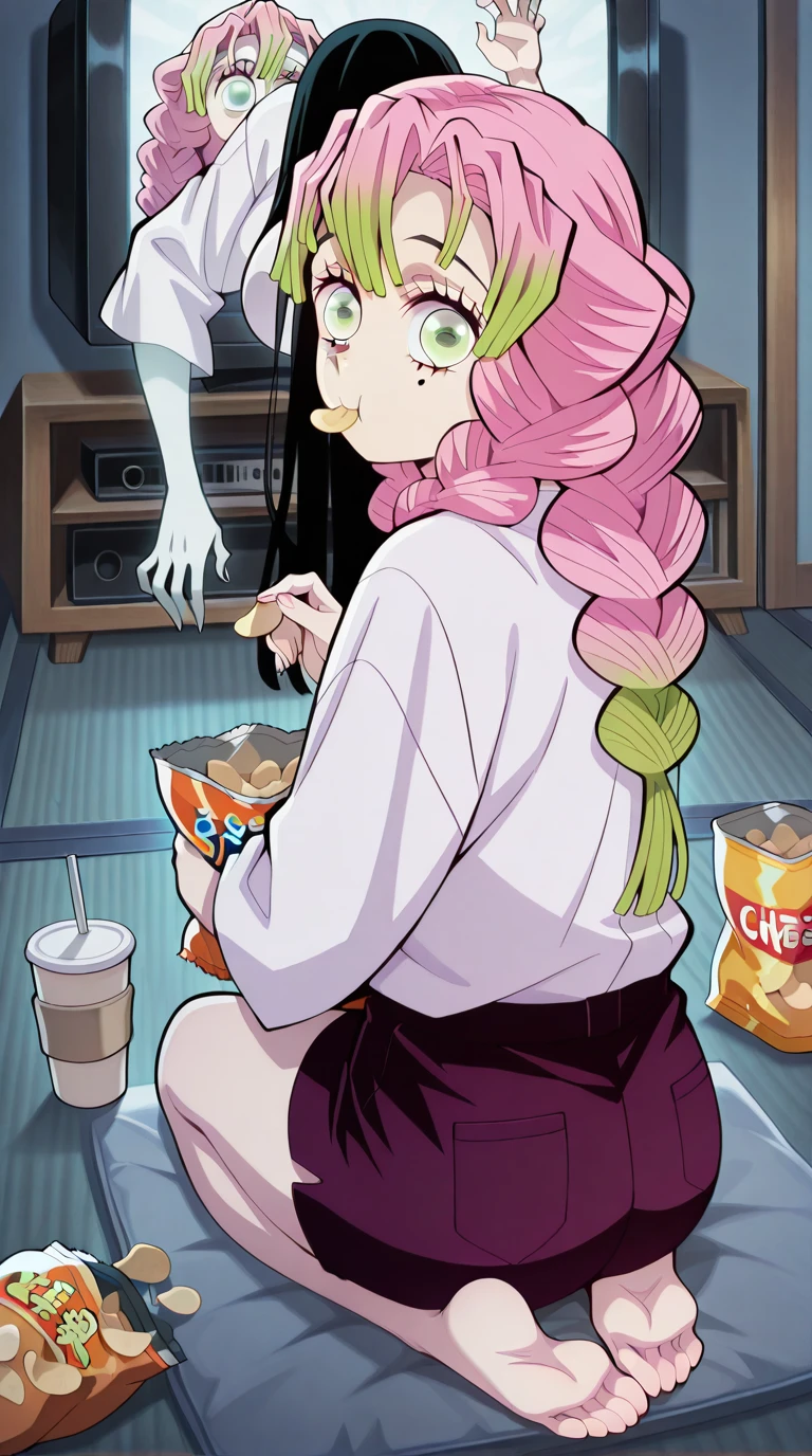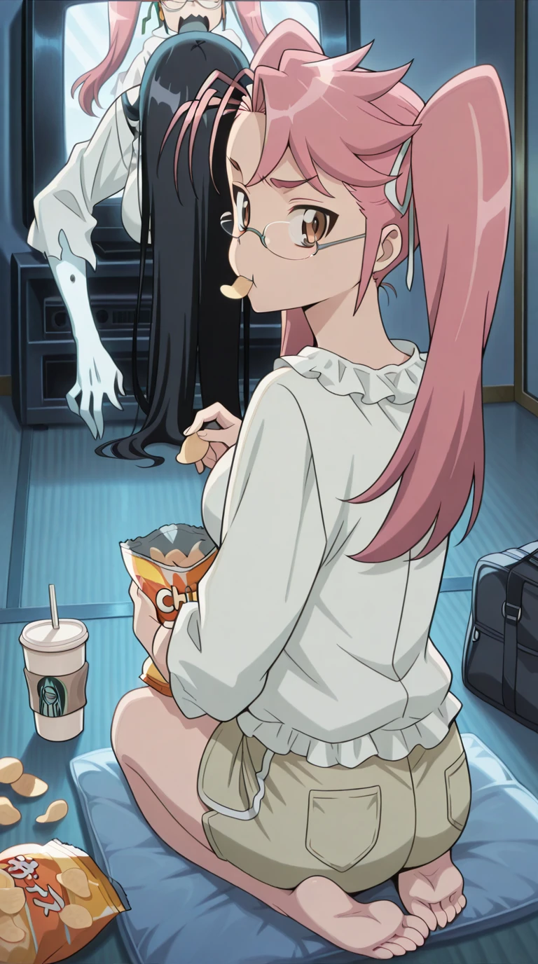 <lora:yamamura-sadako-illustriousxl-lora-nochekaiser:1>, yamamura sadako, long hair, looking at viewer, multiple girls, 2girls, sitting, full body, food, shorts, barefoot, solo focus, indoors, looking back, ???????????, feet, toes, soles, eating, holding food, seiza, on floor, disposable cup, television, chips (food), potato chips, bag of chips, black hair