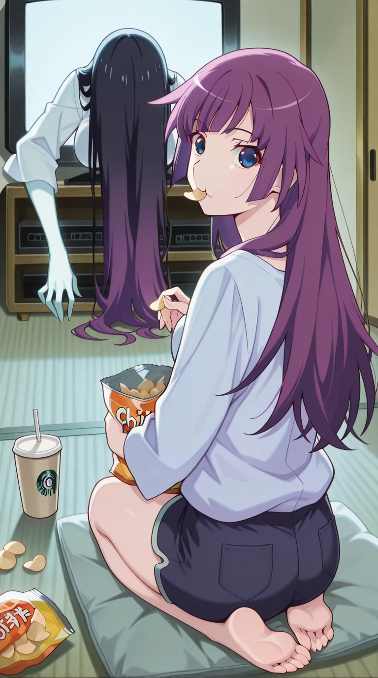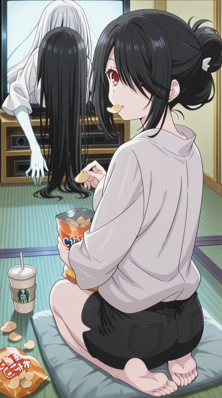 <lora:yamamura-sadako-illustriousxl-lora-nochekaiser:1>, yamamura sadako, long hair, looking at viewer, multiple girls, 2girls, sitting, full body, food, shorts, barefoot, solo focus, indoors, looking back, from behind, feet, toes, soles, eating, holding food, seiza, on floor, disposable cup, television, chips (food), potato chips, bag of chips, black hair