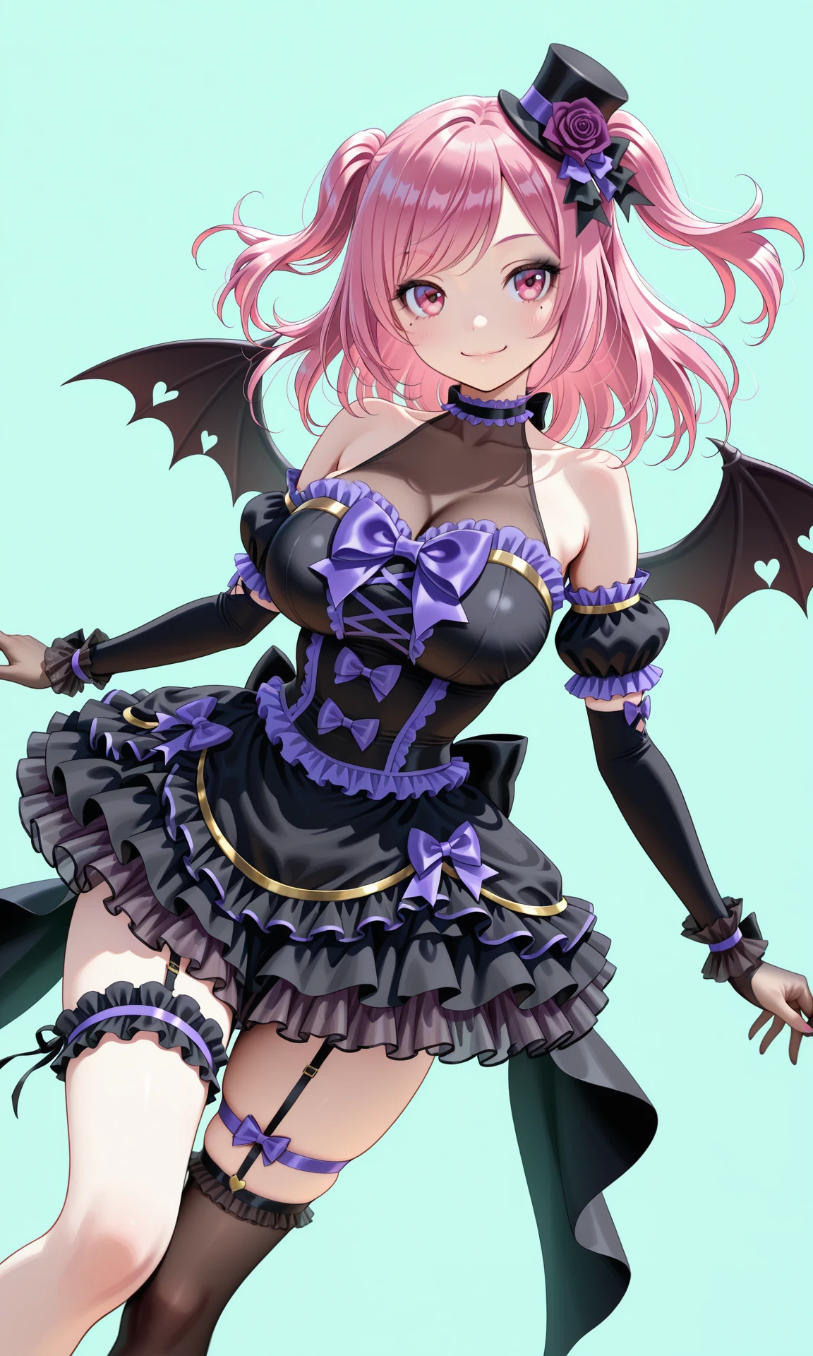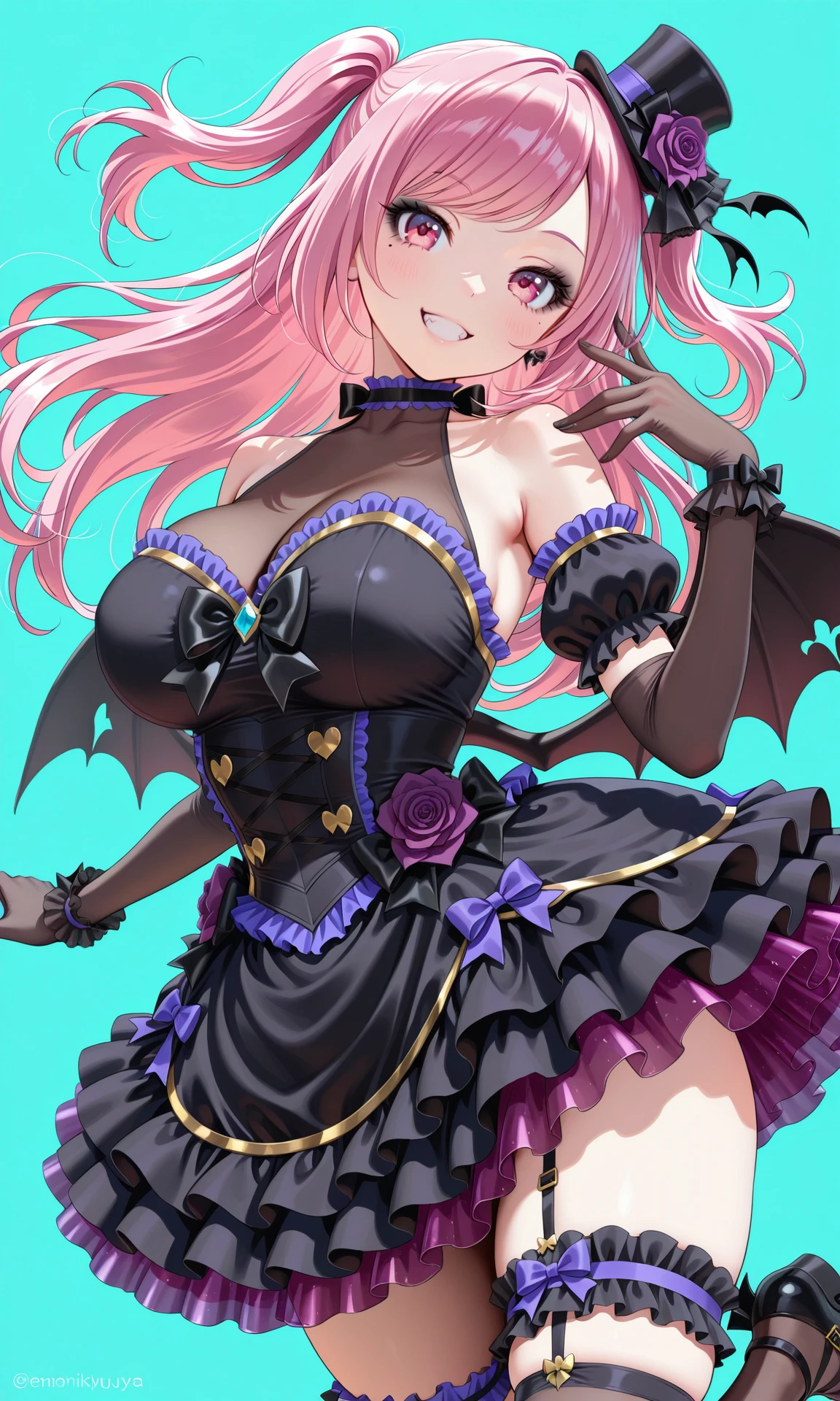 tags:hat, flower, hat_flower, mini hat ,top hat,purple flower,rose,purple rose, two side up,pink hair,long hair,swept bangs, pink eyes,mole_under_eye, tsurime,black_eyeshadow,