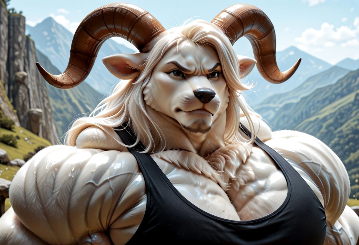 anthro sheep, male, mature male, hyper muscles, hyper muscular, nipples, black nose, black eyes, white fur, white wool, beige face,brown horns, long horns, sheep ears, sheep tail, hooves, huge shoulders, thick neck, fluffy, pubic hair, long hair, white hair, black lip, black eyes, eyeliner, eyelashes, handsome, cheekbones, chin, black lip, big lip, white goatee