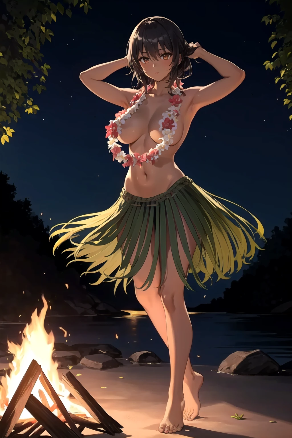 6. The grass skirt will sometimes be very long and fit like pants. To fix this, add "pants" to the negative prompt.