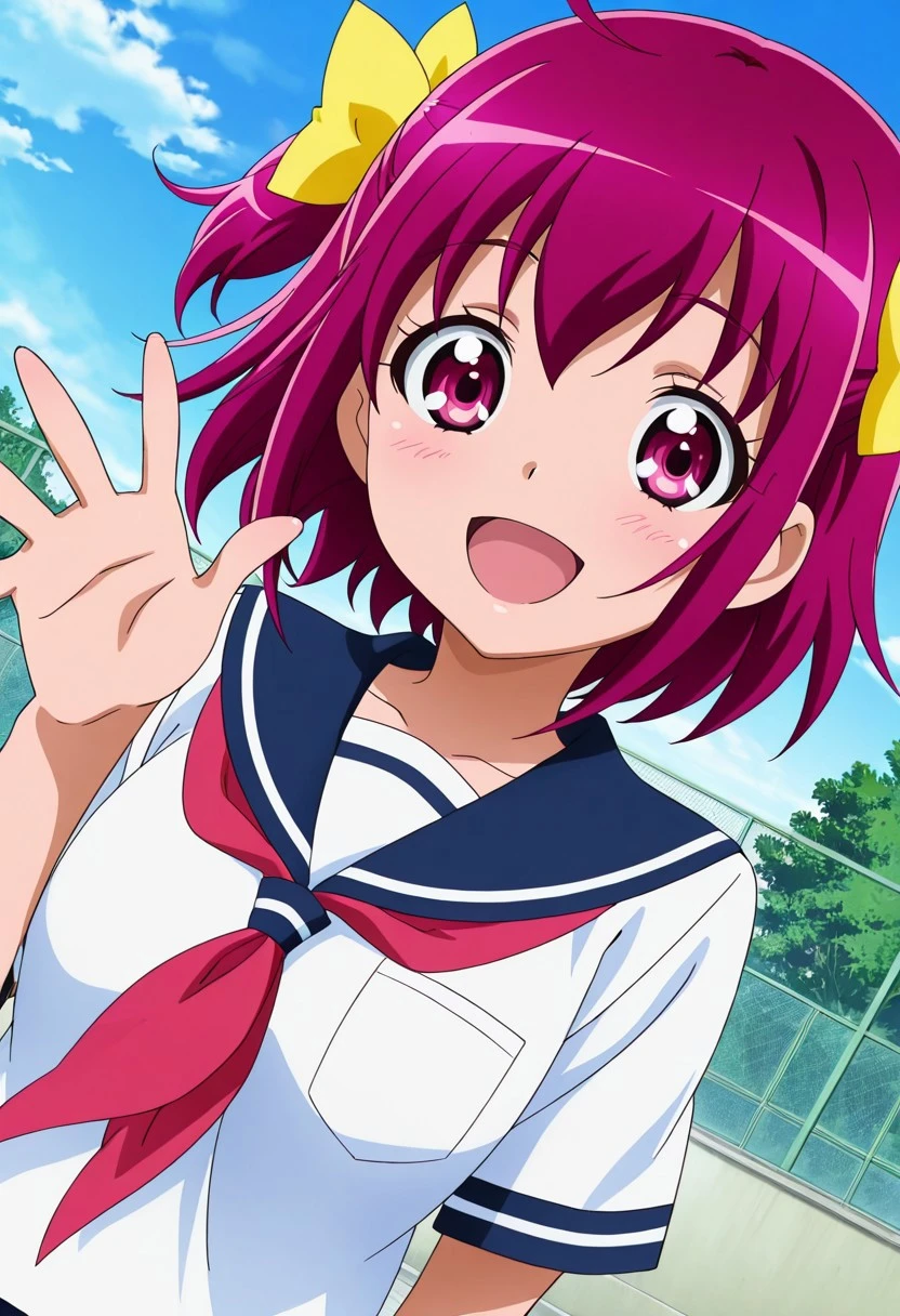 Miyuki,dark pink_hair, short_hair, pink eyes, hair ribbon, yellow ribbon, huge_breasts, ahoge, rolling hairs,
