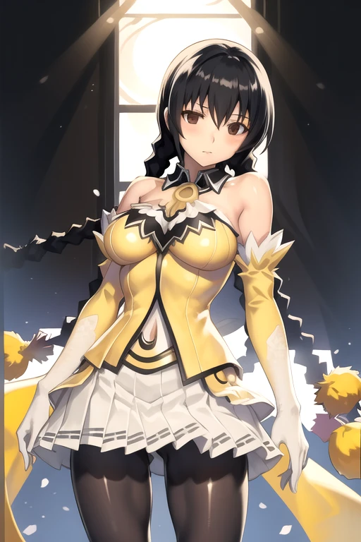 ReithMagna, 1girl, solo, very long hair, skirt, large breasts, black hair, bare shoulders, twin braids, pantyhose, detached sleeves, black eyes, impossible clothes