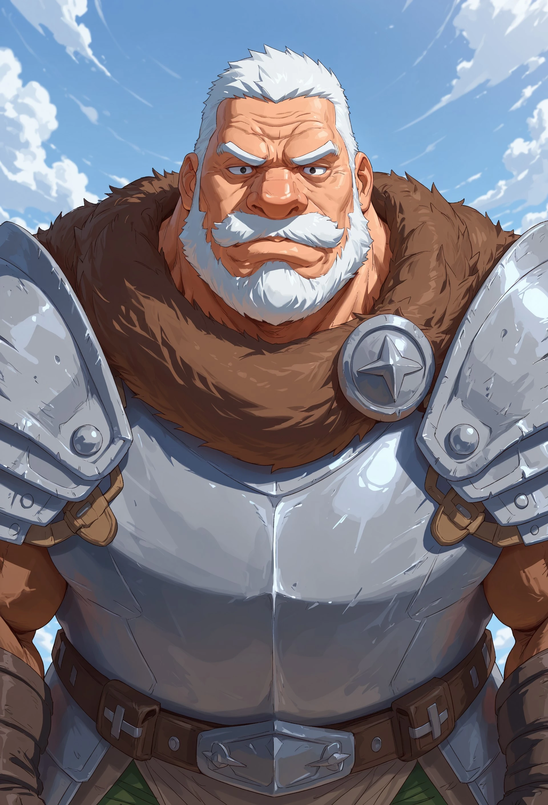 Everett, white hair, beard, mustache, thick nose, metal plated armor, metal gloves, leather undershirt, brown fur around neck, green pants, black boots, forehead wrinkles, short hair