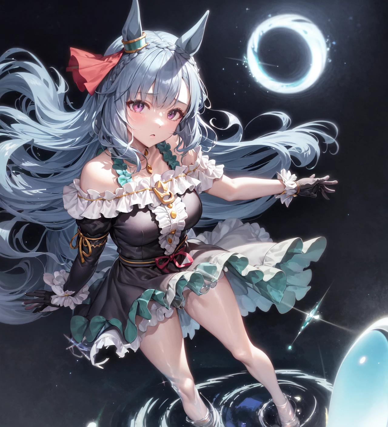 • ear ornament, black gloves, white gloves, asymmetrical gloves, mismatched gloves, detached sleeves, puffy sleeves, short sleeves, long sleeves, asymmetrical sleeves, uneven sleeves, ribbon, bare shoulders, off-shoulder dress, black dress, frilled dress, center frills, knee boots, asymmetrical footwear, mismatched footwear