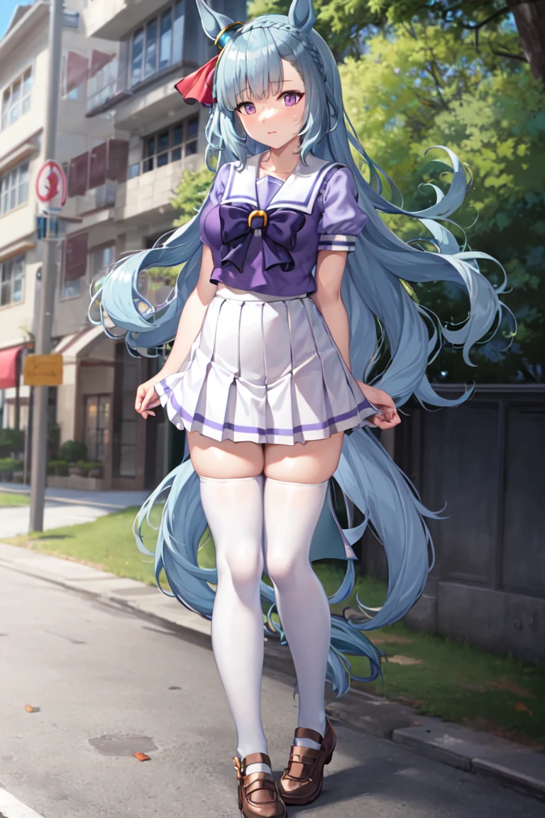 • tracen school uniform, summer uniform, serafuku, sailor collar, bowtie, puffy short sleeves, sailor shirt, purple shirt, white skirt, pleated skirt, miniskirt, white thighhighs, brown footwear, shoes,