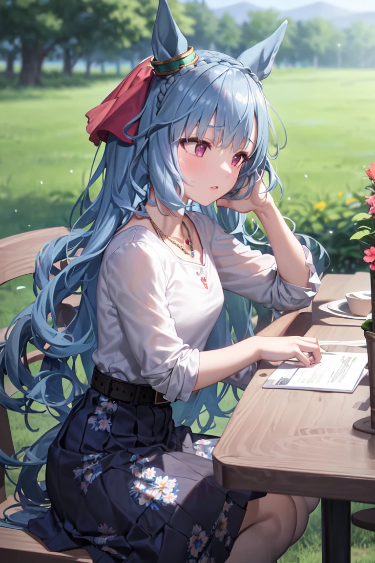 • jewelry, necklace, long sleeves, white shirt, belt, necklace, blue skirt, long skirt, floral print, socks