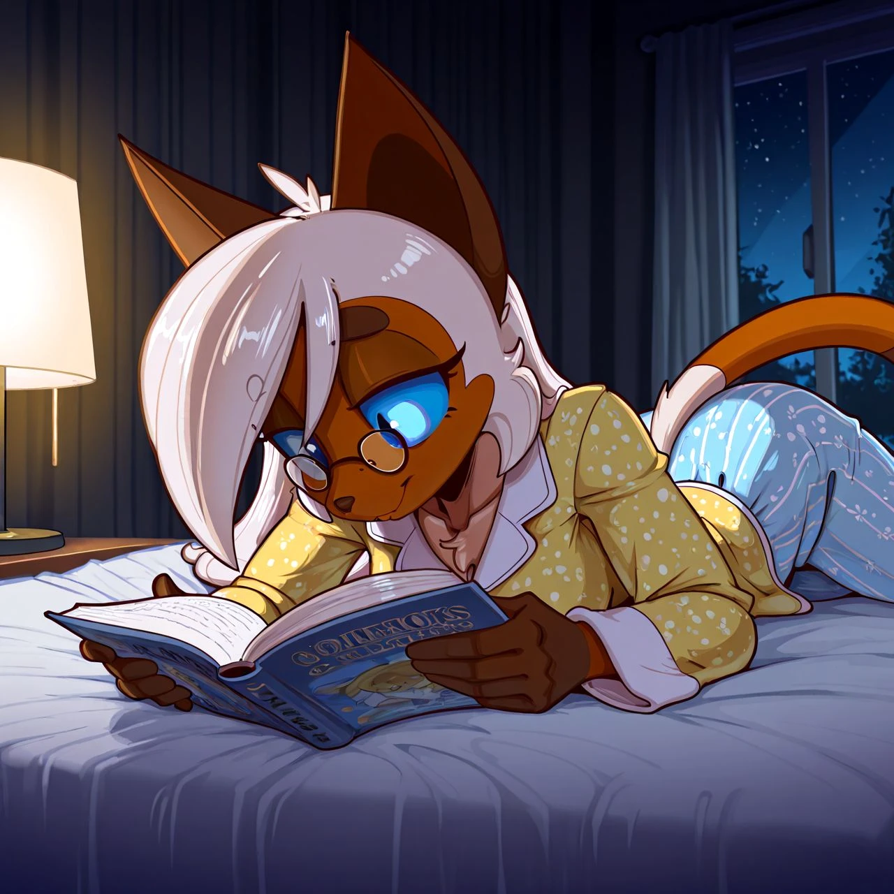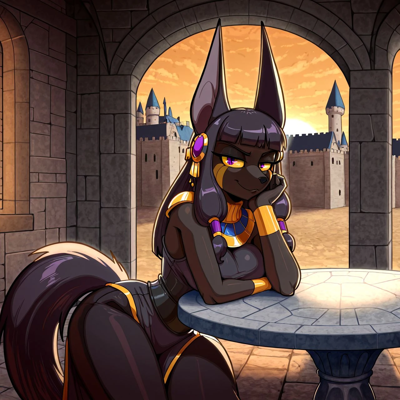 seshafi, anubian jackal, canid, large ears, black body, facial markings, yellow sclera, purple eyes, tail