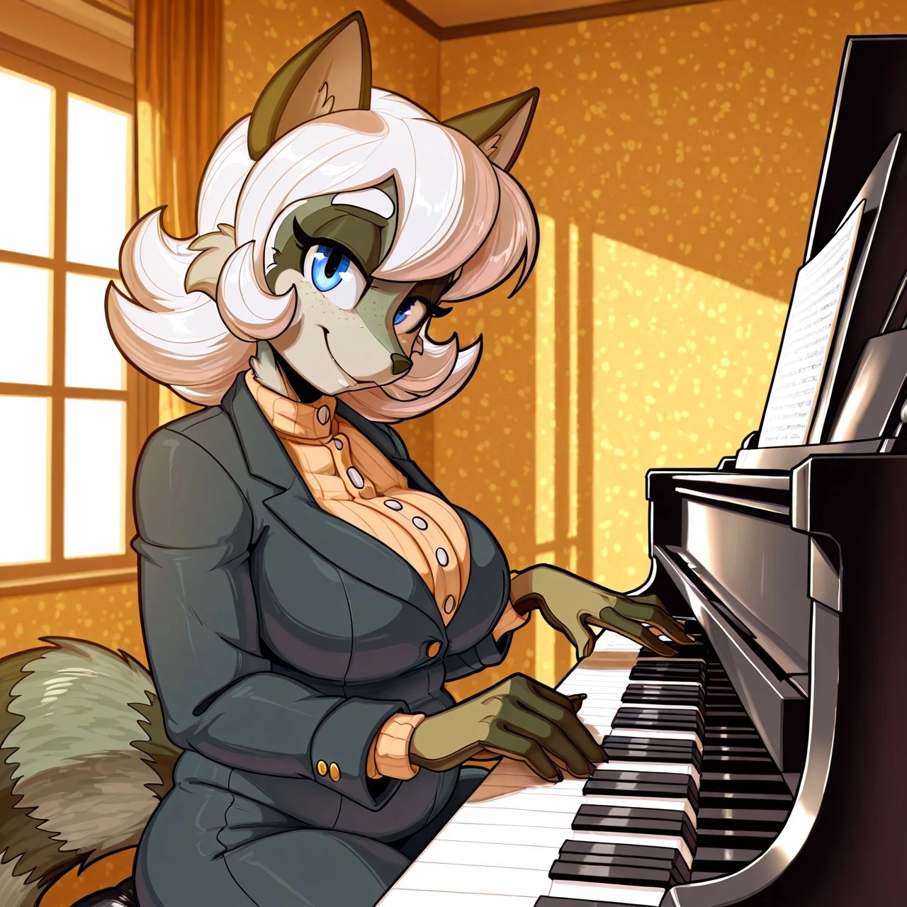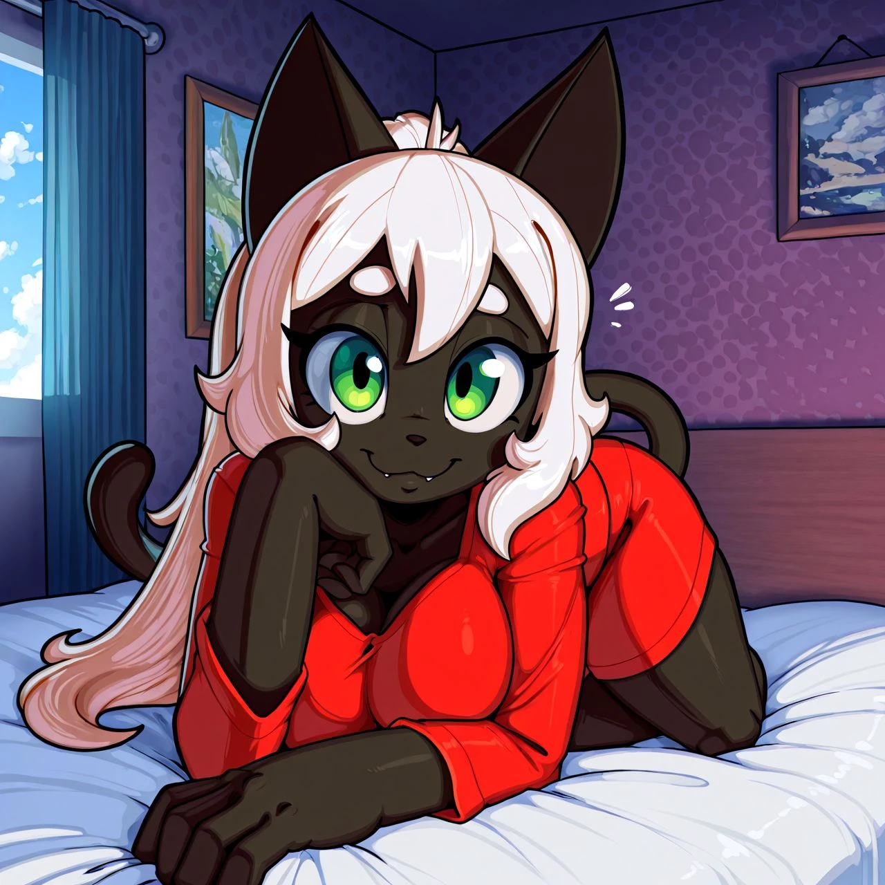 leskaviene, feline, black body, green eyes, white hair, shortstack, plump, big hands,
