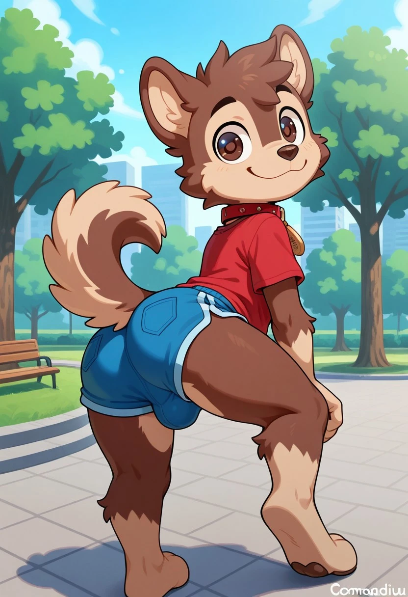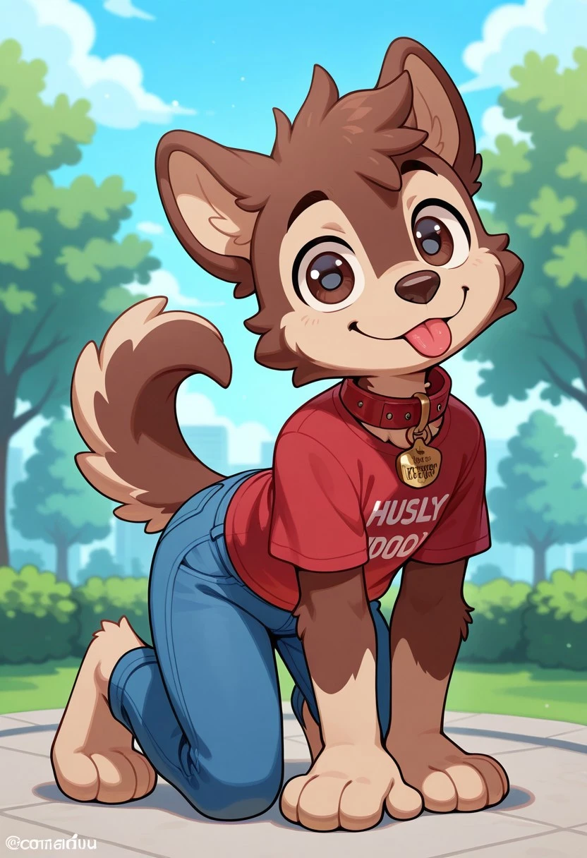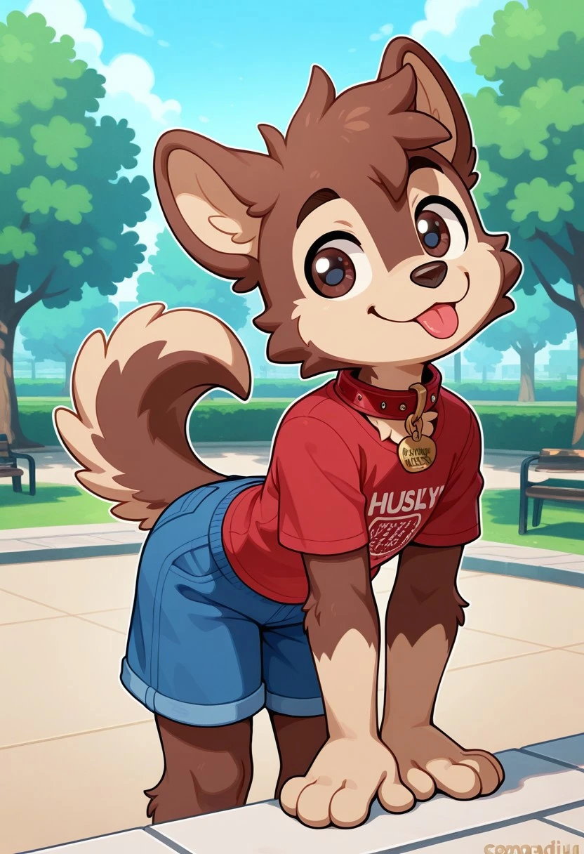 Comandiu,furry brown and cream husky pup with big round eyes, sitting pose, tongue out, wearing a red collar with a golden dog tag