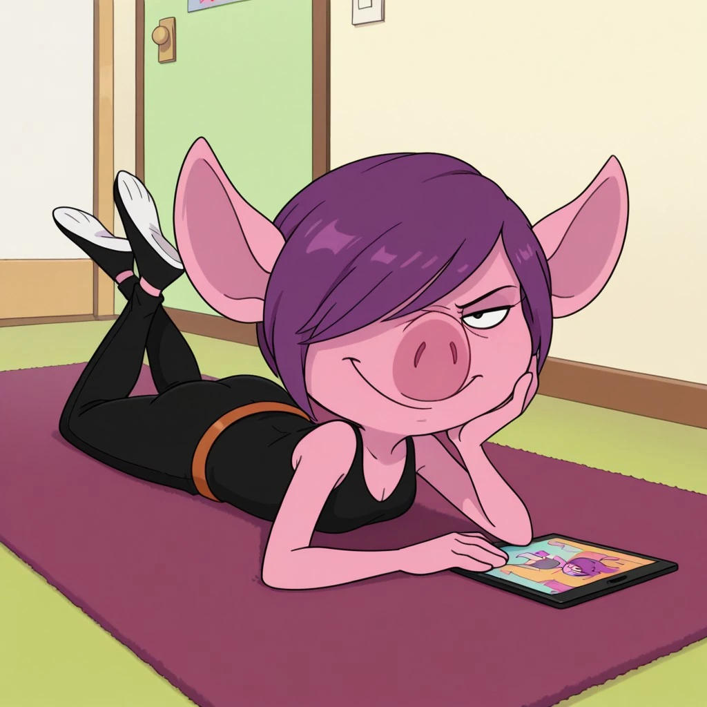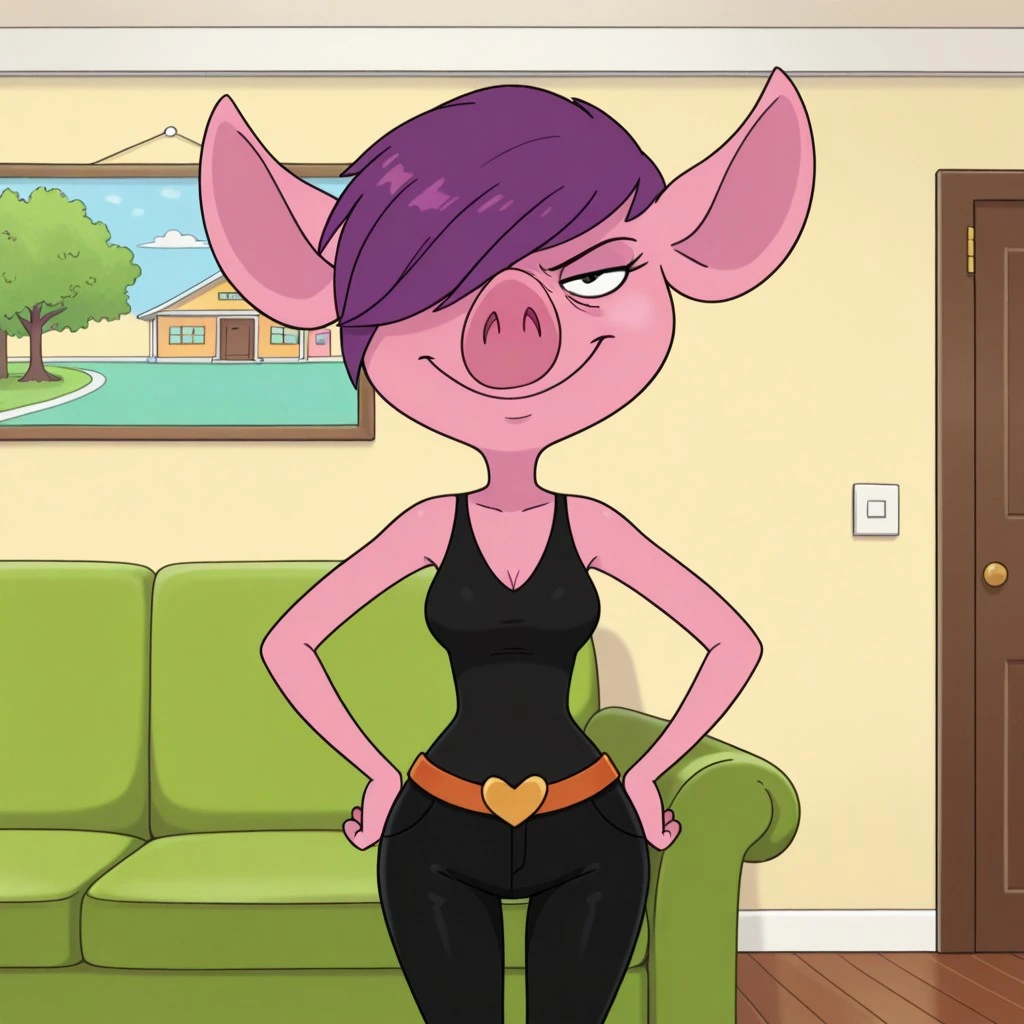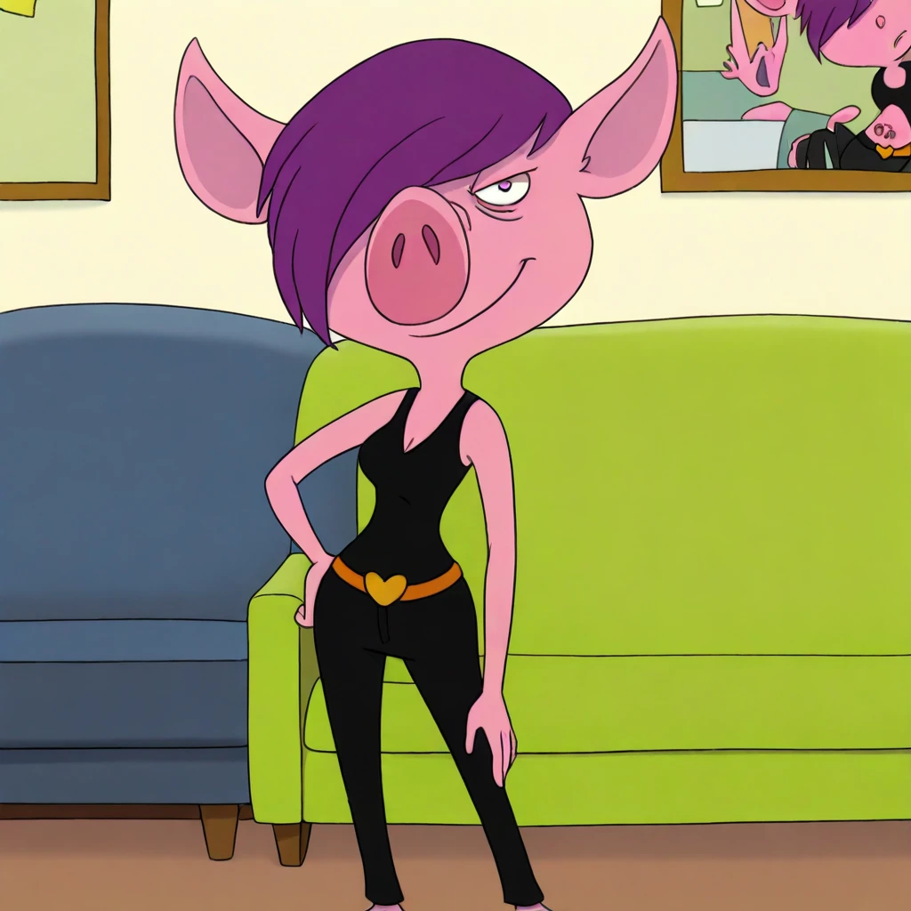 flore_min, pink skin, purple hair, hair over one eye, furry, shirt, pants, belt