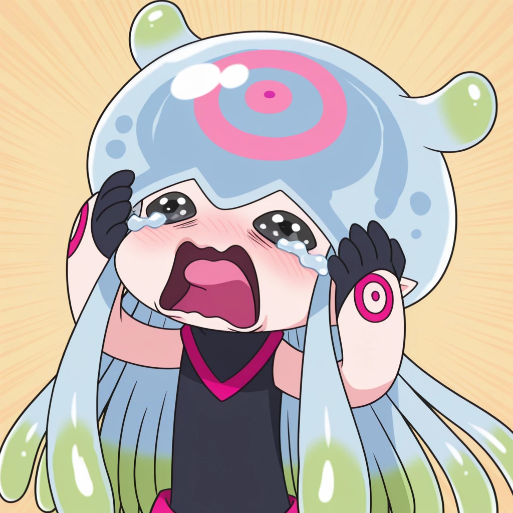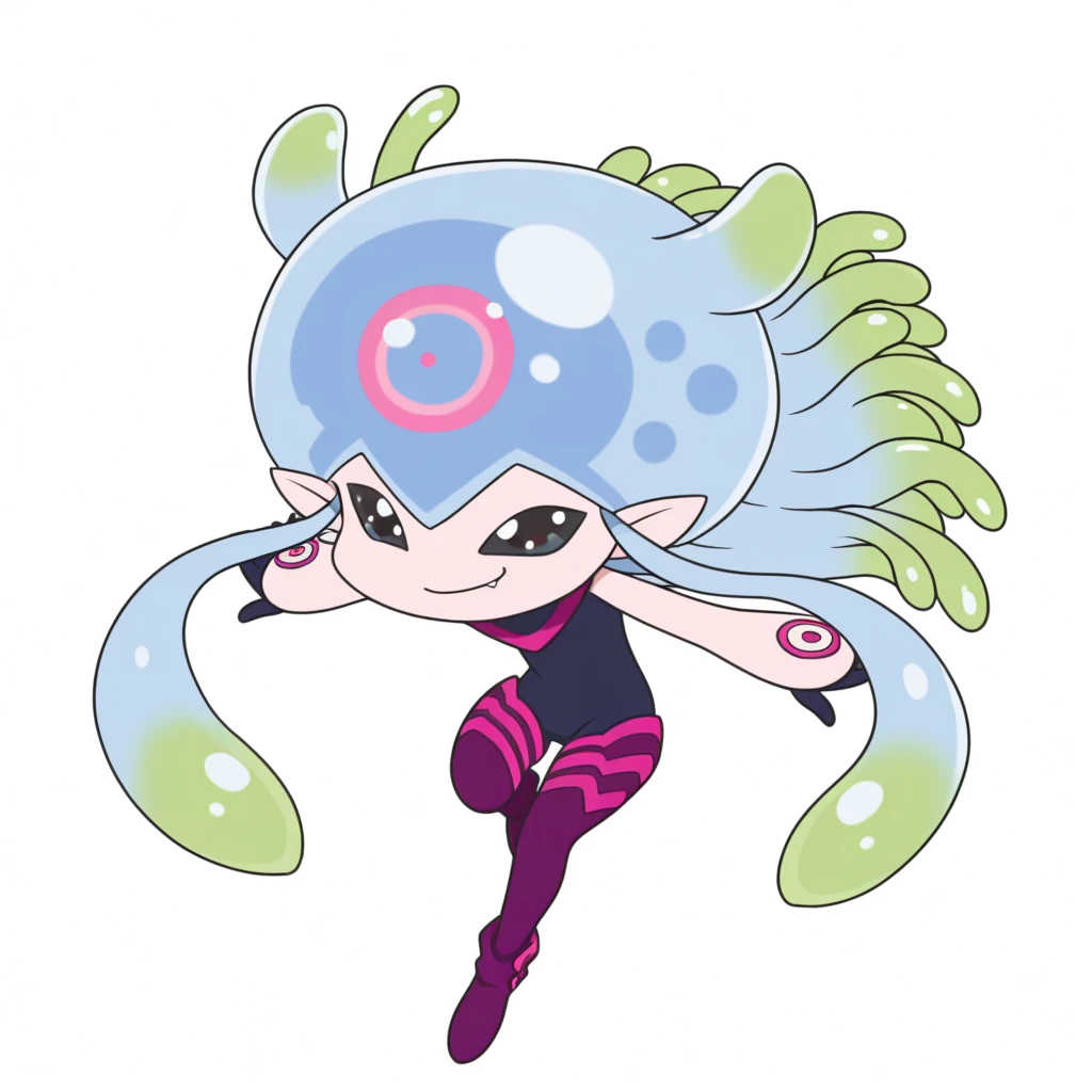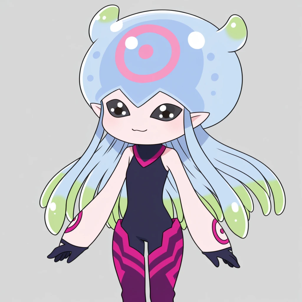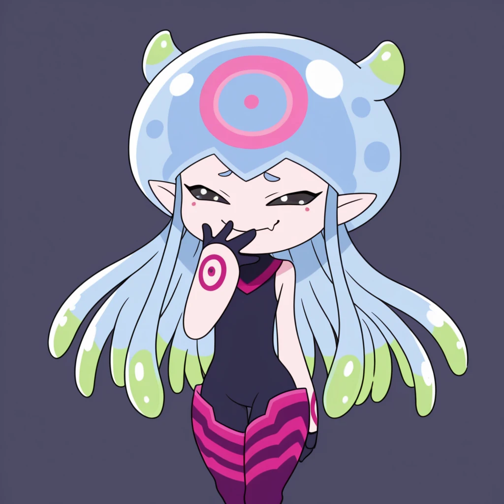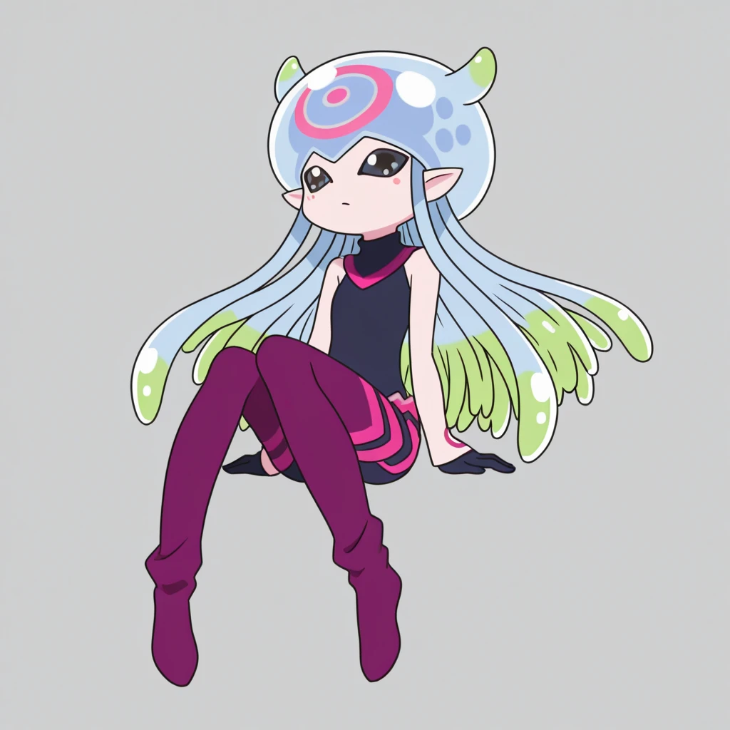 pointy ears, tentacle hair, multicolored hair, black eyes, purple legwear, digimon
