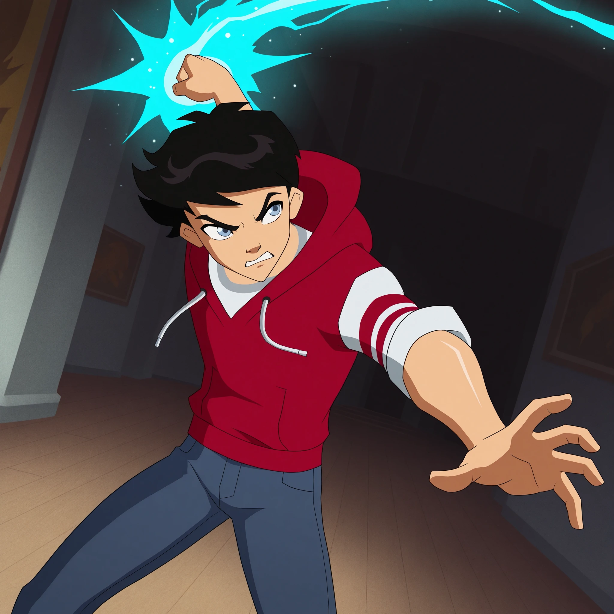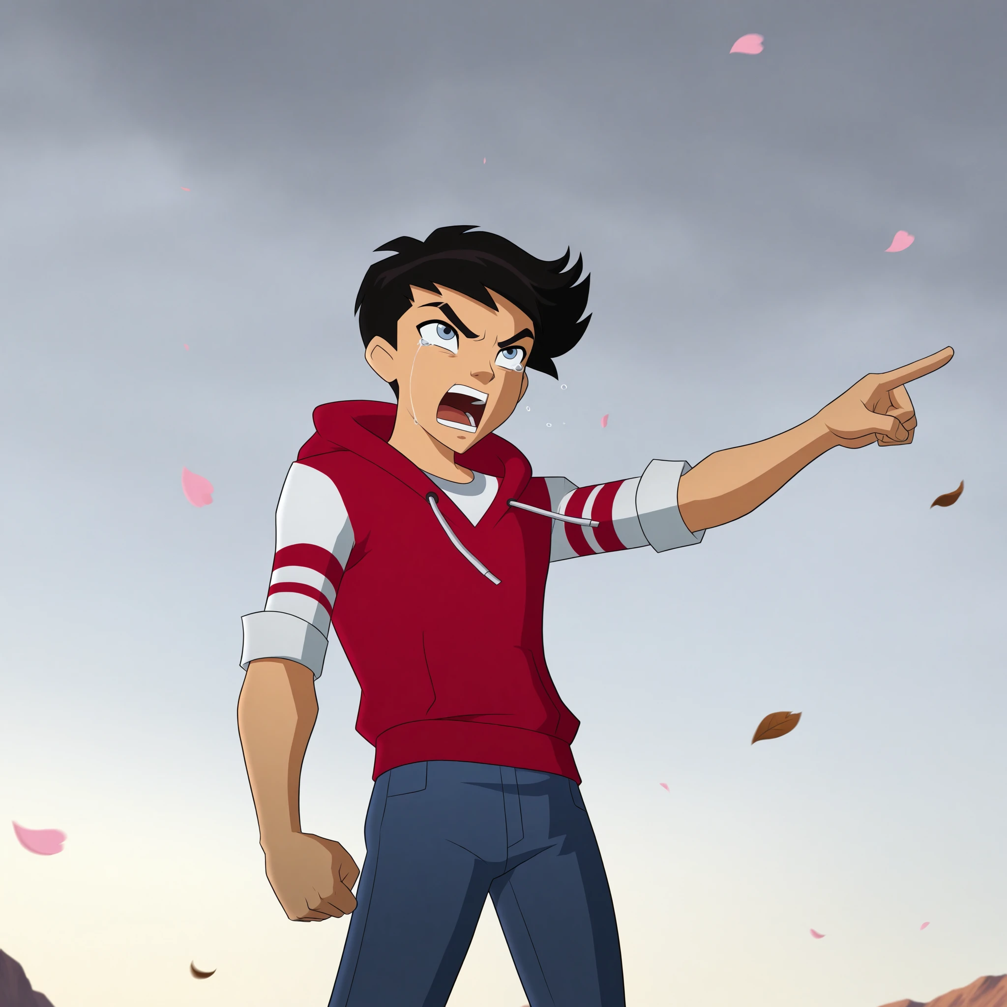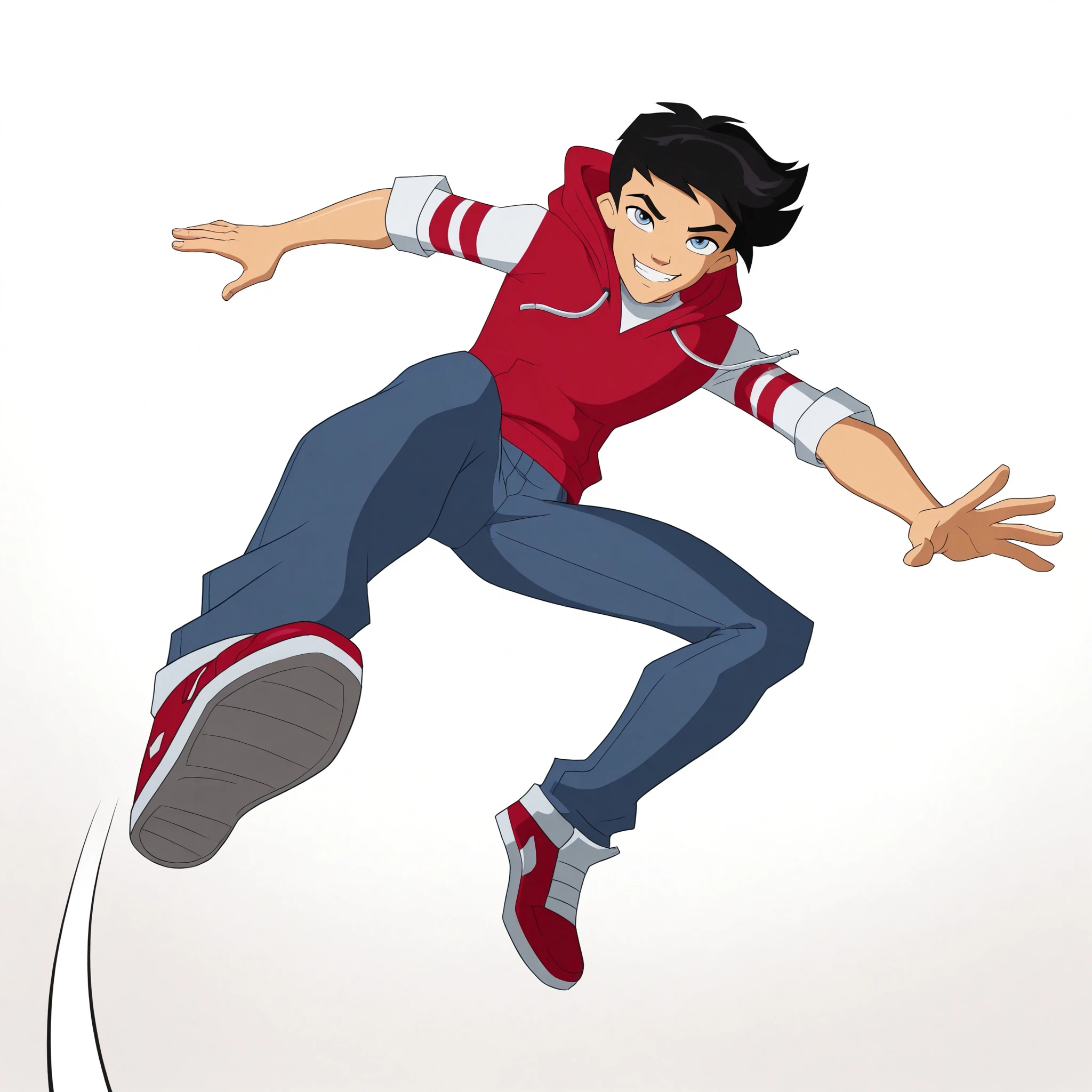 1boy, male focus, Leo_Walker, light blue eyes, black hair, short hair, white shirt, rolled sleeves, red hooded vest, blue jeans, white and red shoes