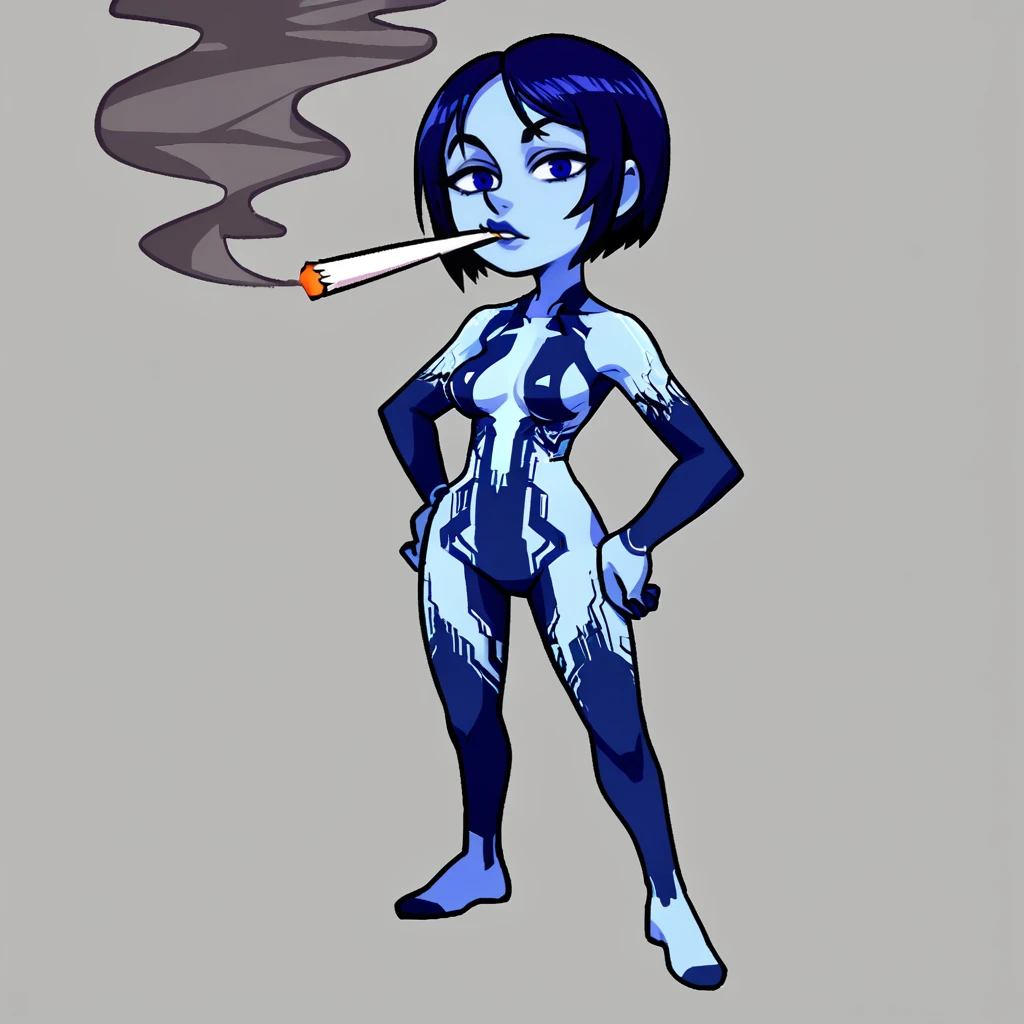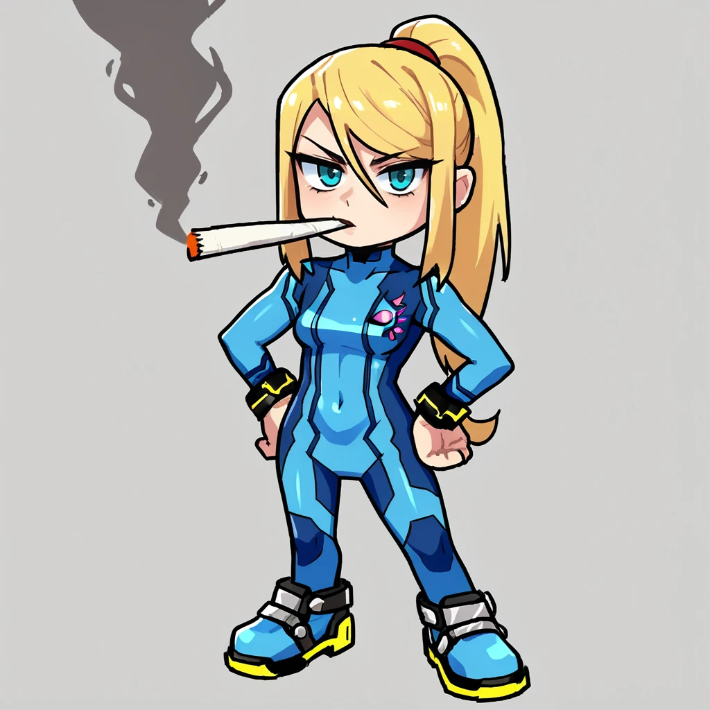 Optional: full body, standing, chibi, looking at viewer, hands on own hips, cigarette, smoke