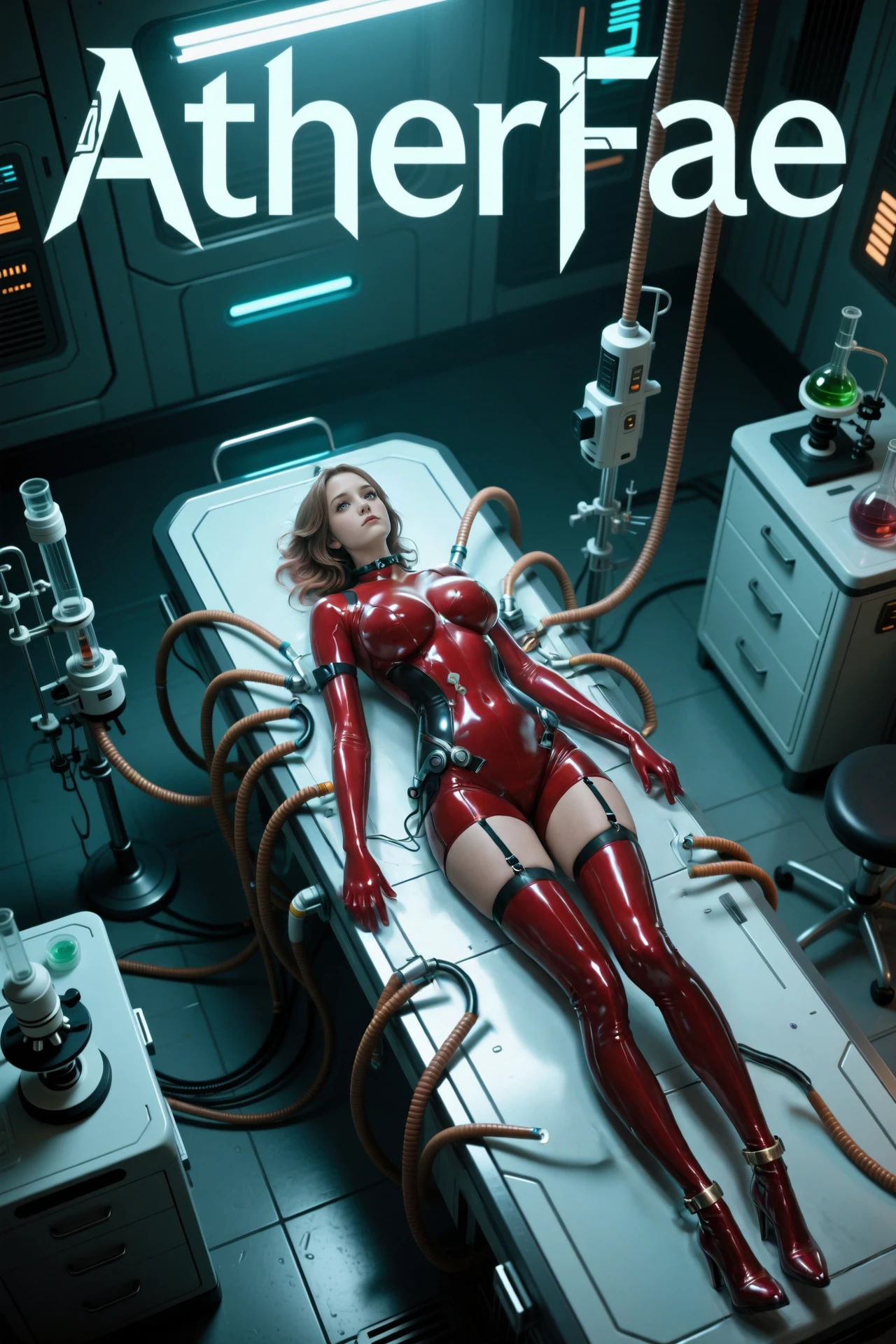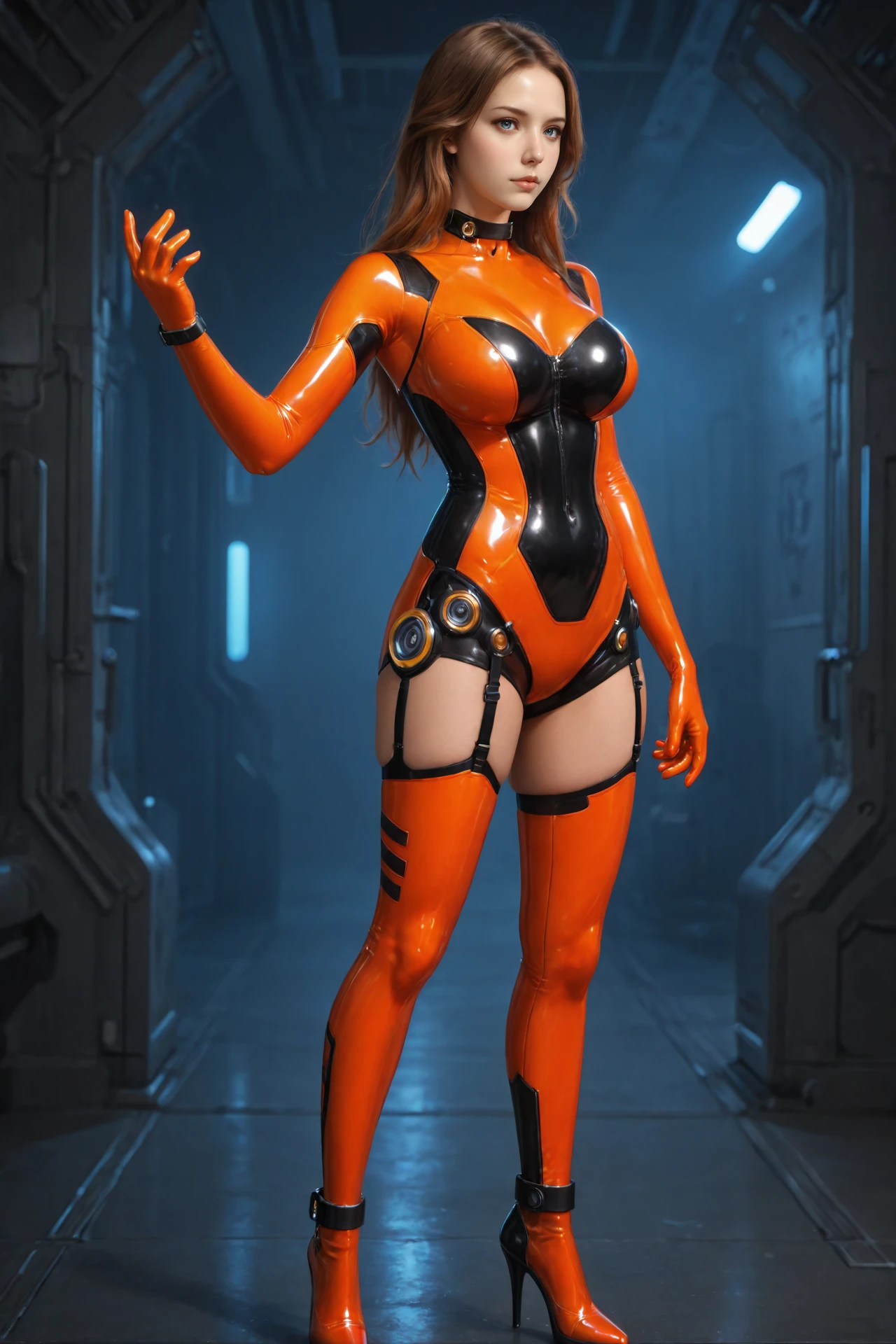 collar,latex bodysuit,elbow gloves,garter straps,thighhighs,anklet,boots, large breasts,high heels,