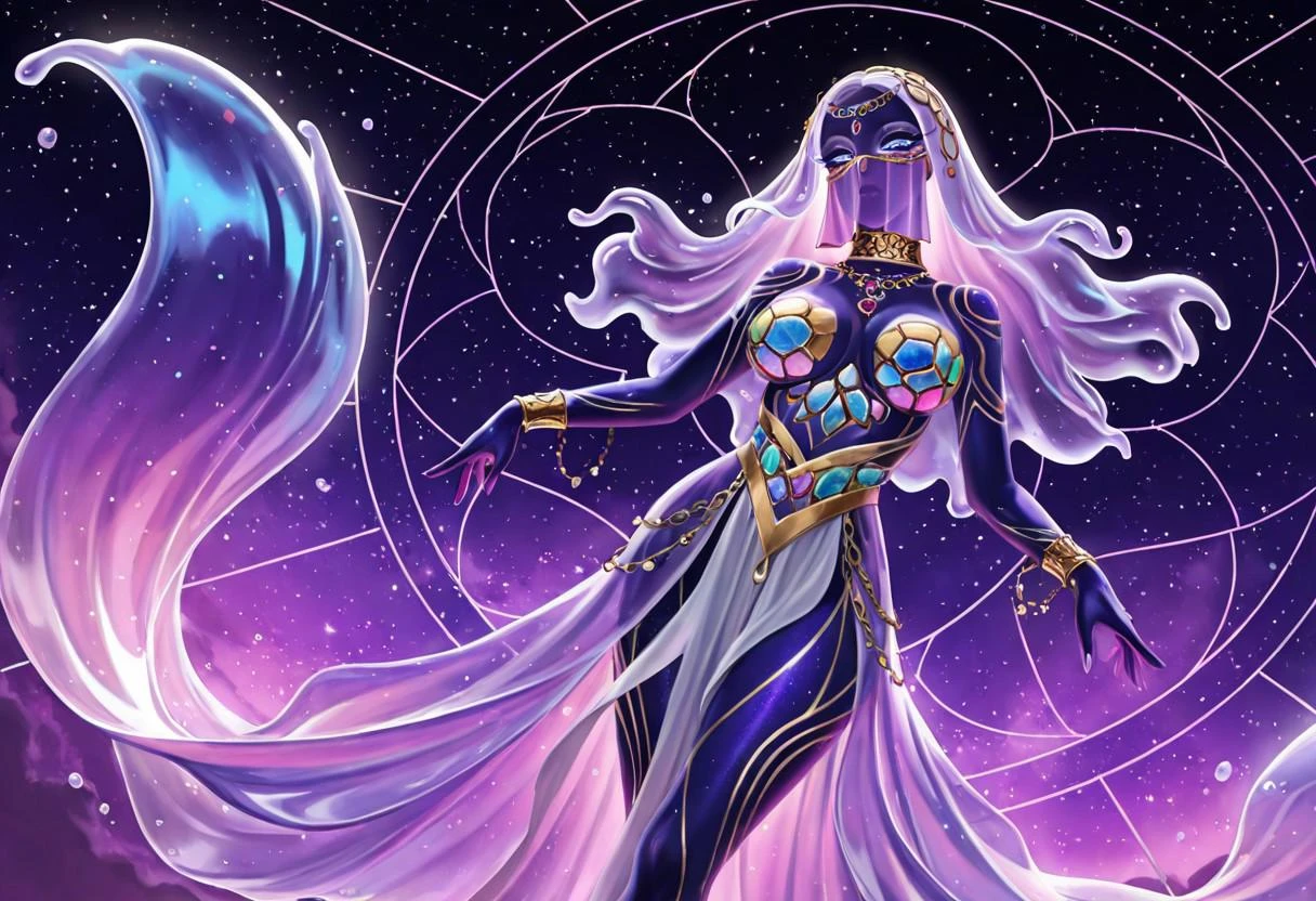 First I thought of fabric. Humans shrouded/veiled or hooded in it can sorta look like they have hair, even when you can't see their actual hair at all, like in many types of historical veiling, from medieval europe to the middle east. But then another solution gradually took shape in my head. The gorgeous, gelatinous forms that you will also see in my lora, combined with the more fabric-like look of some of the veils. Now this was all happening in my writer's head as I was coming up with a species for a project of mine, and said species gradually acquired many traits that both explained and, in turn, changed their appearance as I thought about them. This is the product of many months of me attempting to capture at least some facet of their somewhat nebulous(no pun intended) concept in art-format.