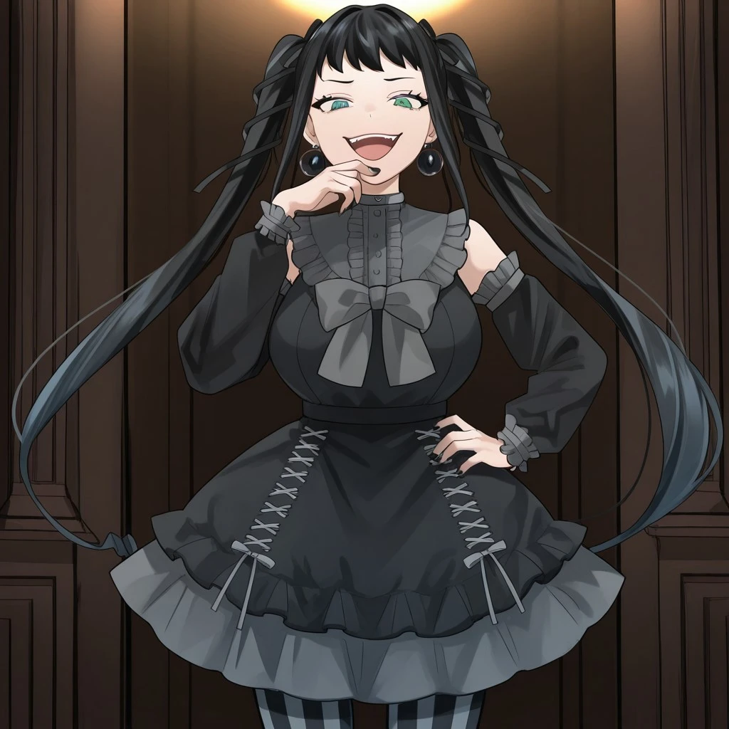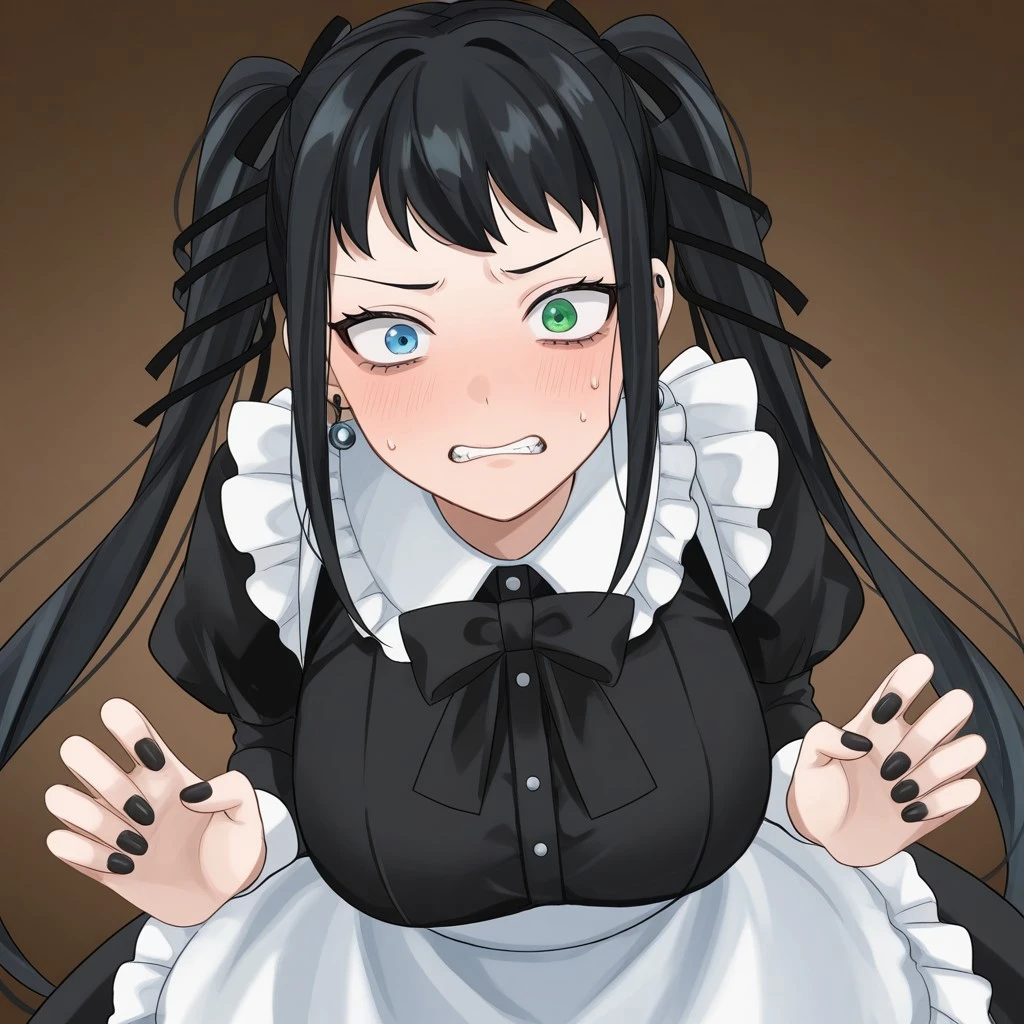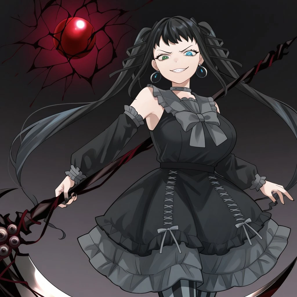 Character: 1girl, heterochromia, blue eye, green eye, long hair, black hair, twintails, large breasts, black hair ribbons, earrings, black nail polish,