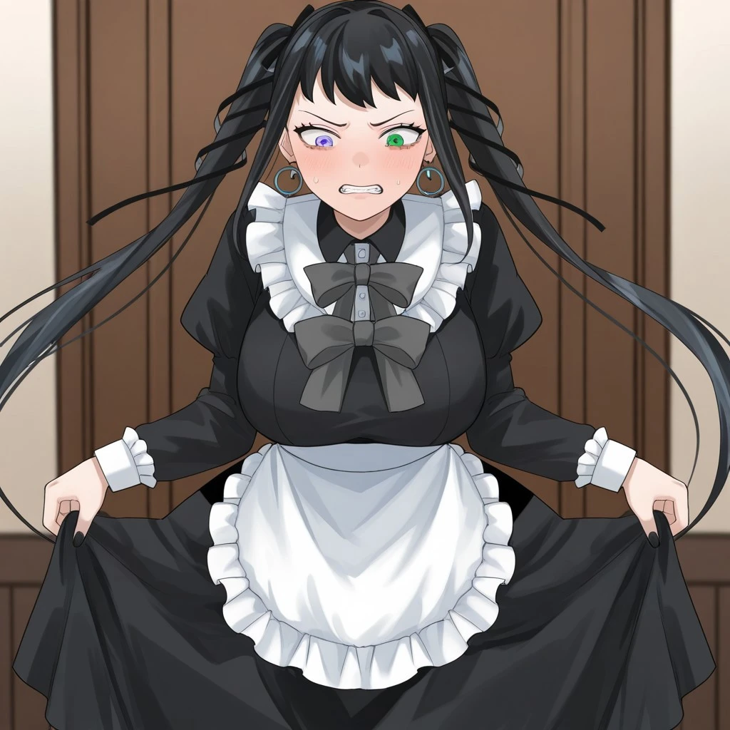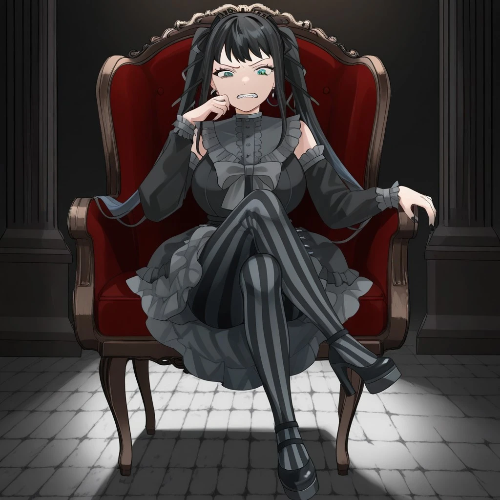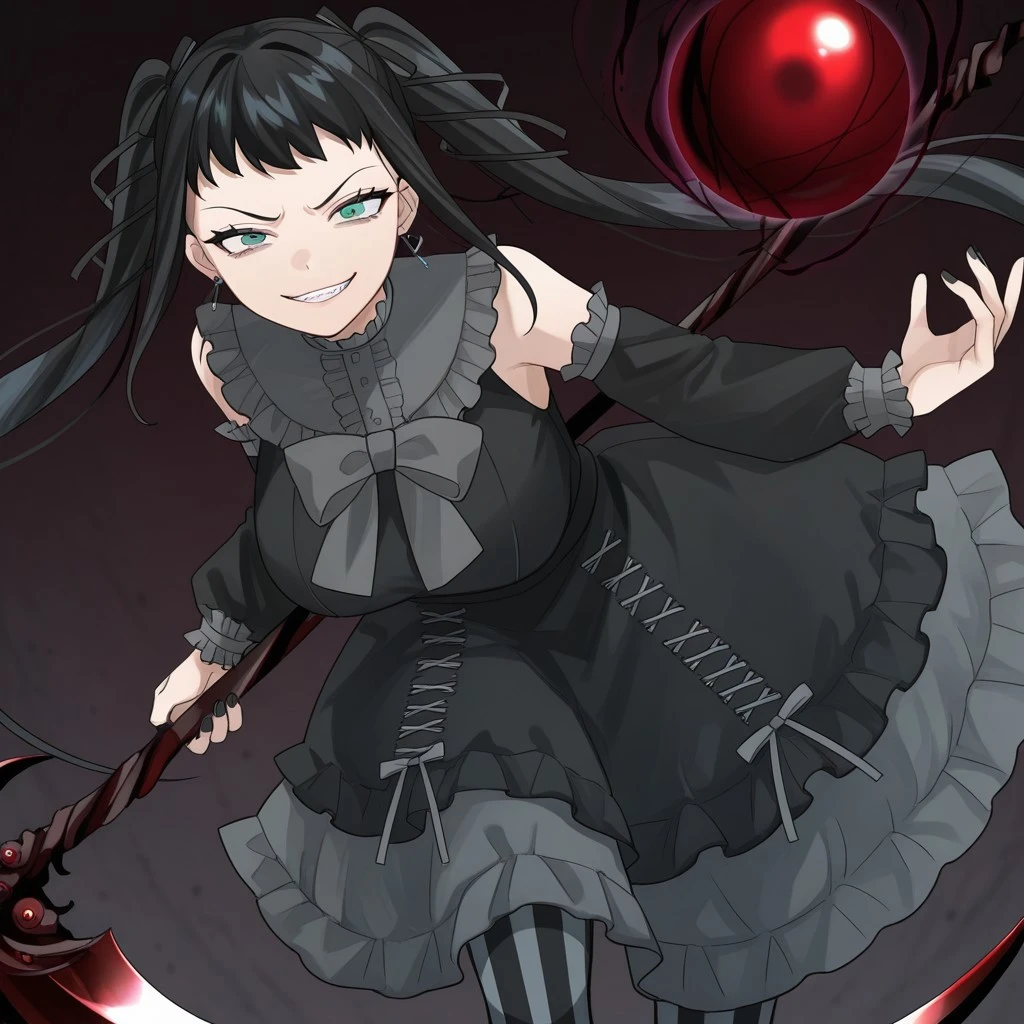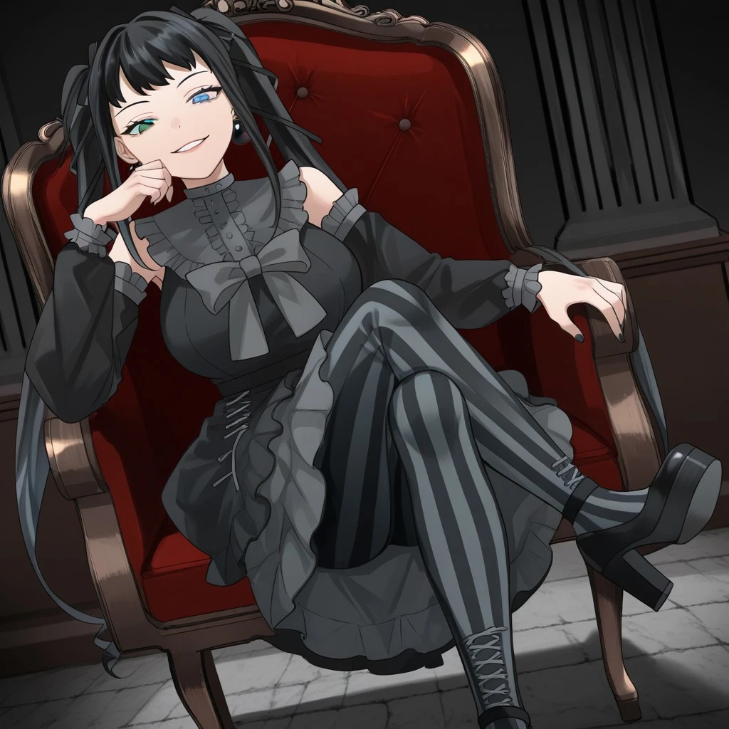Character: 1girl, heterochromia, blue eye, green eye, long hair, black hair, twintails, large breasts, black hair ribbons, earrings, black nail polish,