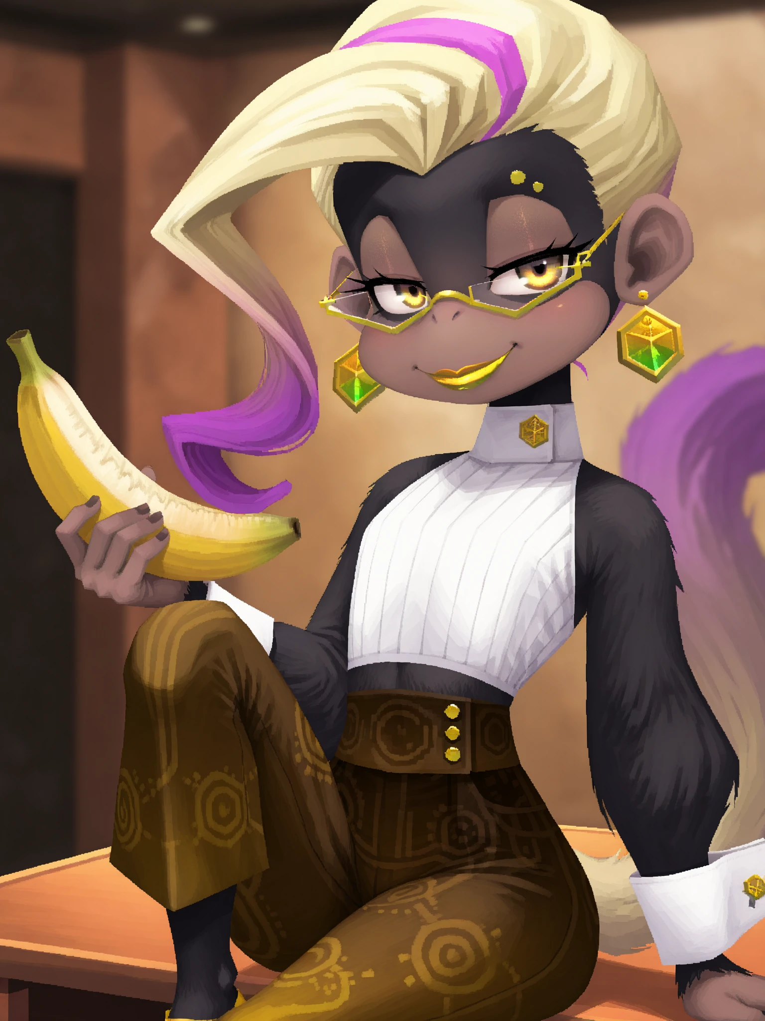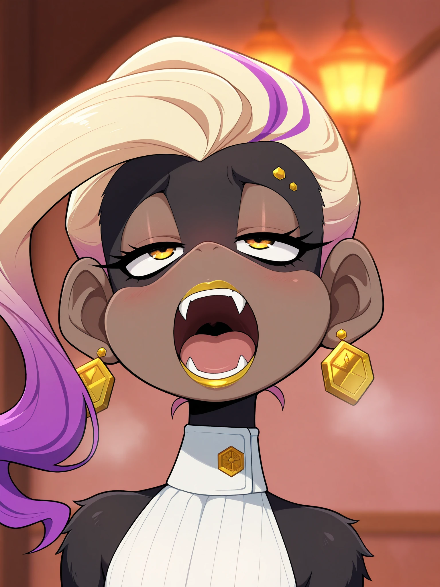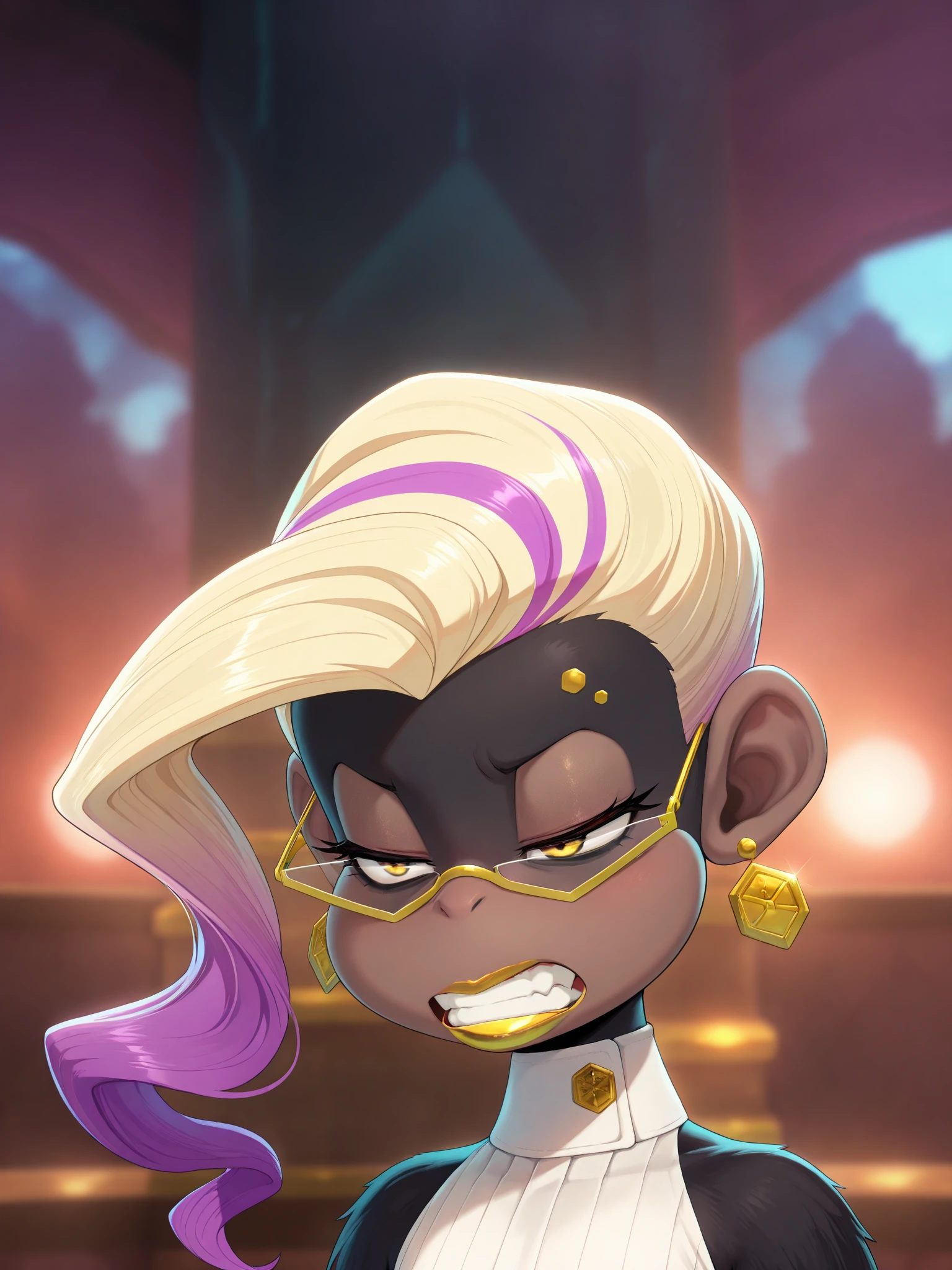poppykongllustrious, blonde hair, jewelry, yellow eyes, purple hair, multicolored hair, earrings, dark skin, dark-skinned female, gradient hair, makeup, colored skin, lipstick, asymmetrical hair, very dark skin, gold lipstick, monkey girl, furry, furry female, anthro, ape