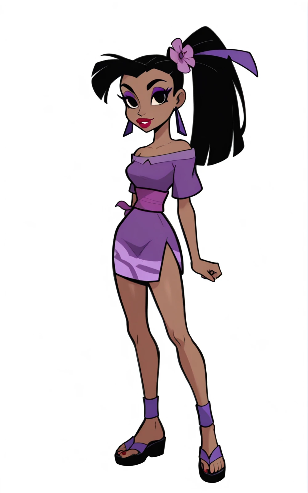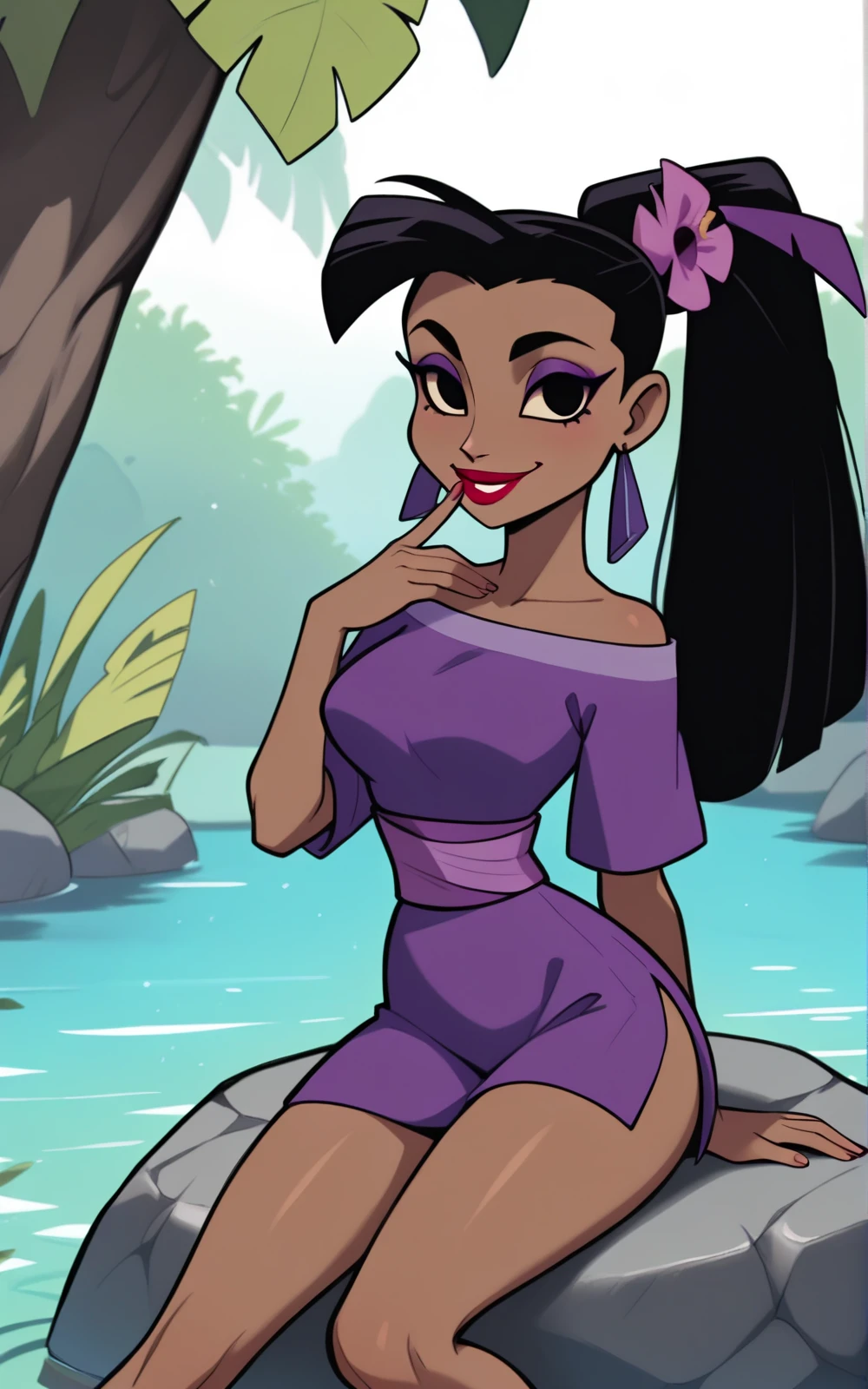 Reinforcement Tags: black hair, ponytail, black eyes, dark skin, dark-skinned female, makeup, red lips, hair flower