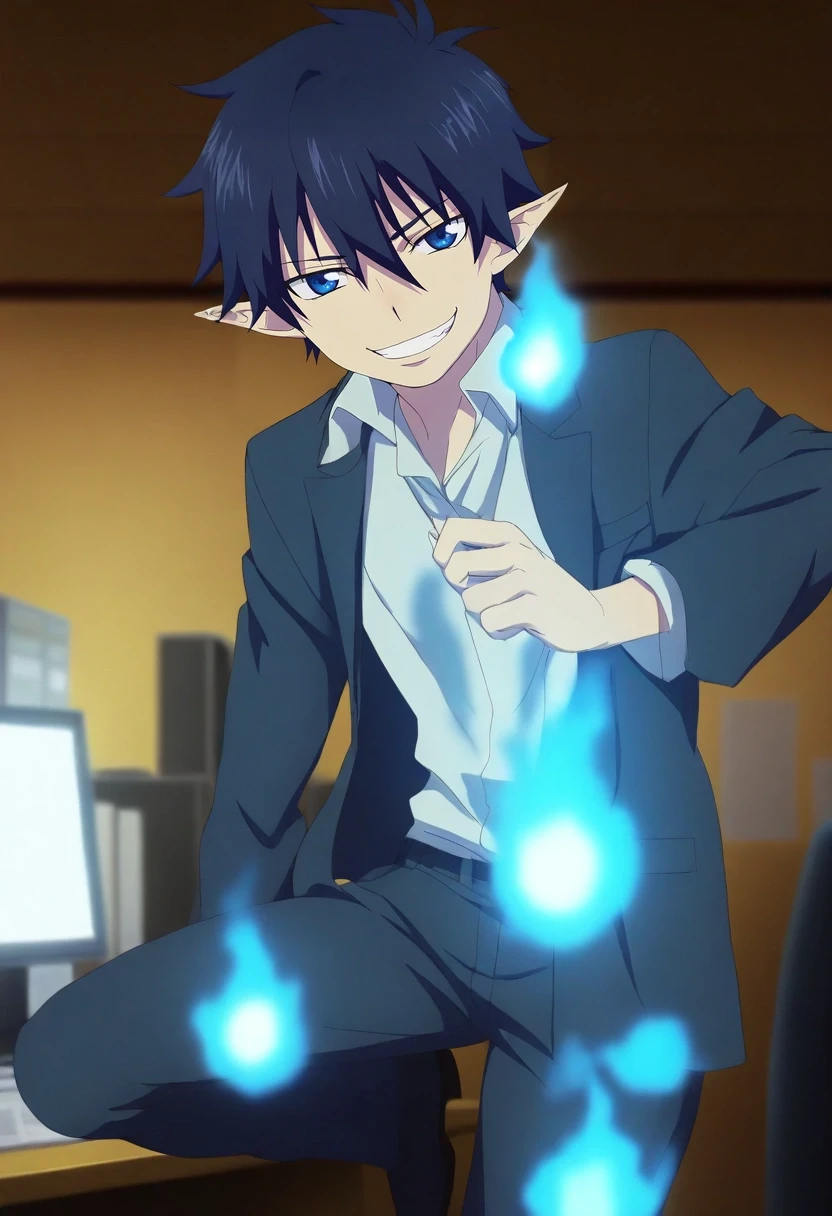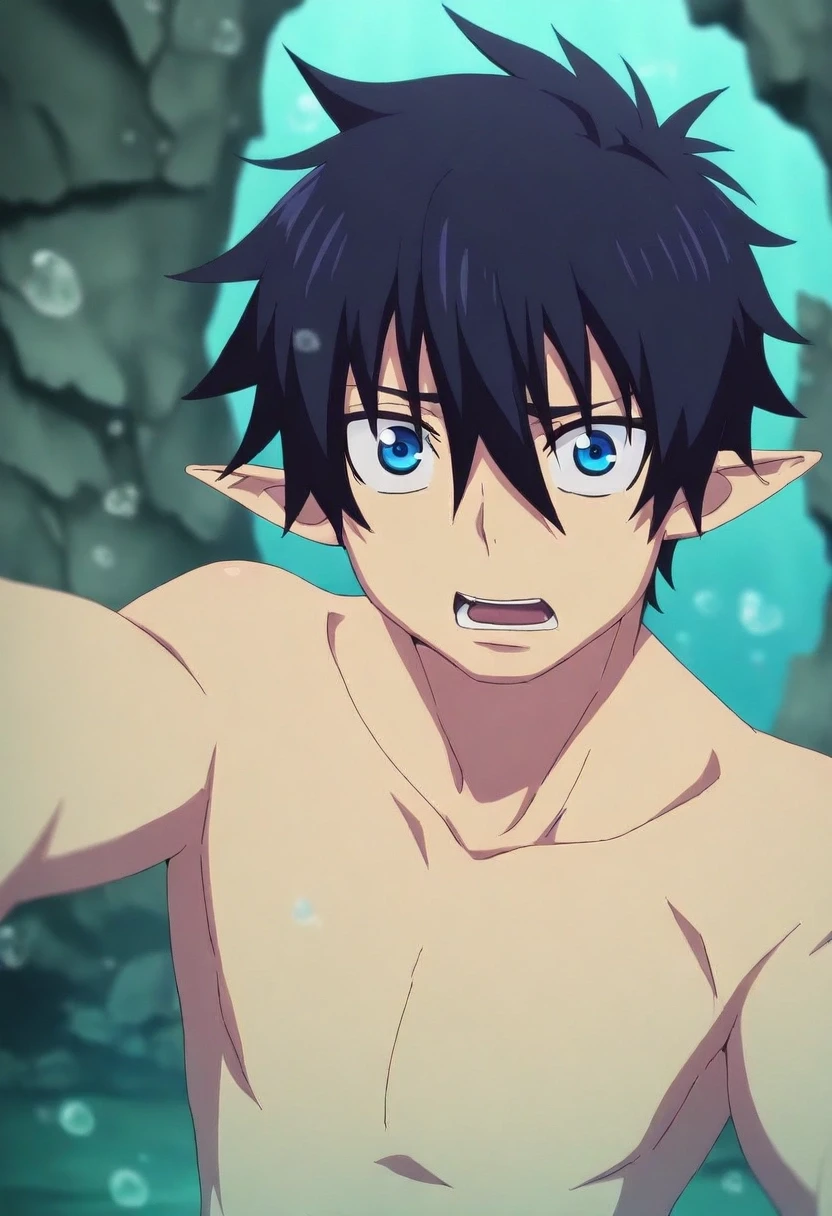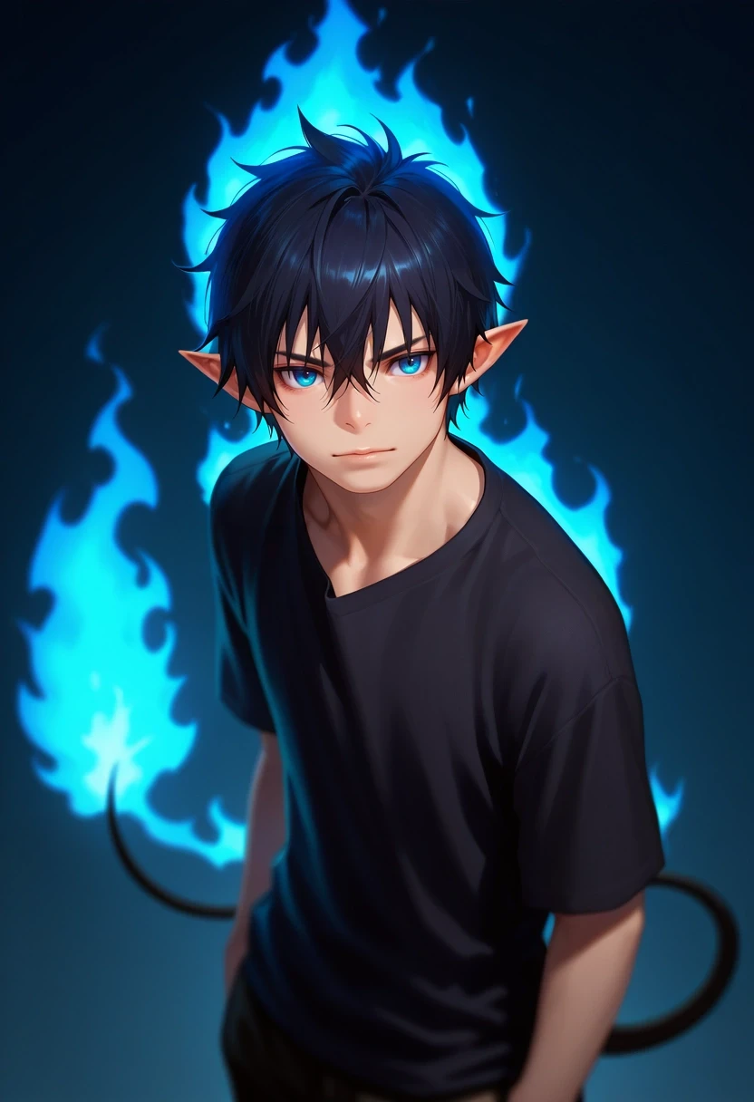 rin_okumura, black hair, blue eyes, short hair, pointy ears, hair between eyes
